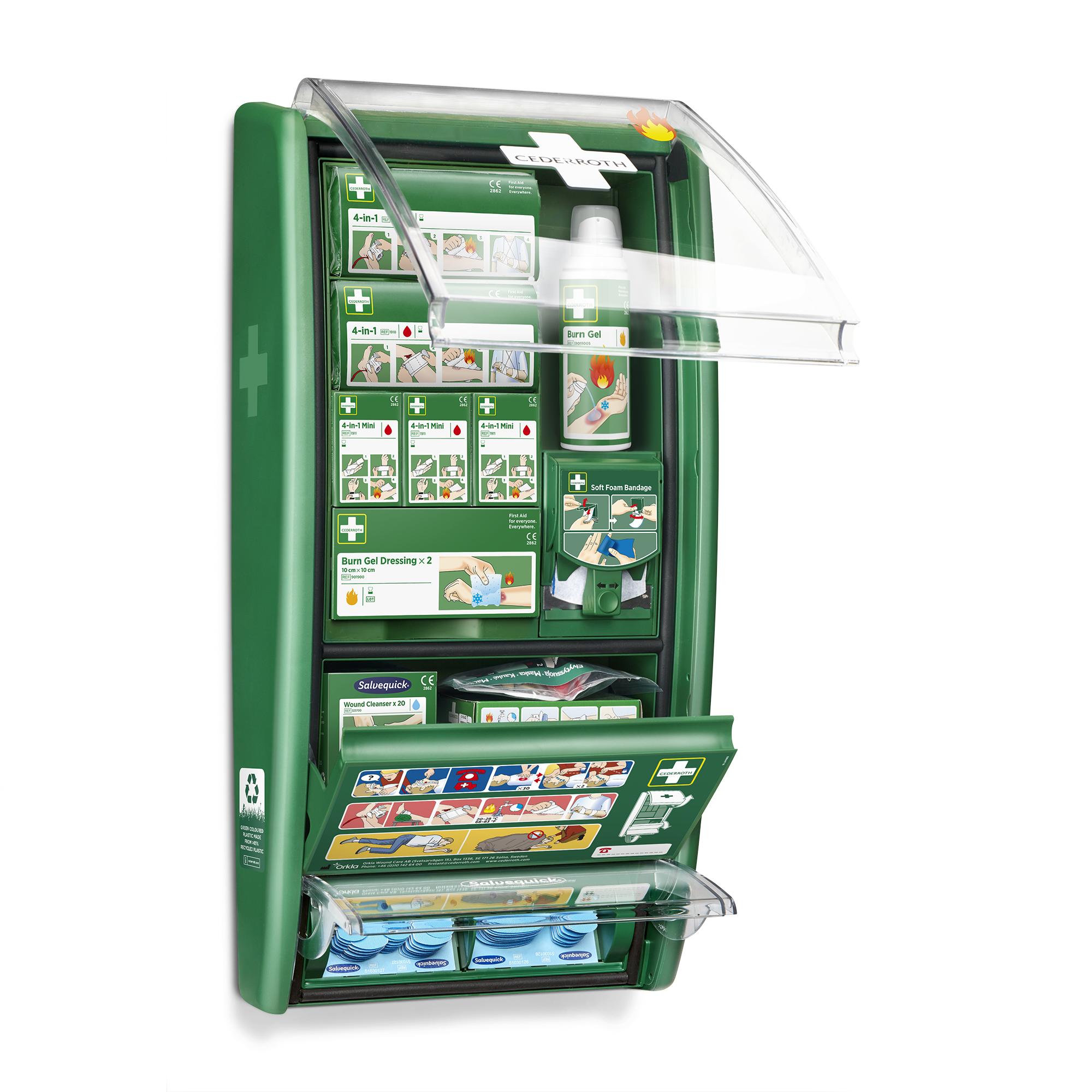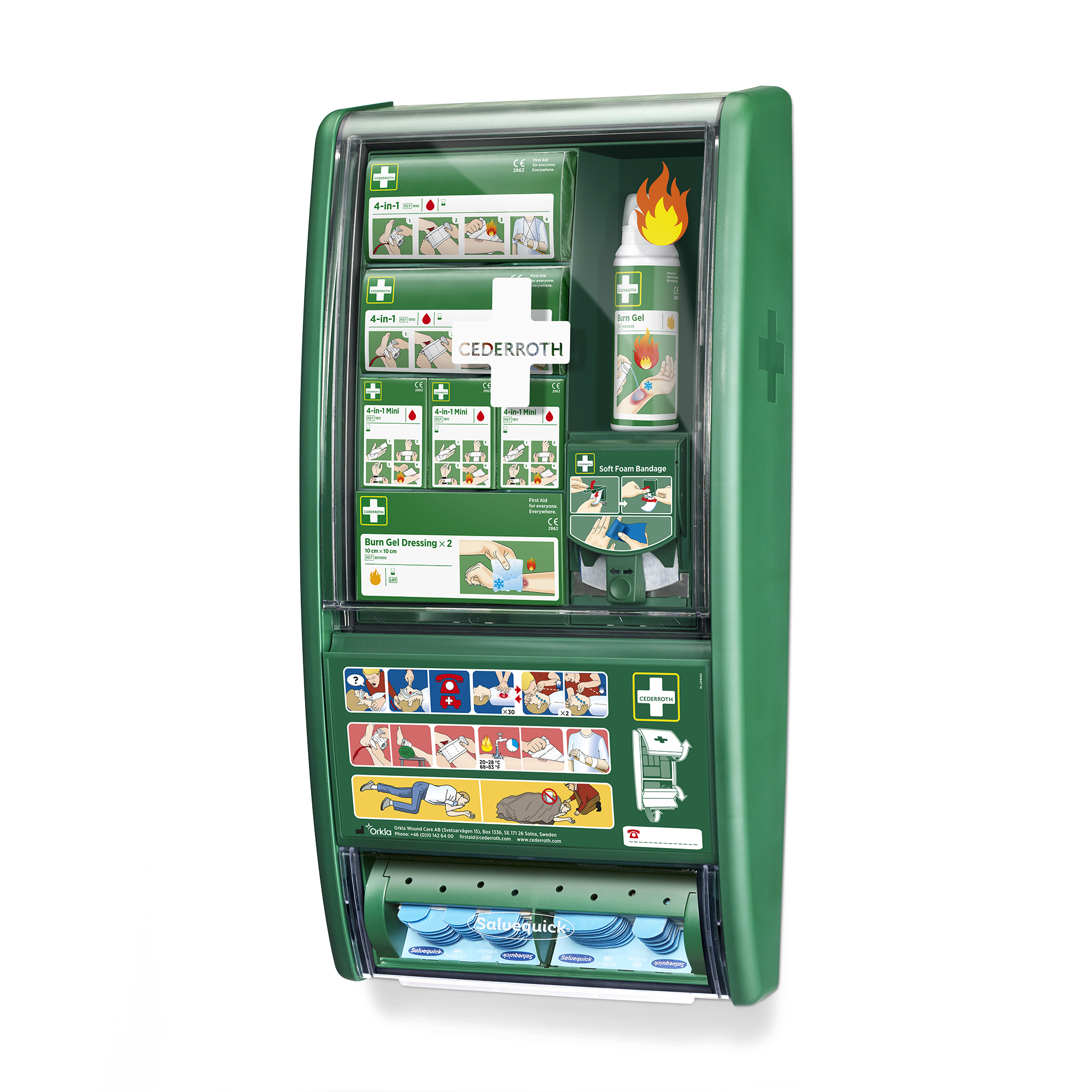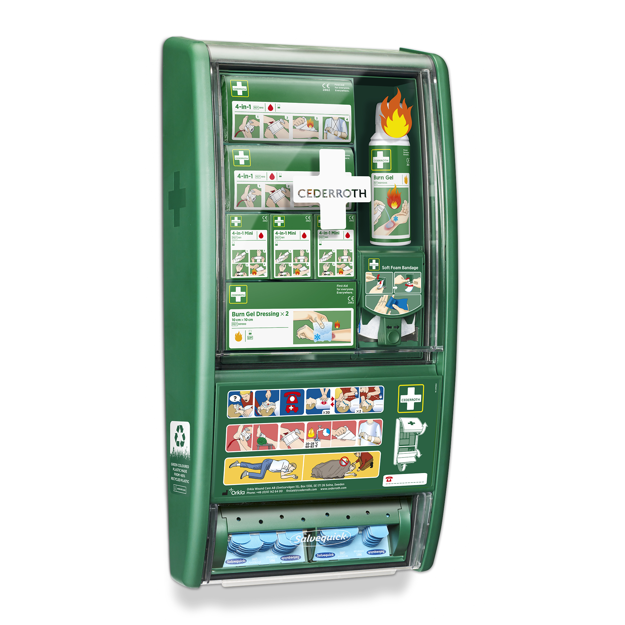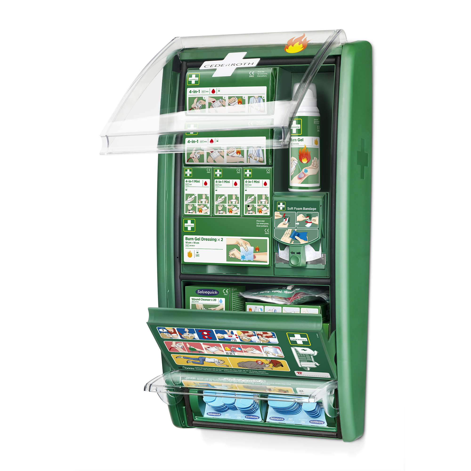 Førstehjælpsstation til arbejdspladser, hvor der er risiko for forbrændinger, og/eller som håndterer fødevarer, f.eks. storkøkkener, fødevareindustrien og værksteder. Med Cederroth Burn Gel 100 ml. Indeholder også Soft Foam Blue, et selvklæbende limfrit plaster, der bliver siddende på selv i vand. Blå detekterbare plastre og brandsårsprodukter i form af kompresser, spray og plastre. Indhold: 2 Cederroth 4-i-1 Blodstoppere (REF 1910) 3 Cederroth 4-i-1 mini Blodstoppere (REF 1911) 1 (x 2) Cederroth Burn Gel Dressing (REF 901900) 1 Cederroth Burn Gel, 100 ml (REF 51011005) 1 Cederroth Soft Foam Dispenser inkl. Soft Foam Blue 2 meter x 6 cm (REF 51011011) 1 æske Burn Cover, 10 stk. (REF 901903) 1 Salvequick Plasterautomat inkl. Blue Detectable plastre, (35 regular REF 51030127) og 30 regular/fingerspids REF 51030126) 1 (x 20) Salvequick Sårrens (REF 323700) 1 Åndedrætsmaske (REF 1921), 1 Førstehjælpsinstruktion 1 refill-nøgle 1 boreskabelon Plasten i Cederroth Førstehjælpsstationer og -dispensere er fra sommeren 2025 lavet af >92 % genbrugsplast.