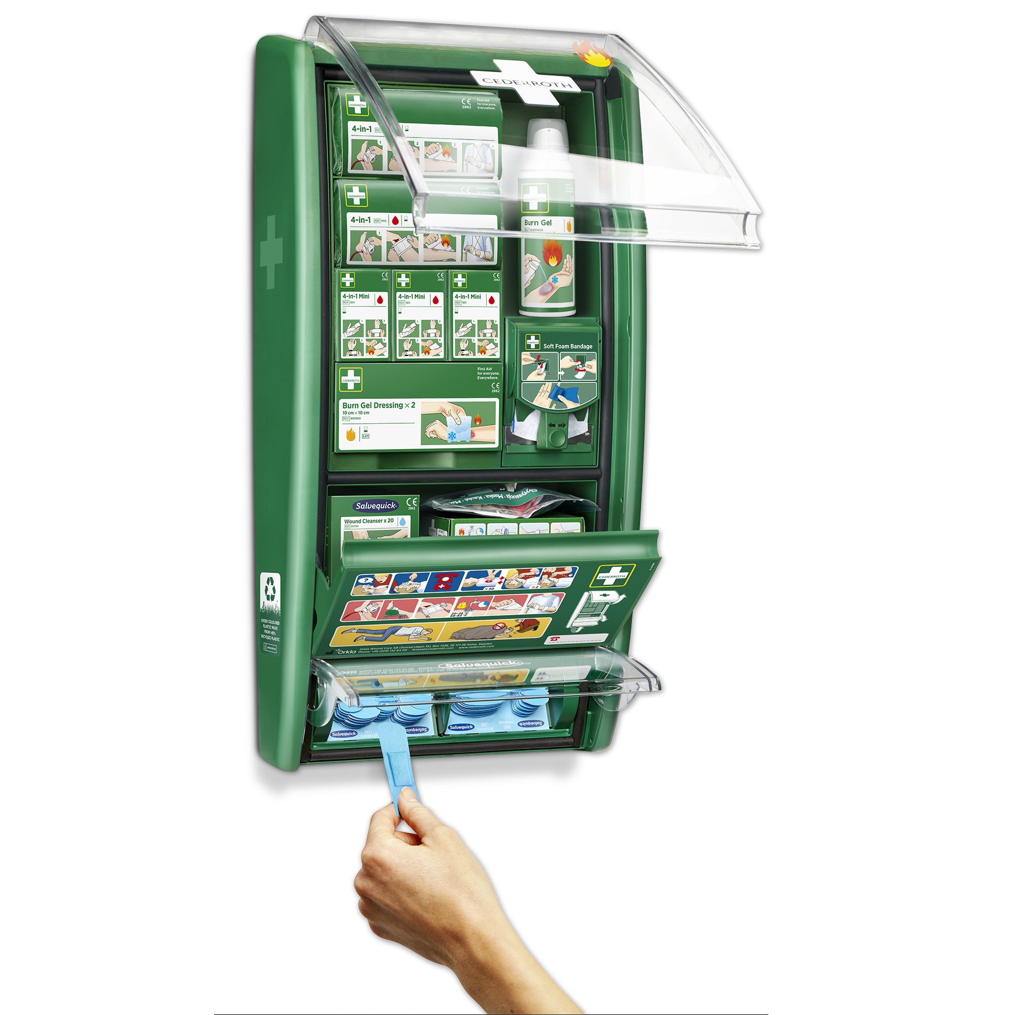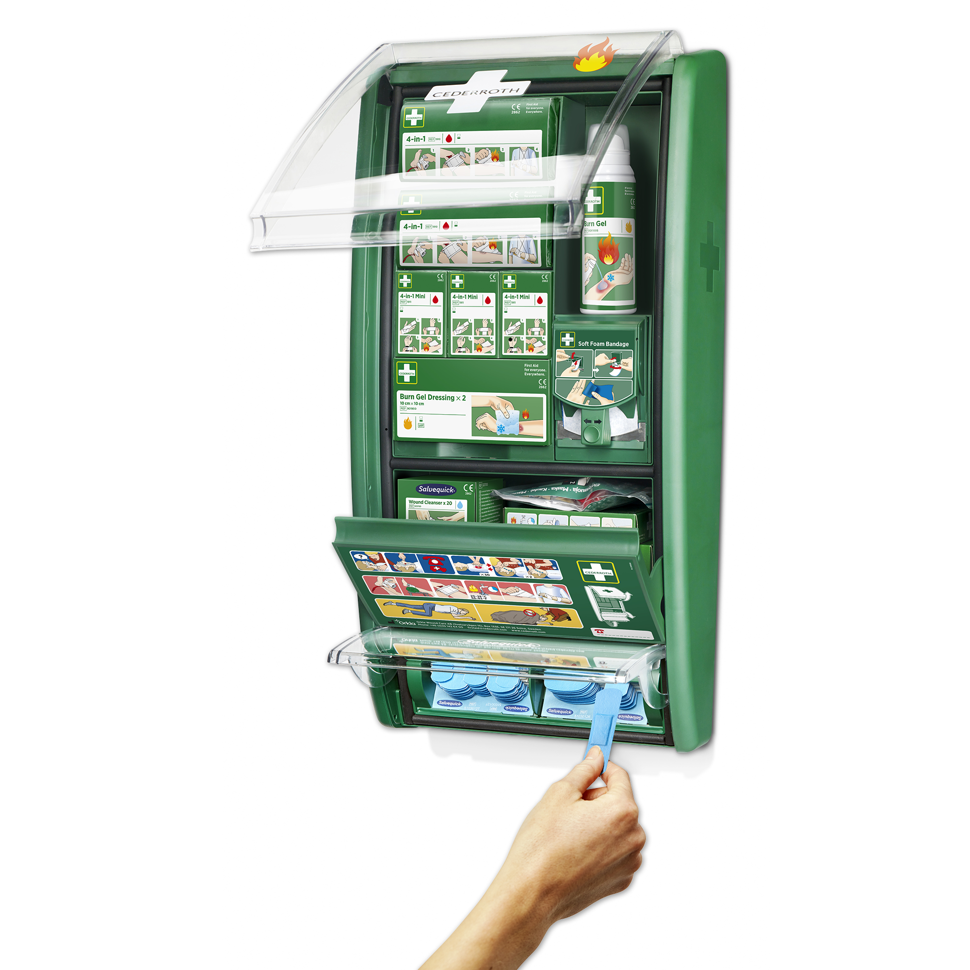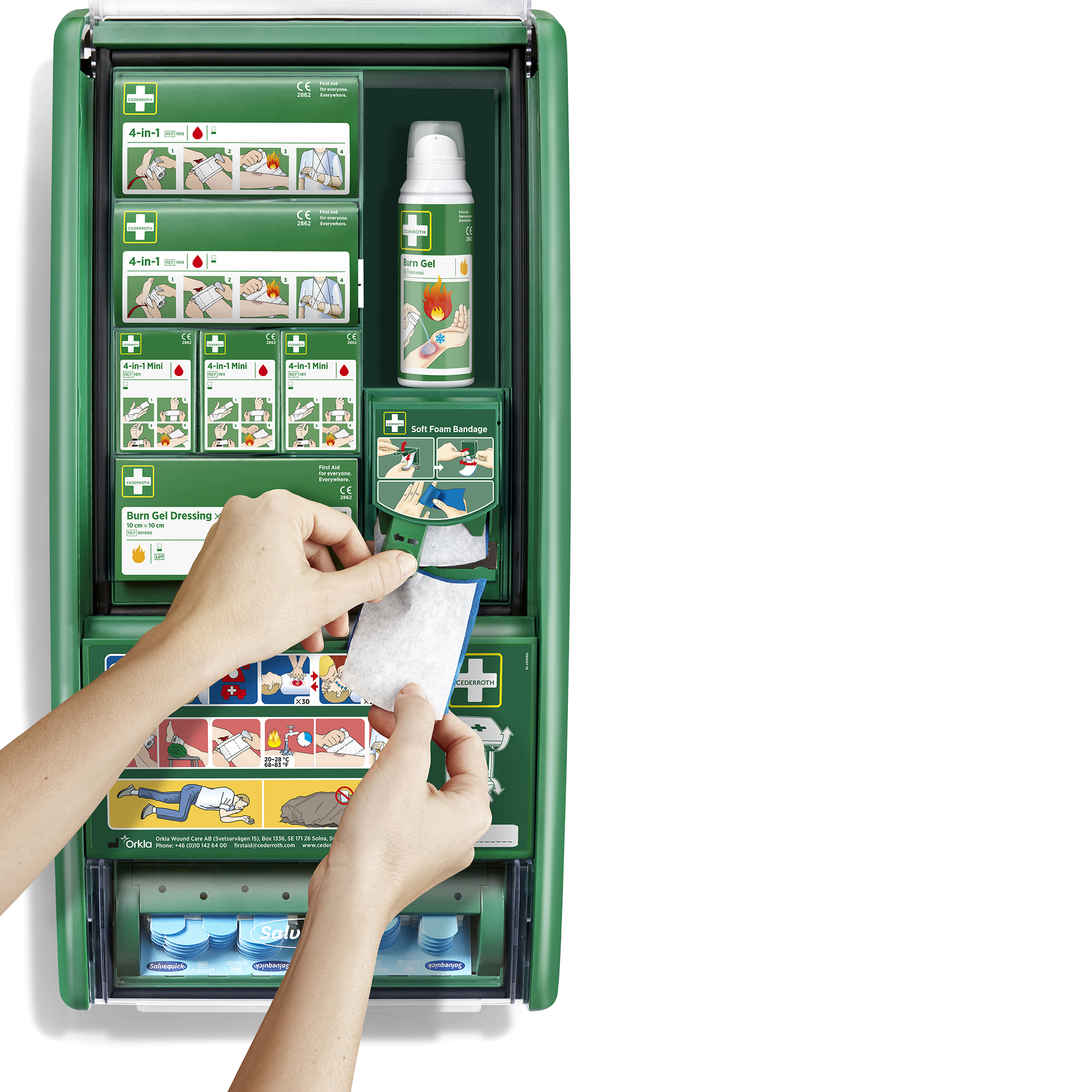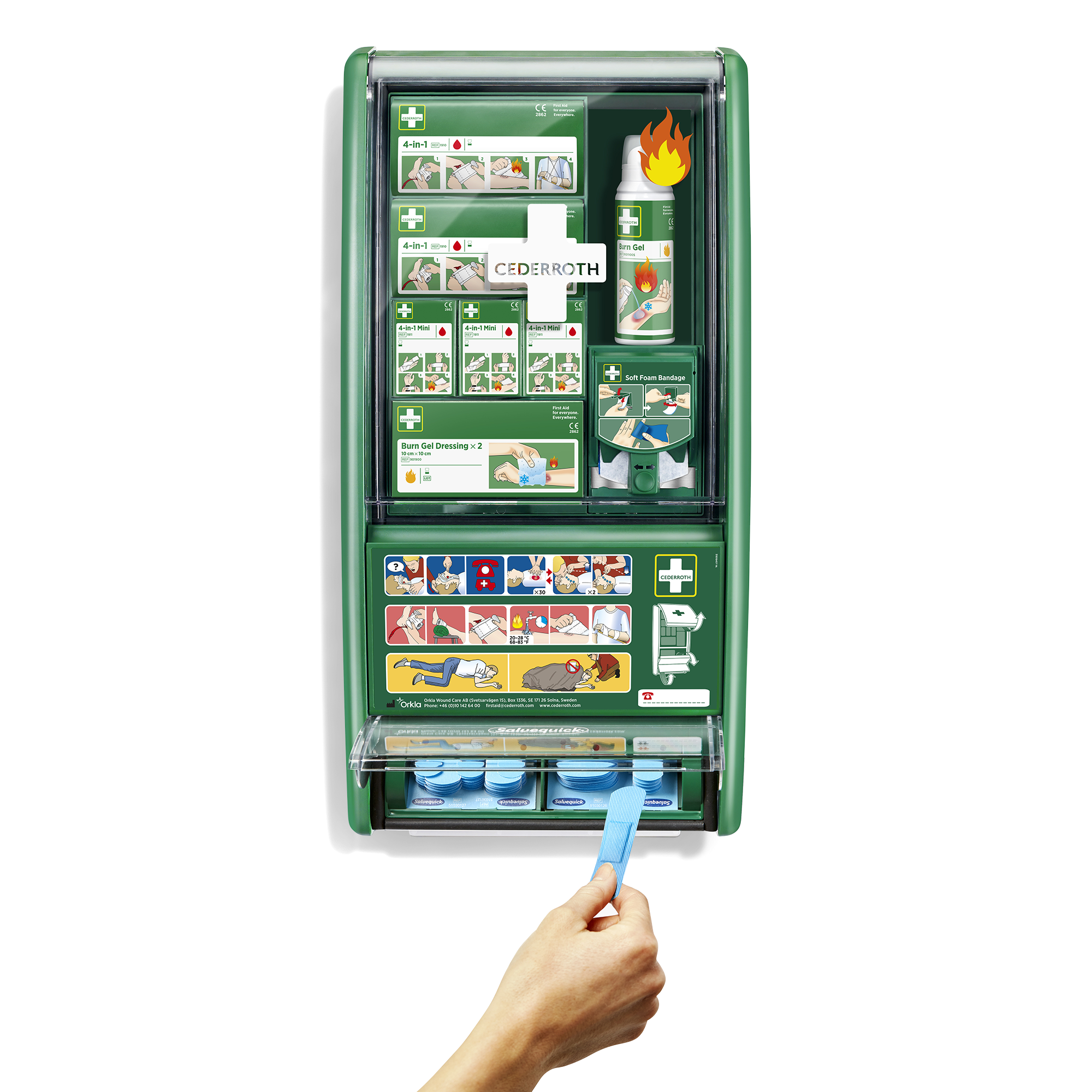 Førstehjælpsstation til arbejdspladser, hvor der er risiko for forbrændinger, og/eller som håndterer fødevarer, f.eks. storkøkkener, fødevareindustrien og værksteder. Med Cederroth Burn Gel 100 ml. Indeholder også Soft Foam Blue, et selvklæbende limfrit plaster, der bliver siddende på selv i vand. Blå detekterbare plastre og brandsårsprodukter i form af kompresser, spray og plastre. Indhold: 2 Cederroth 4-i-1 Blodstoppere (REF 1910) 3 Cederroth 4-i-1 mini Blodstoppere (REF 1911) 1 (x 2) Cederroth Burn Gel Dressing (REF 901900) 1 Cederroth Burn Gel, 100 ml (REF 51011005) 1 Cederroth Soft Foam Dispenser inkl. Soft Foam Blue 2 meter x 6 cm (REF 51011011) 1 æske Burn Cover, 10 stk. (REF 901903) 1 Salvequick Plasterautomat inkl. Blue Detectable plastre, (35 regular REF 51030127) og 30 regular/fingerspids REF 51030126) 1 (x 20) Salvequick Sårrens (REF 323700) 1 Åndedrætsmaske (REF 1921), 1 Førstehjælpsinstruktion 1 refill-nøgle 1 boreskabelon Plasten i Cederroth Førstehjælpsstationer og -dispensere er fra sommeren 2025 lavet af >92 % genbrugsplast.