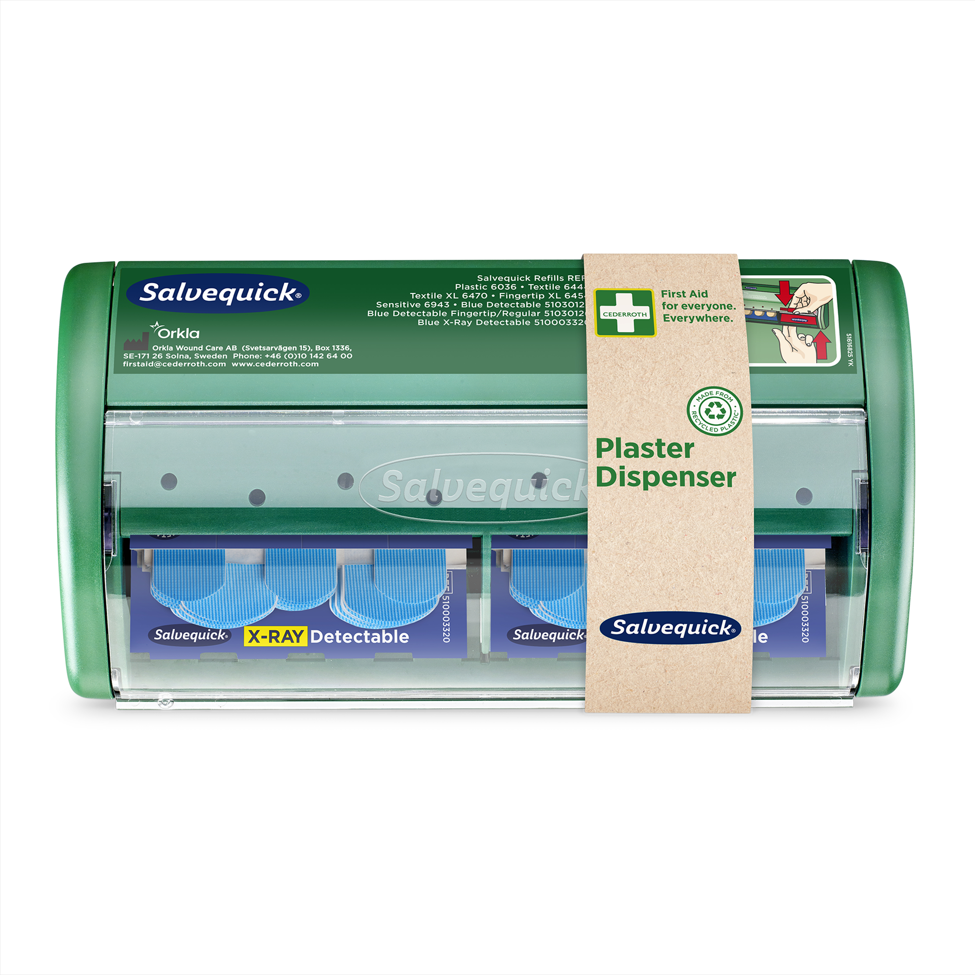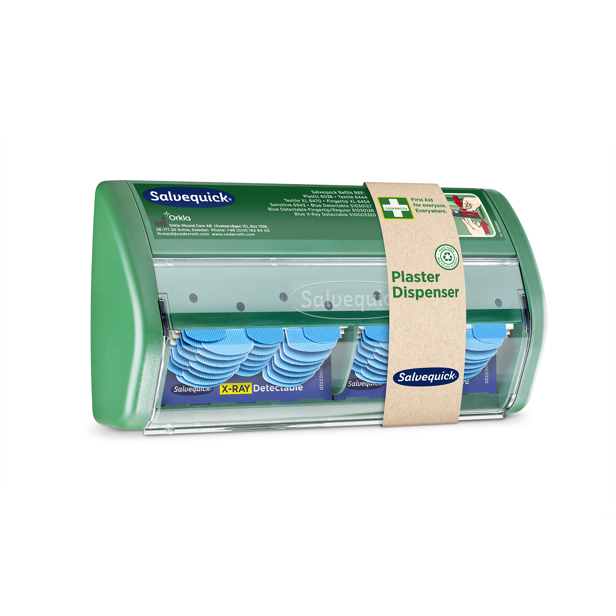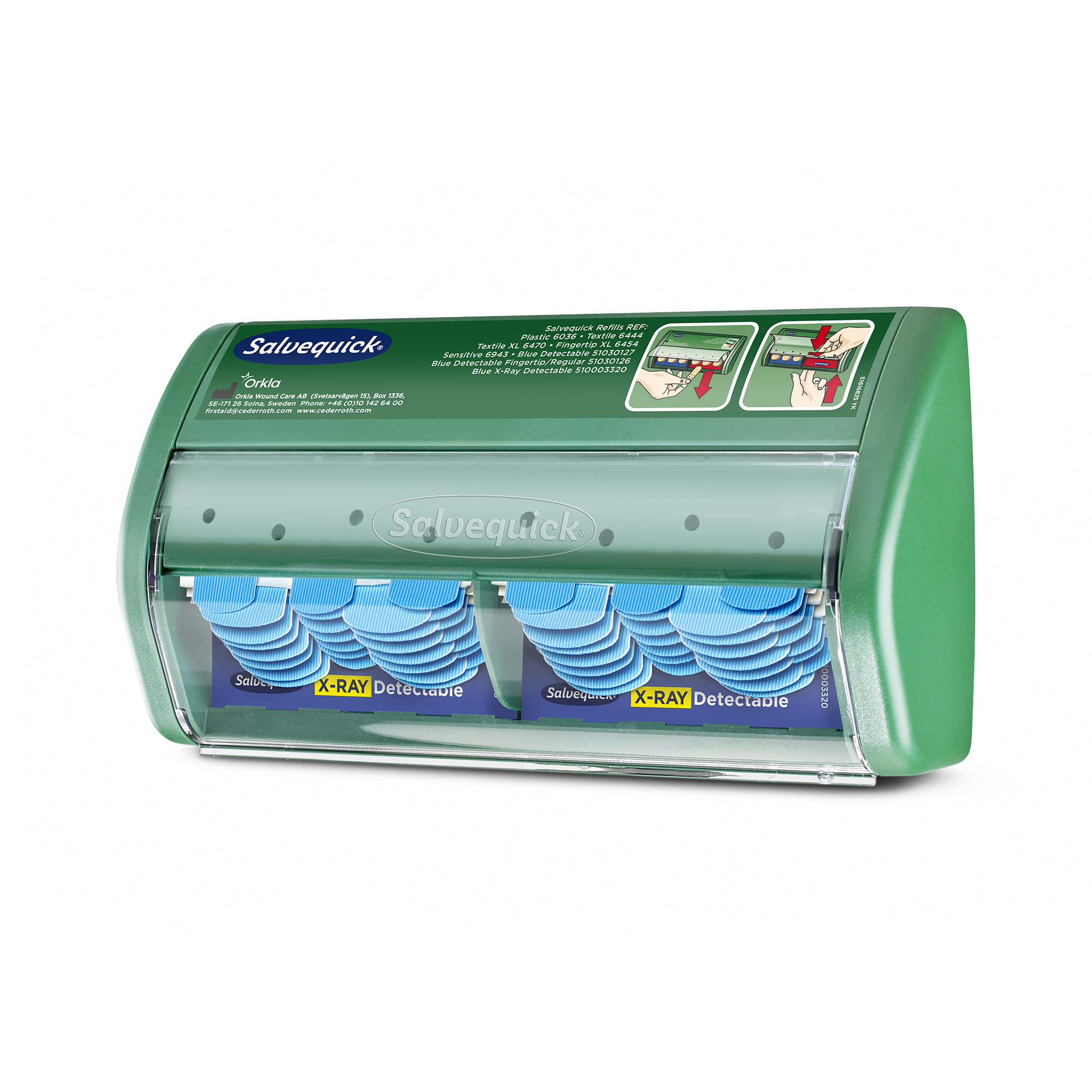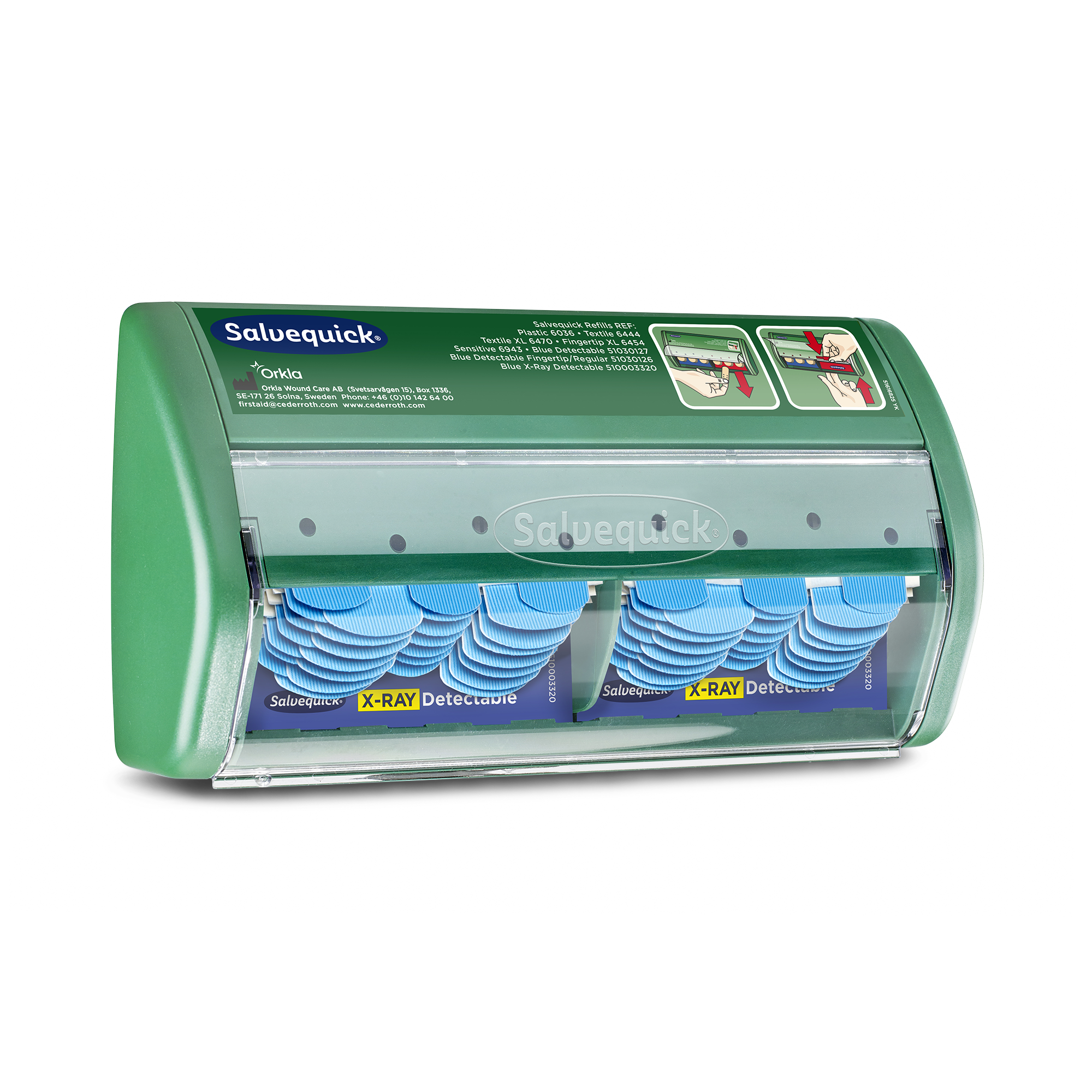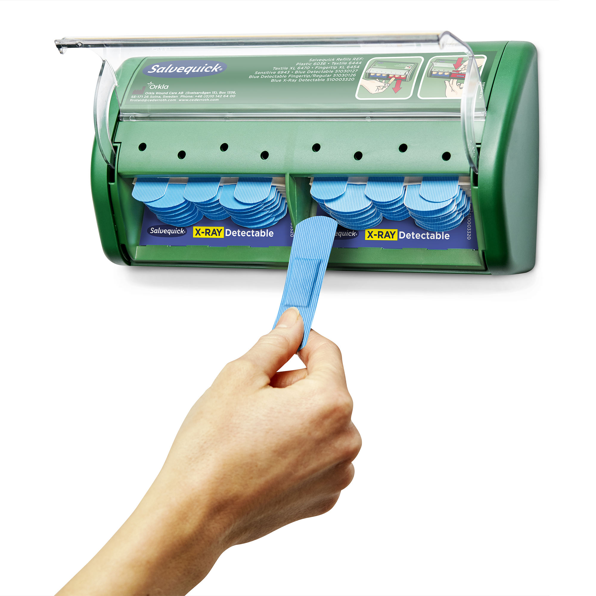 Salvequick Plasterautomat X-Ray Detectable med blå røntgen- og metaldetekterbare plastre er specielt beregnet til brug i fødevareindustrien. Giver hurtig og nem adgang til plastre. Plastrene er synlige og rene, indtil de skal bruges.