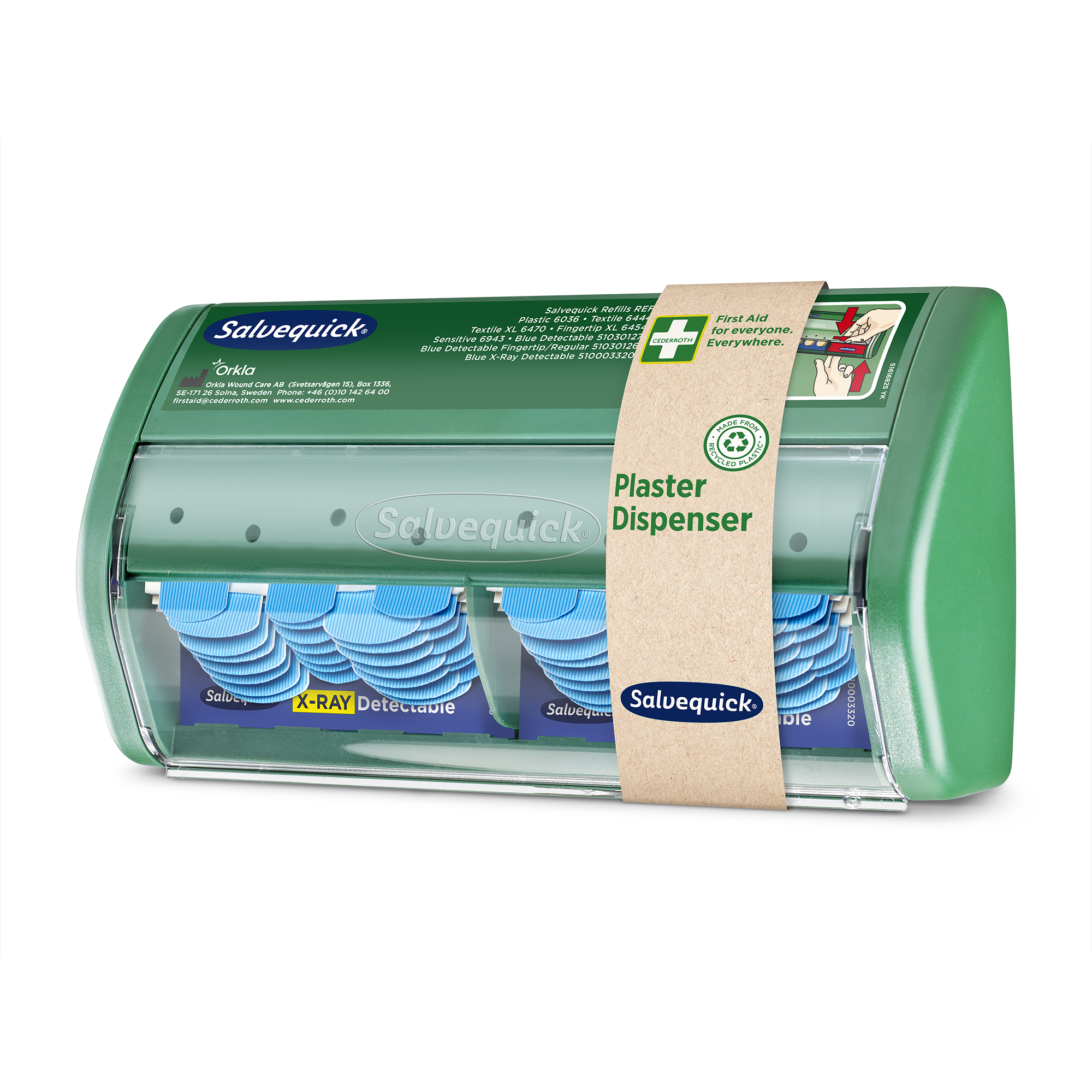 Salvequick Plasterautomat X-Ray Detectable med blå røntgen- og metaldetekterbare plastre er specielt beregnet til brug i fødevareindustrien. I Salvequick Plasterautomaten trækkes plastrene nedad. På den måde undgår man at tilsmudse eller bløde på de andre plastre. Salvequick Plasterautomater og Plastre er et komplet og brugervenligt system. Plastrene er altid på plads, klar til brug. Refillerne er fastlåst, hvilket forhindrer spild, og åbnes nemt med en specialnøgle. Gennemsigtigt låg beskytter mod støv. Indhold: 2 x 30 X-Ray/Metal Detectable plastre. Hver refill indeholder 18 stk. 72x19 mm og 12 stk. 72x25 mm (REF 510003320) Plasten i Cederroths Førstehjælpsstationer og dispensere er fra sommeren 2025 lavet af >92 % genbrugsplast.