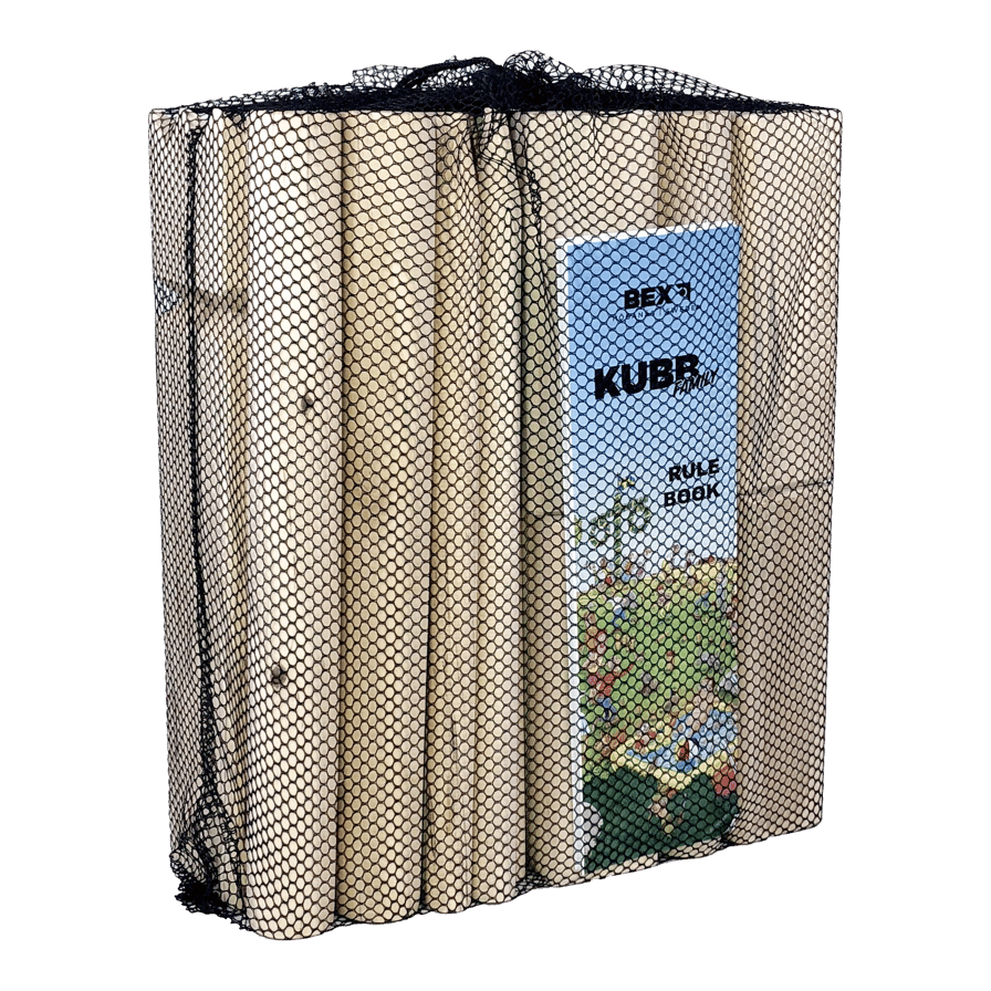 Basic kubbspil i birk – perfekt til begyndere. Indeholder konge, 6 kastepinde, 10 kubber, 4 markører, regler og netpose til opbevaring. Vægt 3,7 kg. Kan males i forskellige farver eller behandles med olie for længere holdbarhed.