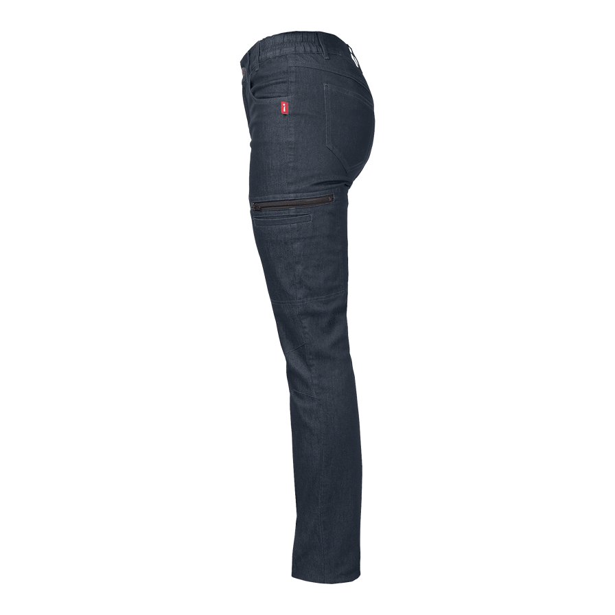 Forvaskede denimbukser i arbejderstil med stretch og god pasform. Udstyret med for- og baglommer, dobbelt benlomme med lynlås, mobillomme, kuglepenslomme og fast linning med elastik i siderne og bæltestropper.