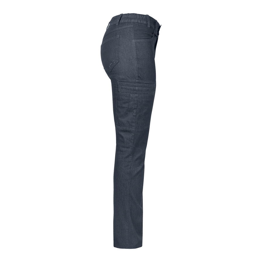 Forvaskede denimbukser i arbejderstil med stretch og god pasform. Udstyret med for- og baglommer, dobbelt benlomme med lynlås, mobillomme, kuglepenslomme og fast linning med elastik i siderne og bæltestropper.