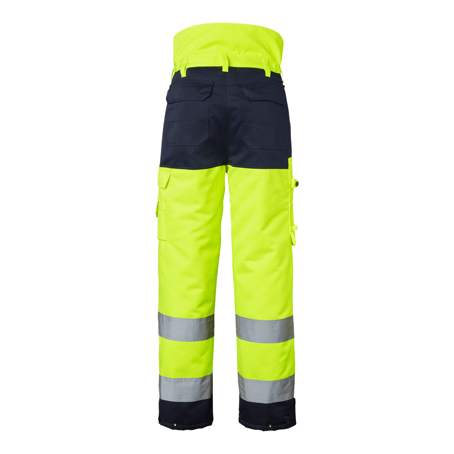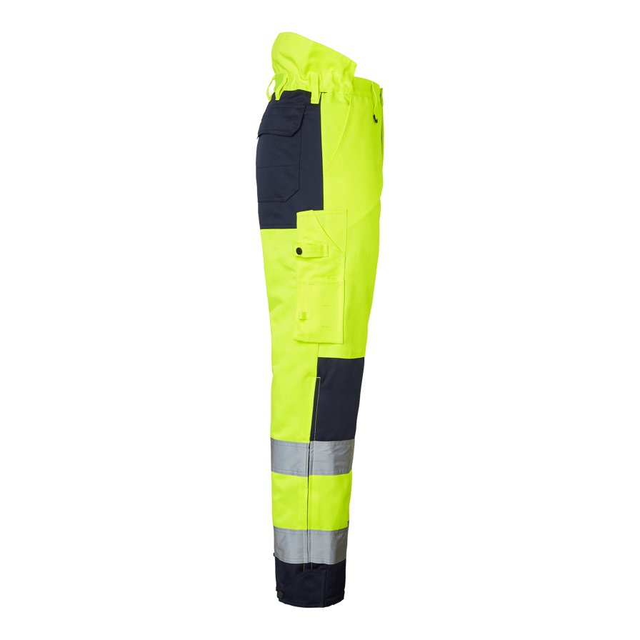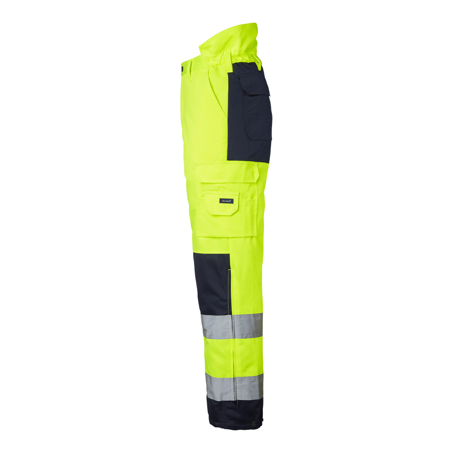 Quiltforede high vis-bukser med to forlommer, to baglommer med klap og trykknapper, tommestoklomme, benlomme med telefonlomme og indvendige knælommer. Elastik og løkker i taljen, lynlås i benene og justerbar kant. Ideel til kolde arbejdsmiljøer.