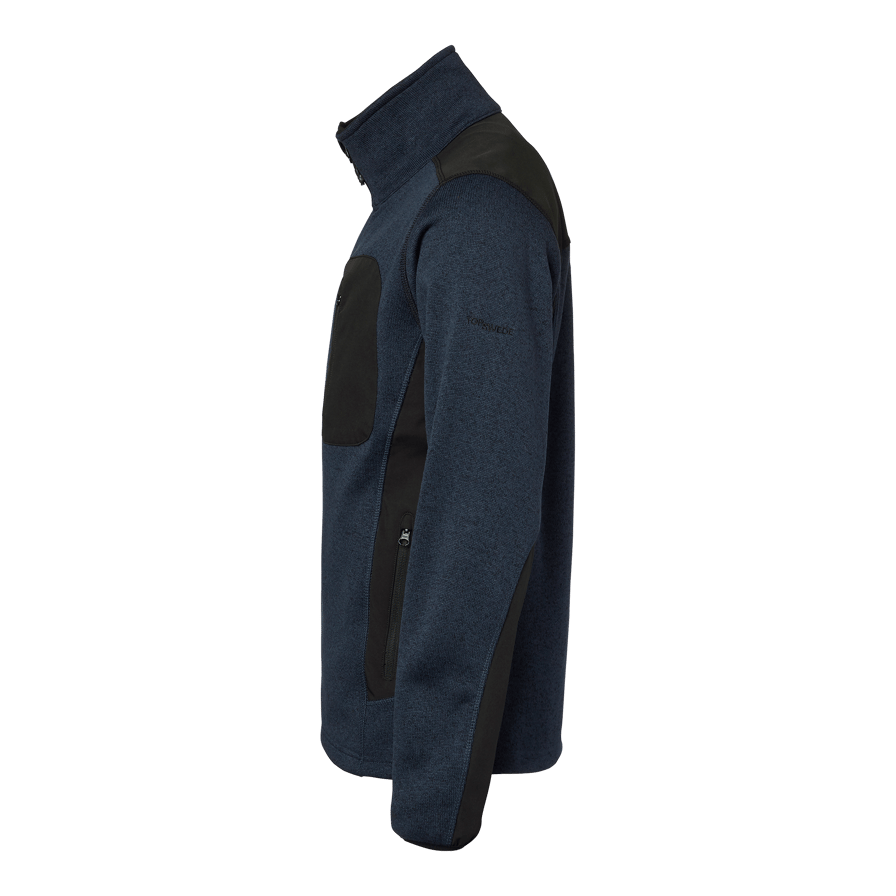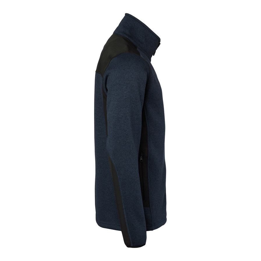 Strikket fleecejakke med detaljer af softshell fra Top Swede. En brystlomme med lynlås, to forlommer med lynlås, elastiske manchetter og snøre i bunden. Ideel til arbejde inden for byggeri og industri.