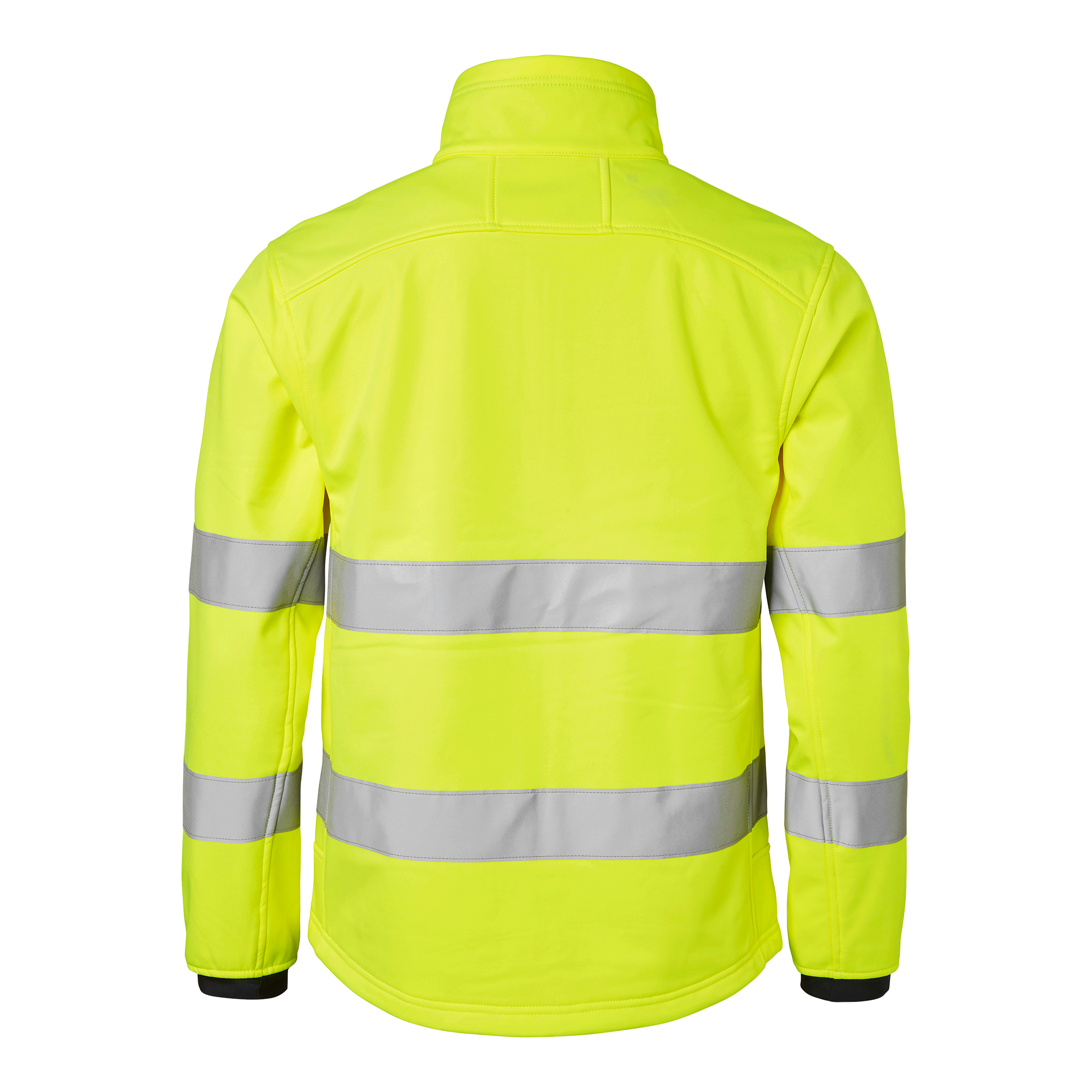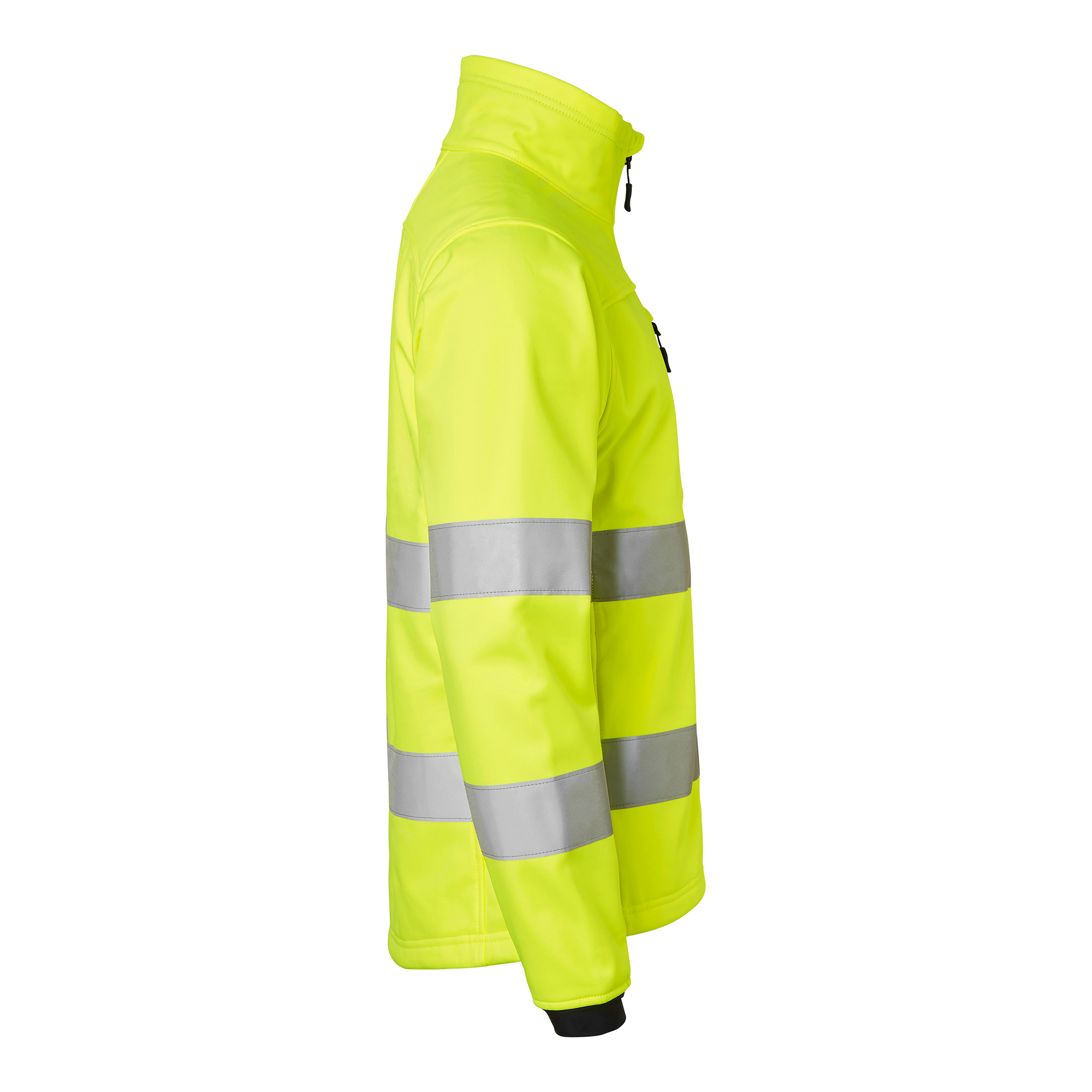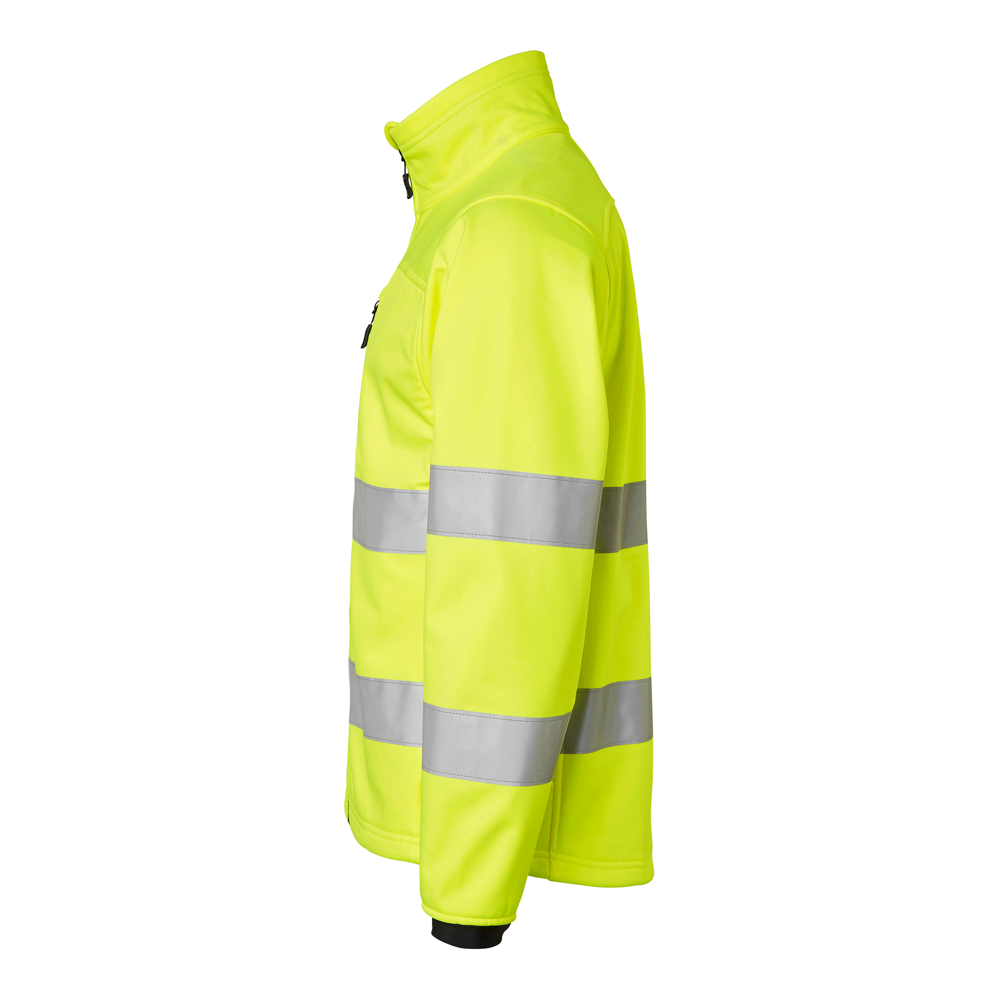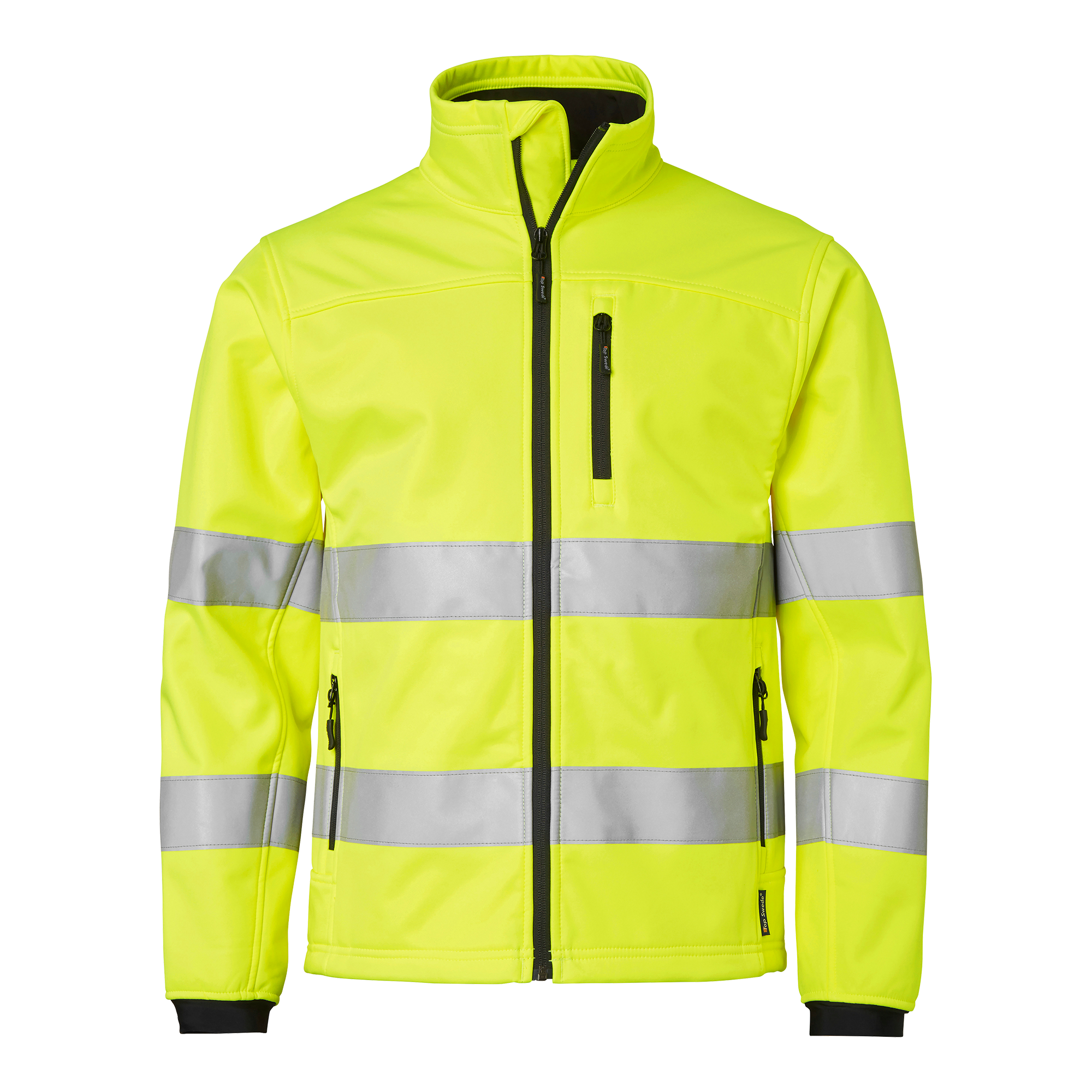 Softshell-jakke med gennemgående lynlås og kædebeskyttelse. Har en brystlomme og to forlommer med lynlås. 3-lags lamineret stof, vindtæt og meget vandafvisende med varmende fleece på indersiden. Ideel til synlighed og komfort i arbejdsmiljøer.