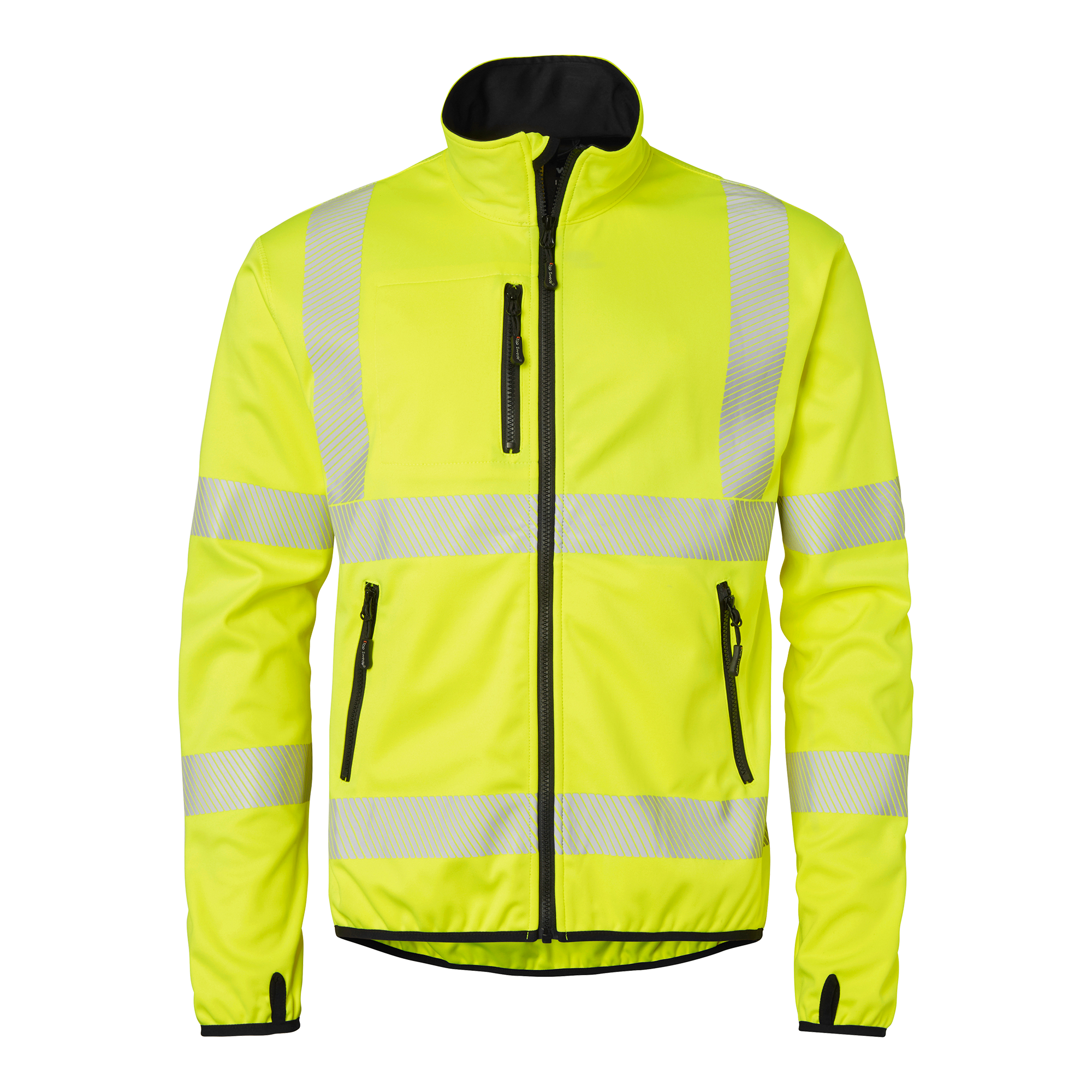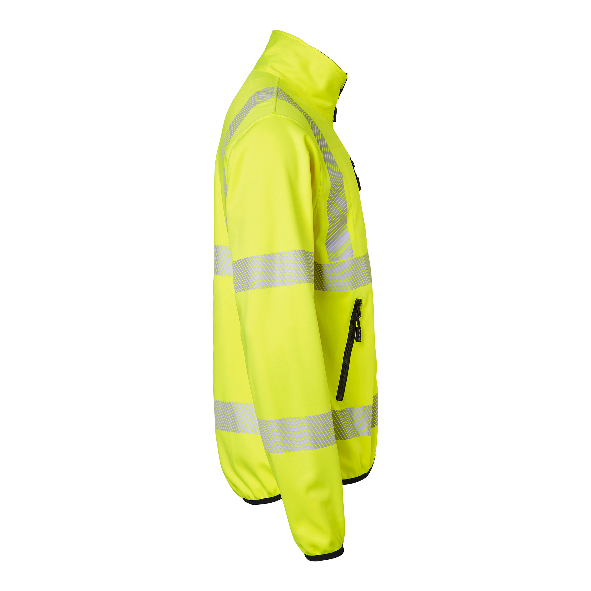 Softshell-jakke med gennemgående lynlås og kædebeskyttelse. Udstyret med en brystlomme/telefonlomme og to forlommer med lynlås. Har elastiske manchetter med tommelfingergreb og elastisk kant. Ideel til høj synlighed og komfort.