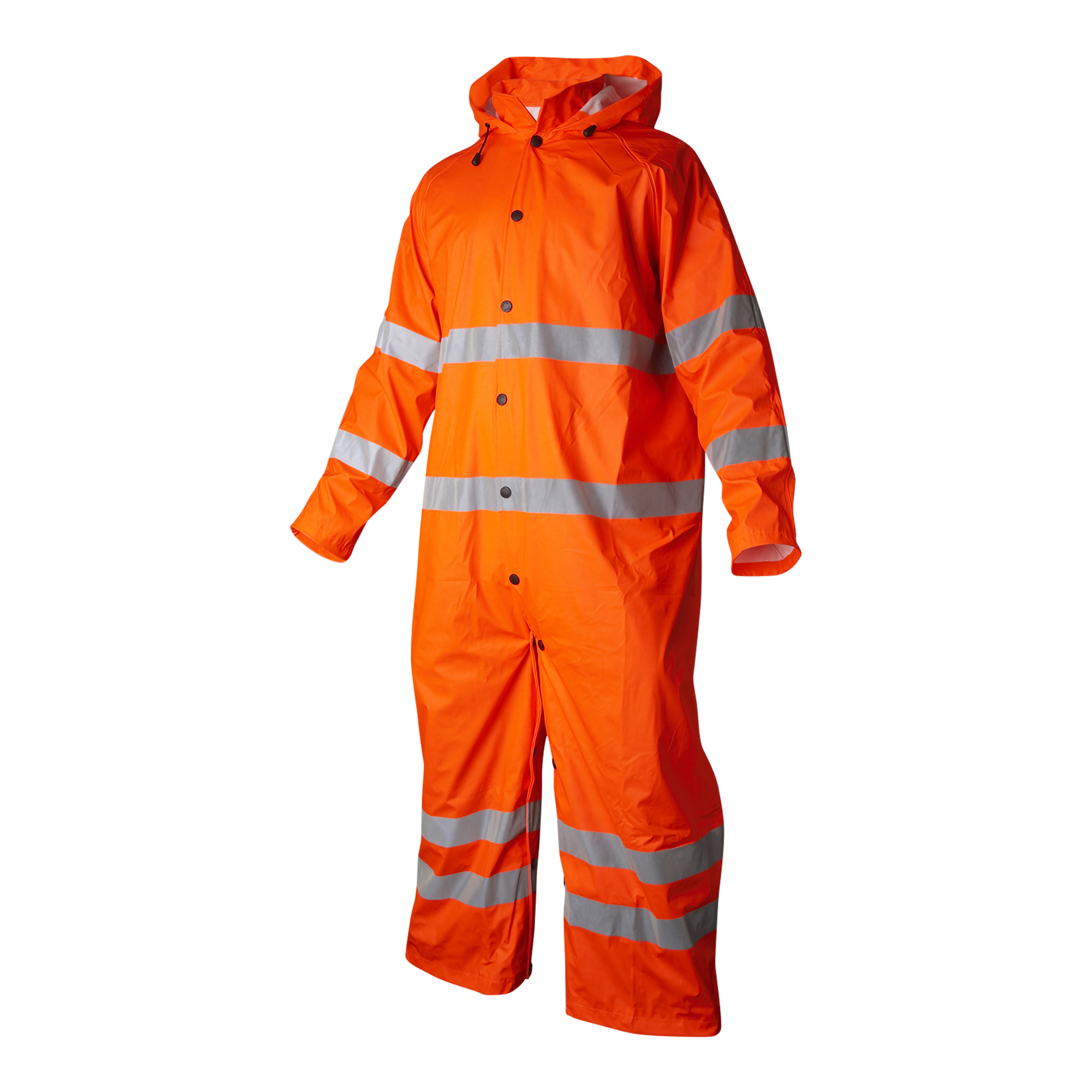Regnfrakke i fuld længde i glat stretchstof med svejsede sømme. Frakken kan knappes sammen til en overall for ekstra beskyttelse. Ideel til arbejde i regnfulde og krævende miljøer.