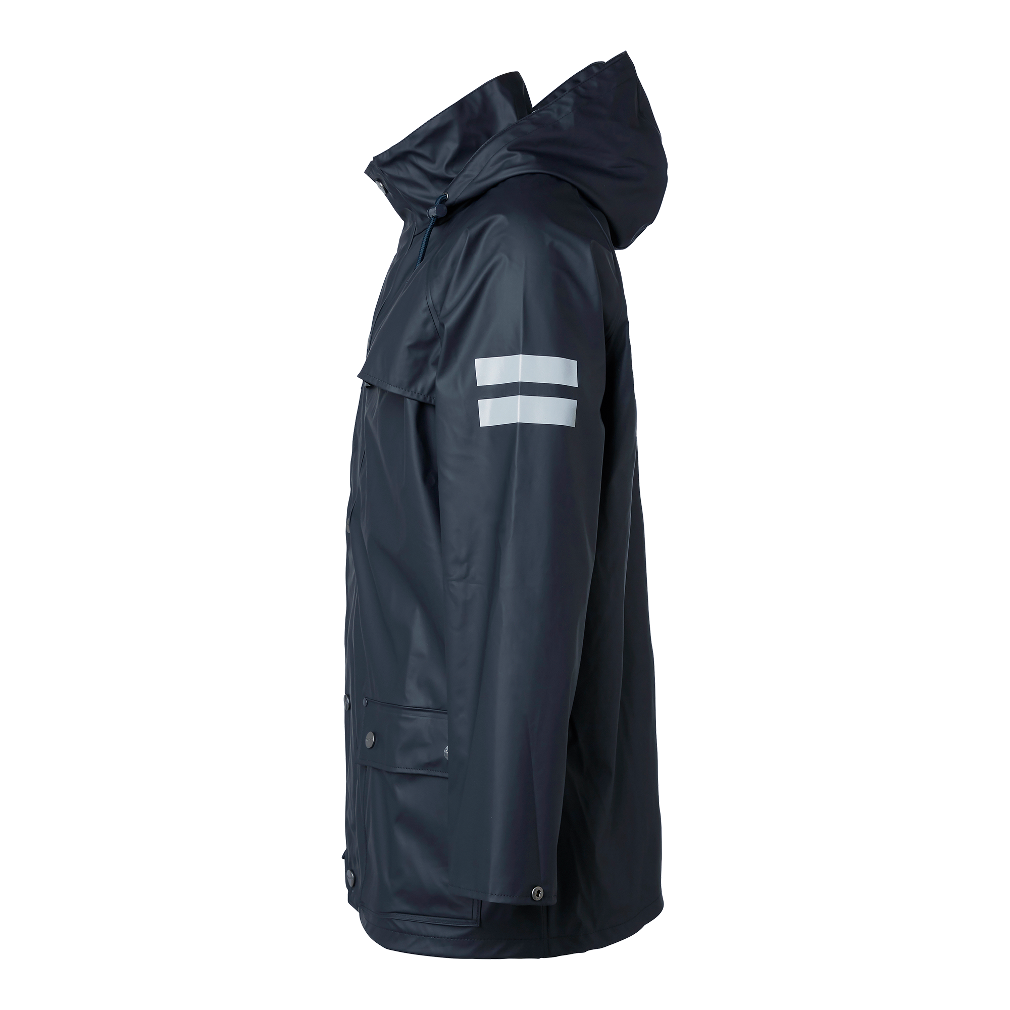 Sæt med regnjakke og bukser i glat stretchstof. Jakke med to lommer foran, lynlås og hætte. Bukser med elastik i taljen og justerbar snøre i taljen og ved anklerne. Svejsede sømme.