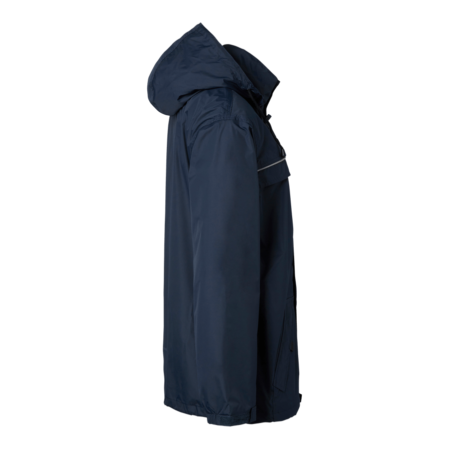 Komplet regntøj med tapede sømme. Jakke med skjult hætte, justerbare manchetter og forneden. To forlommer og en inderlomme med lynlås. Bukser med lommer og velcrolukning samt justerbare forneden
