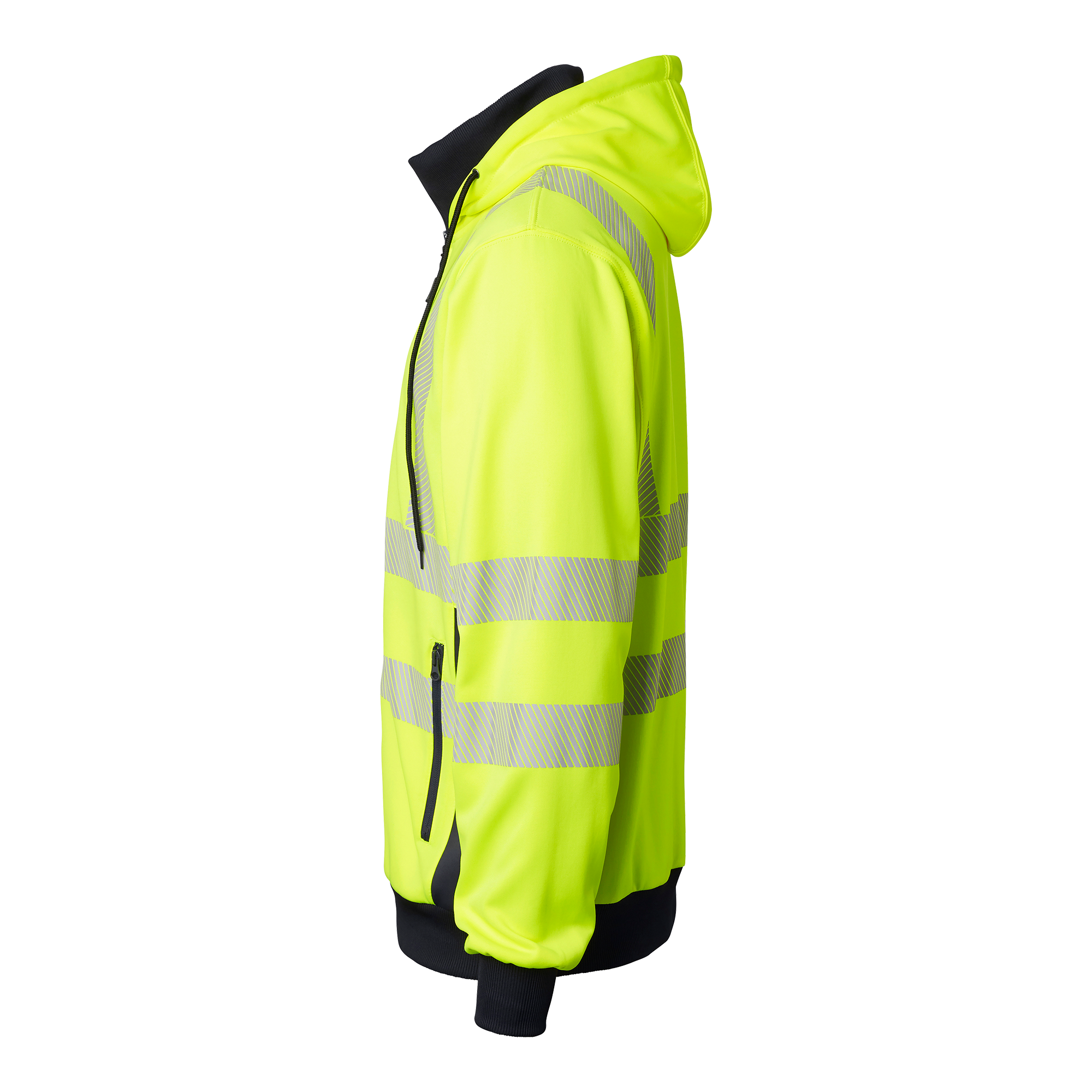 Hættetrøje med gennemgående lynlås. En brystlomme med lynlås og trykknap til ID-kortlomme. To forlommer med lynlås. Ribbet krave. Ribkant i taljen og ved håndleddene.