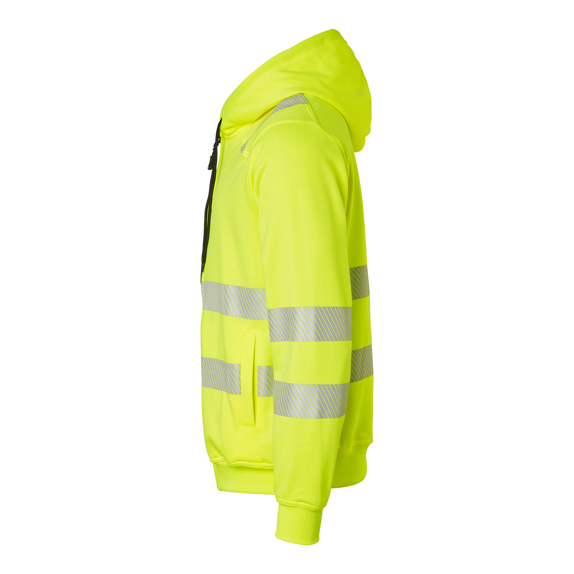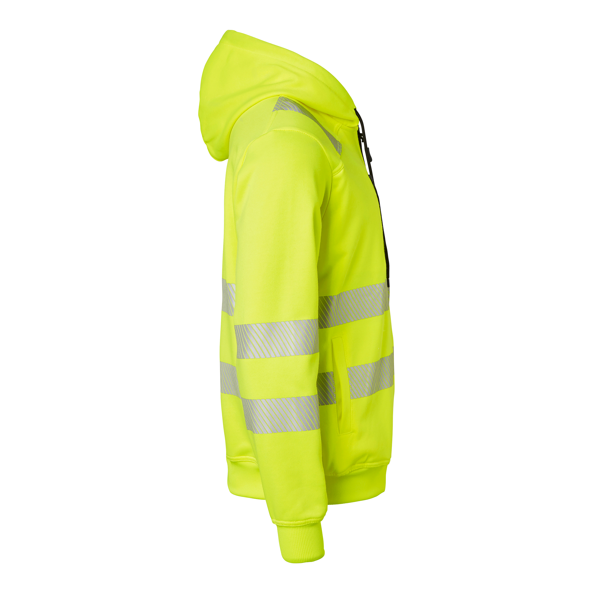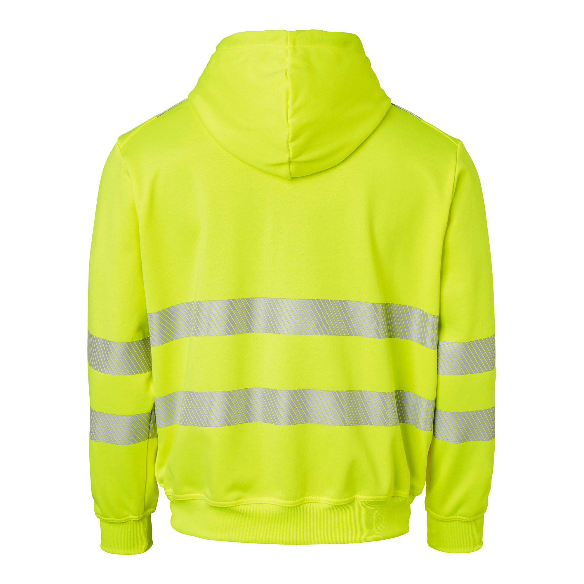 Sweatshirt med hætte og gennemgående lynlås. To forlommer og en brystlomme med lynlås. Reflekser med stretch, manchetter og forneden. Ideel til høj synlighed og komfort i arbejdsmiljøer. EN ISO 20471 klasse 2 og 3.