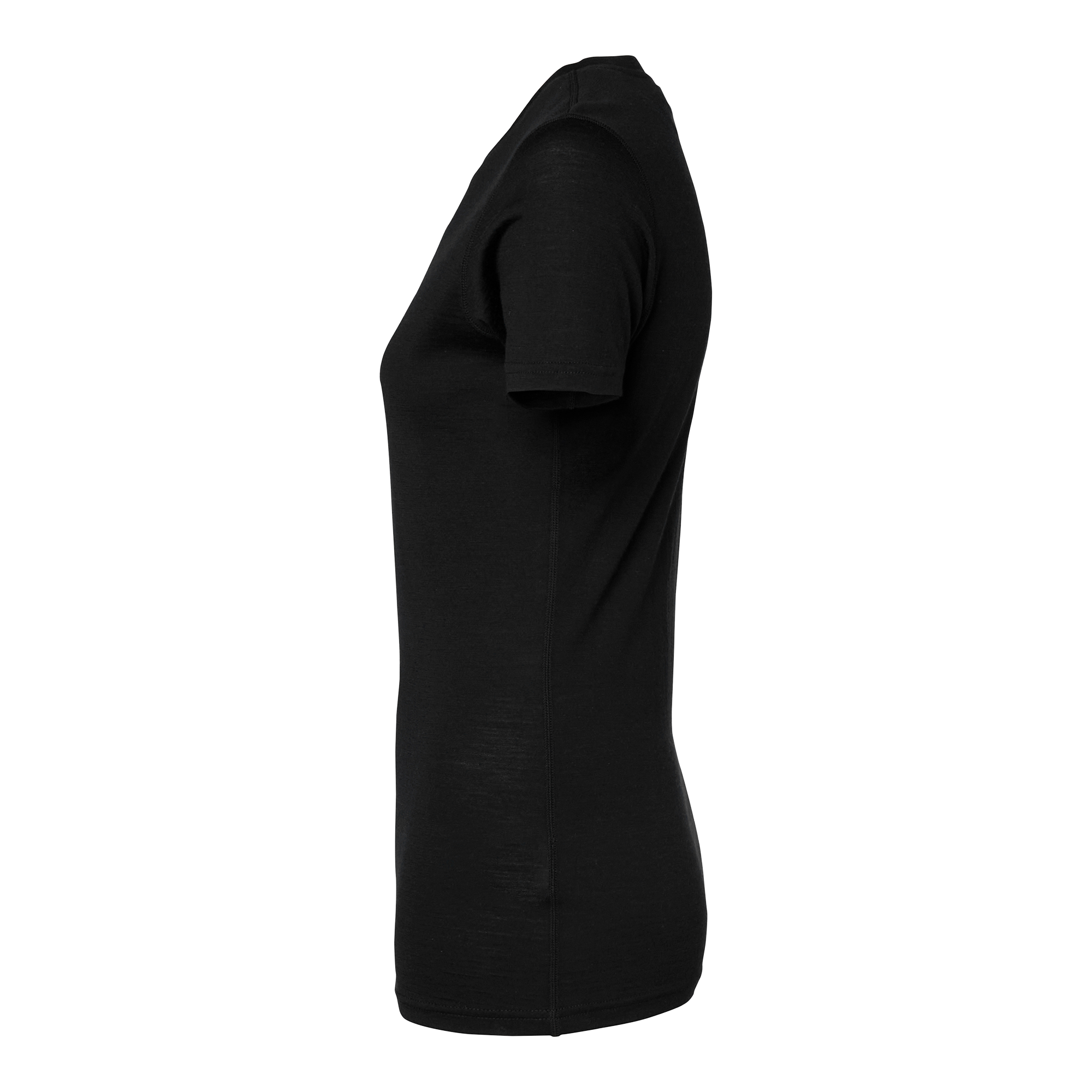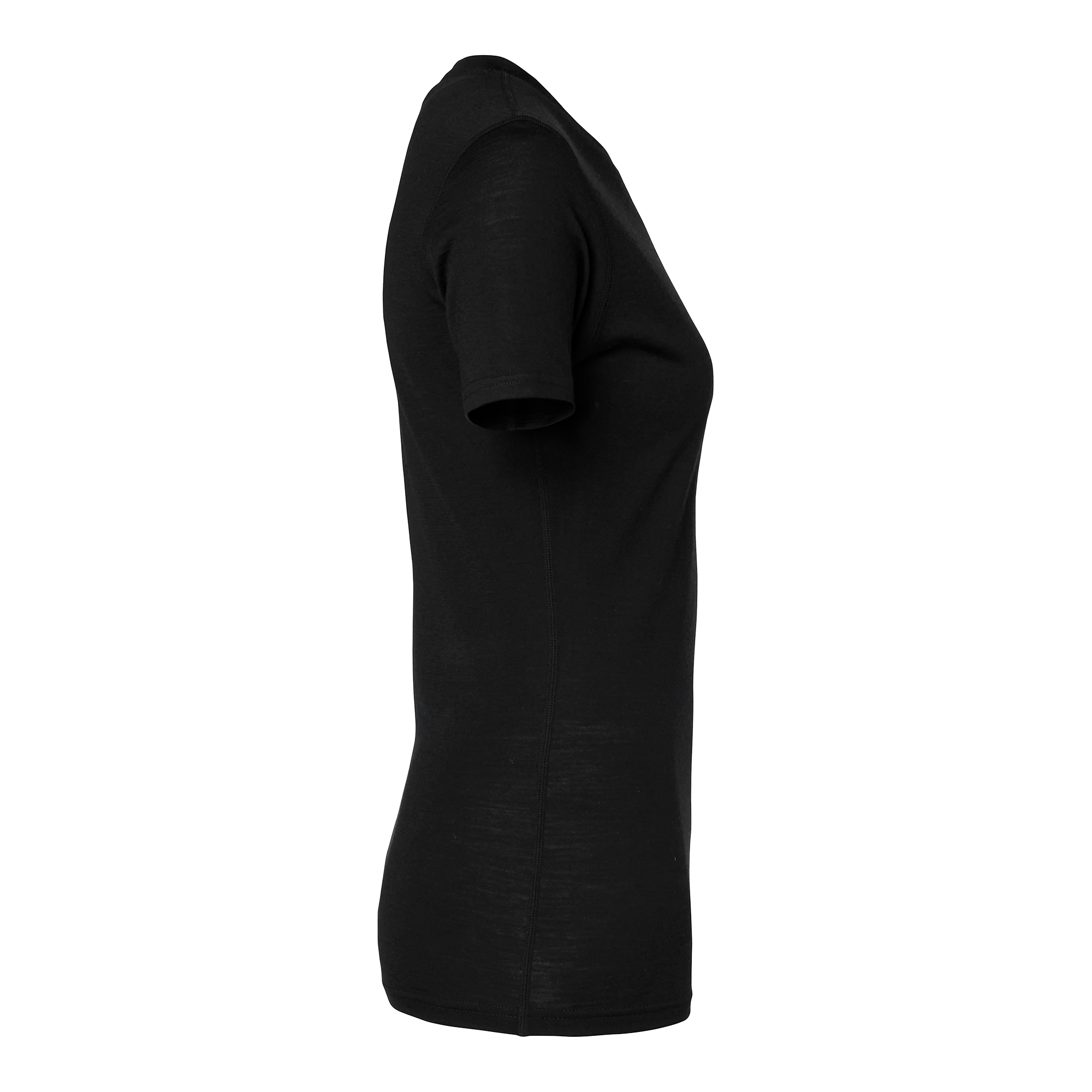 Kortærmet T-shirt til kvinder i blød merinould med feminin pasform. Temperaturregulerende, fugttransporterende og antibakteriel – ideel som basislag til forår og efterår. Fås i sort med diskret flockprintet logo. Kombinér med Hojac Basislagsbukser W.