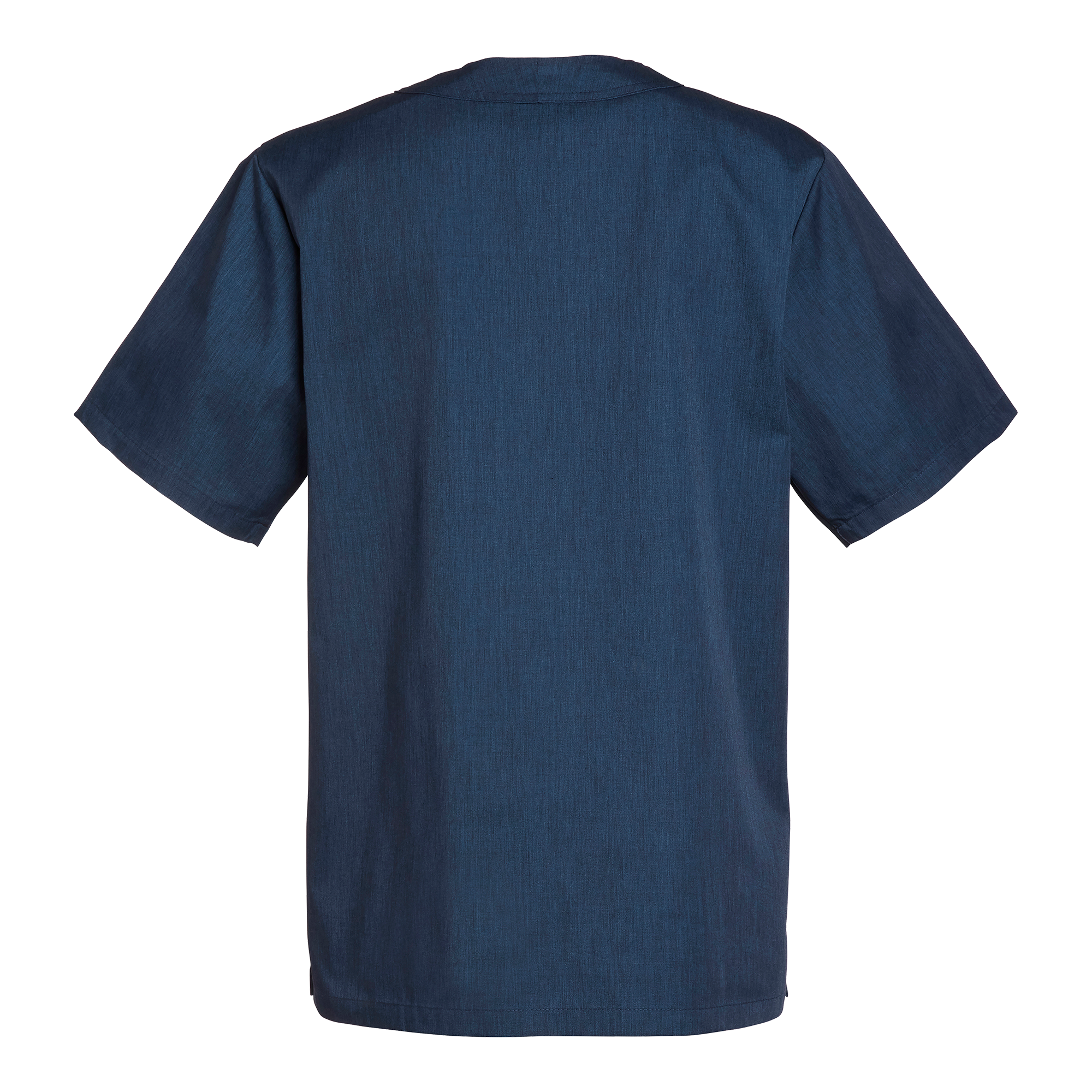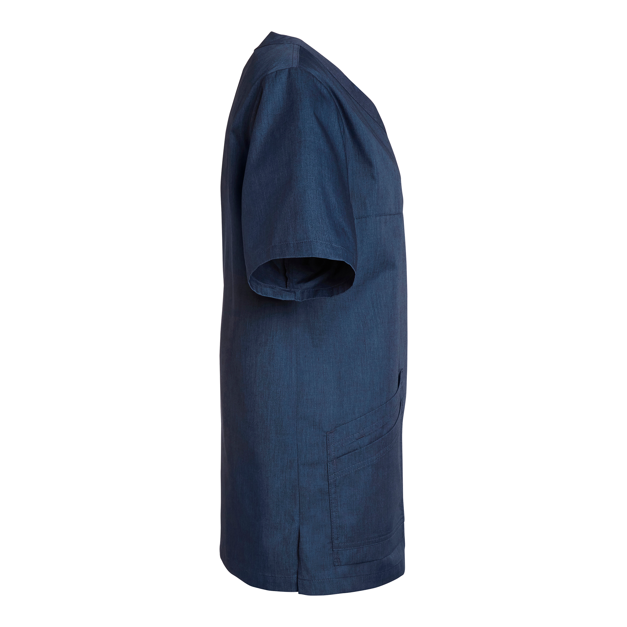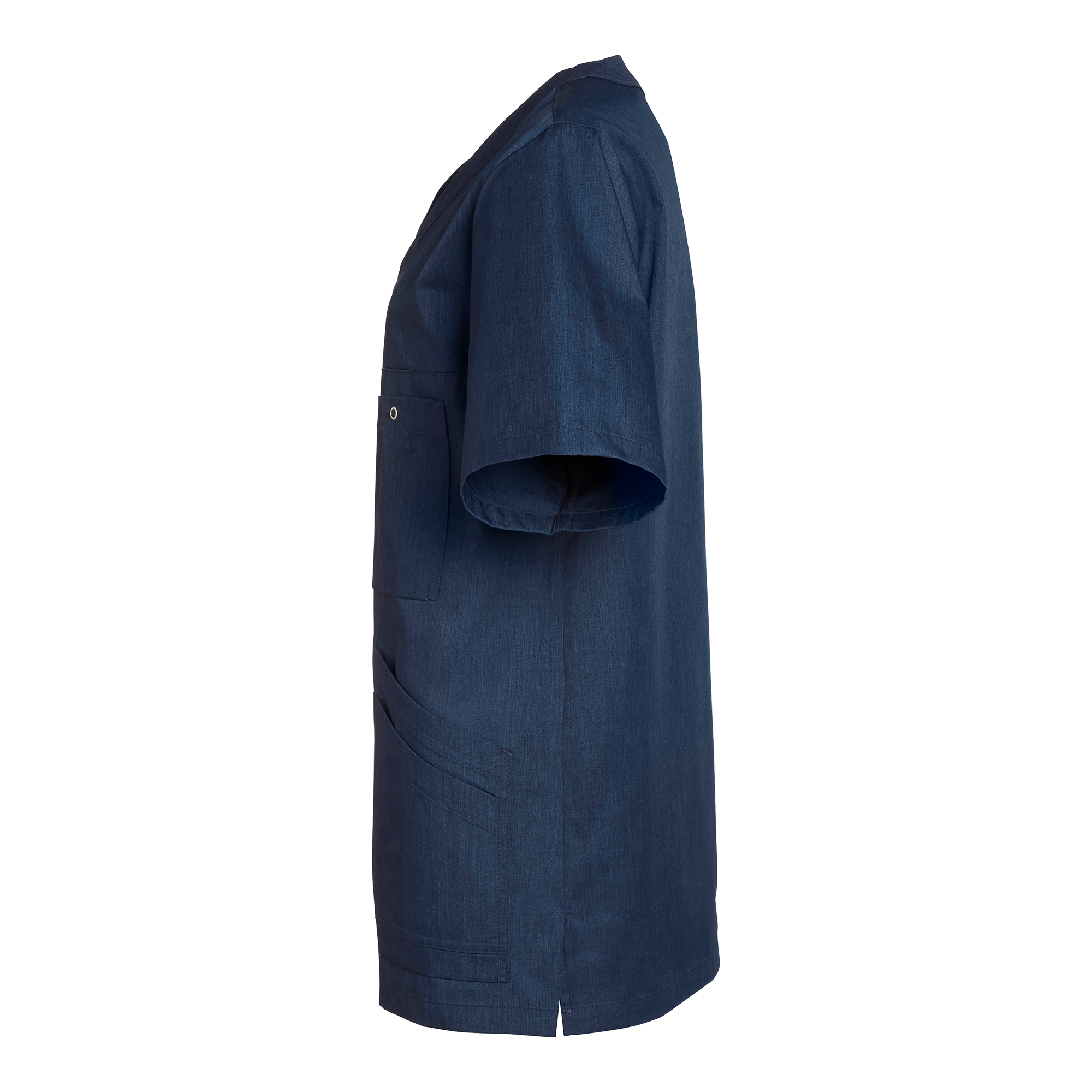Unisex V-tunika i en komfortabel og rummelig model. Dobbelte skrå forlommer og brystlomme med bælg, nøgleholder og trykknapper. Slids i siderne. Ryglængde 75 cm i størrelse M.