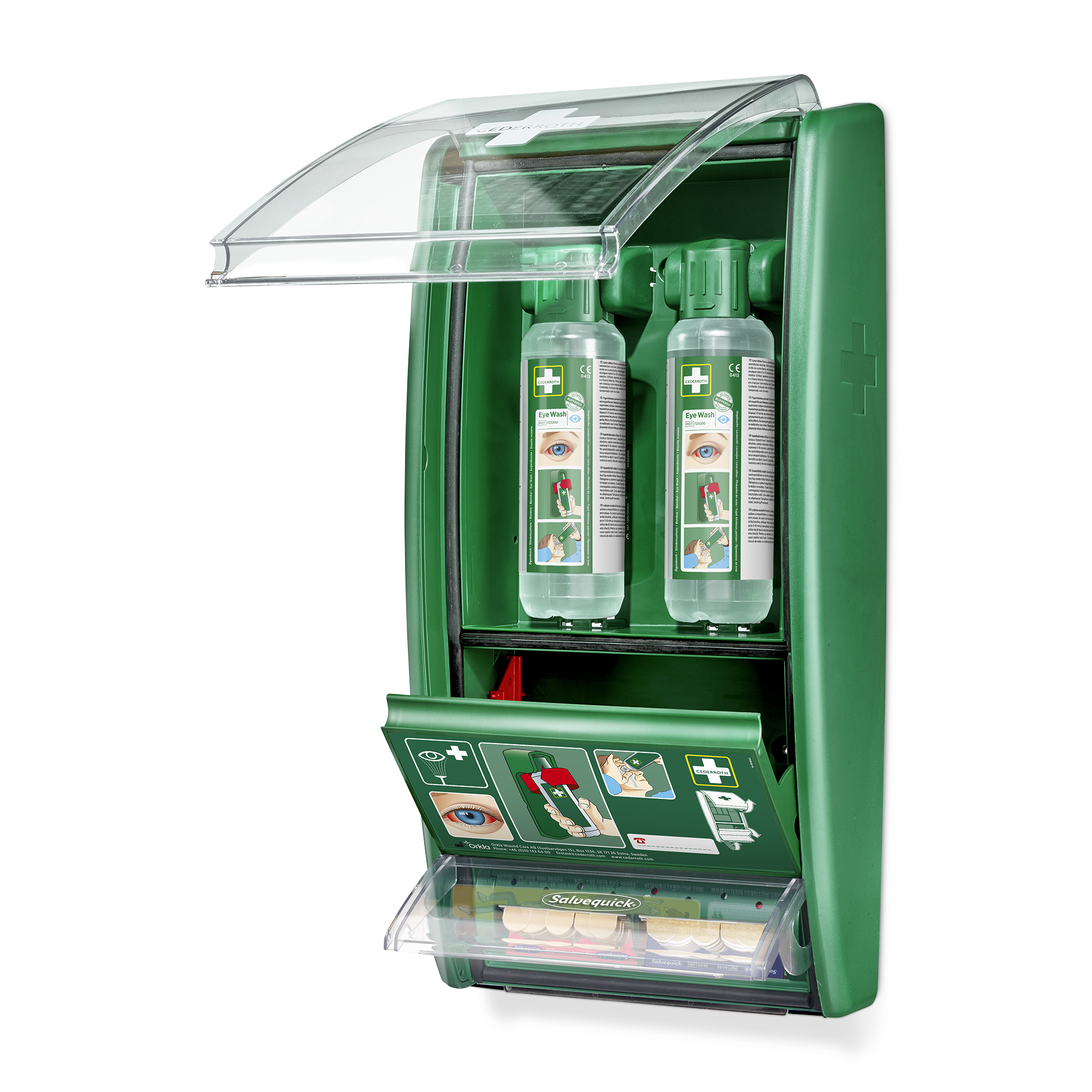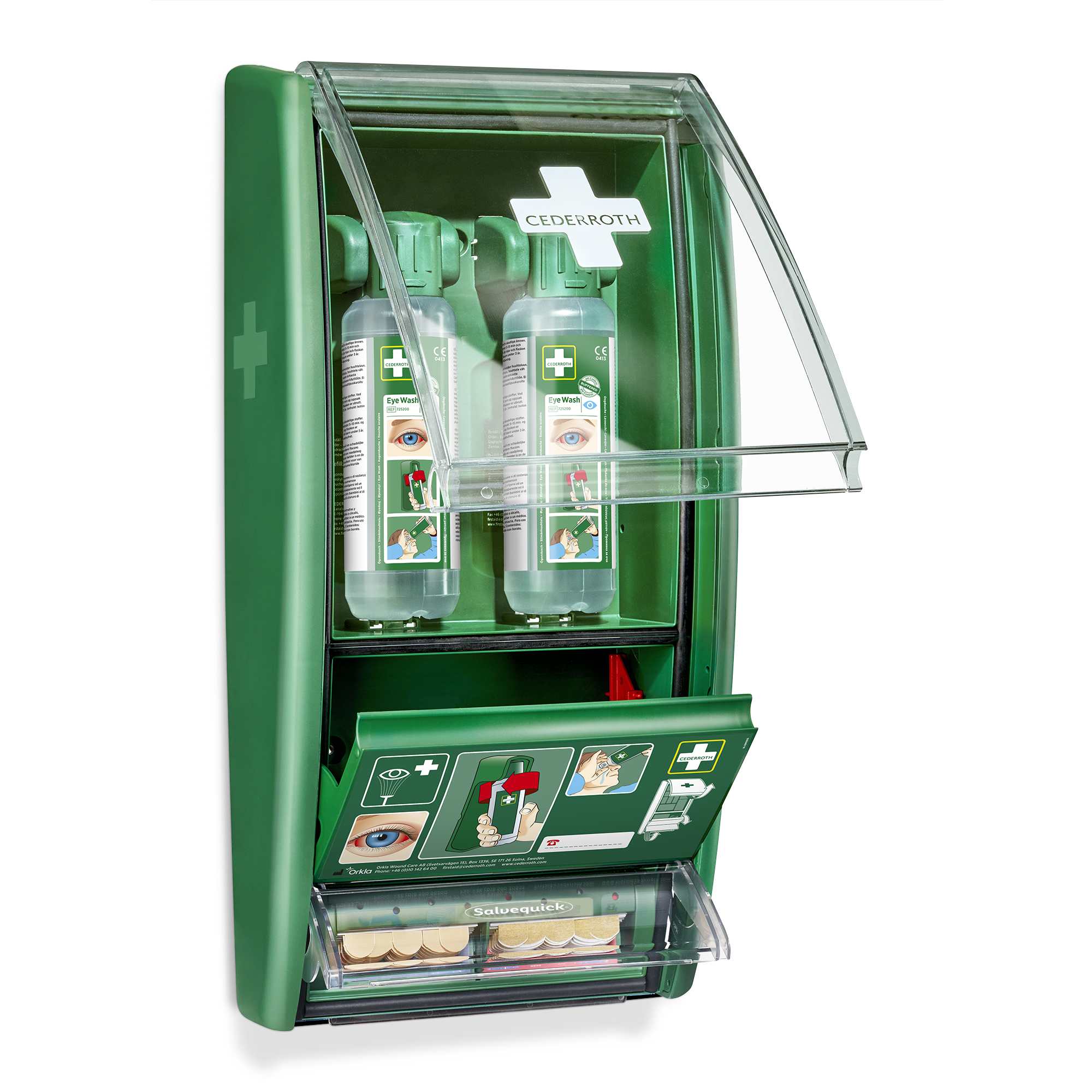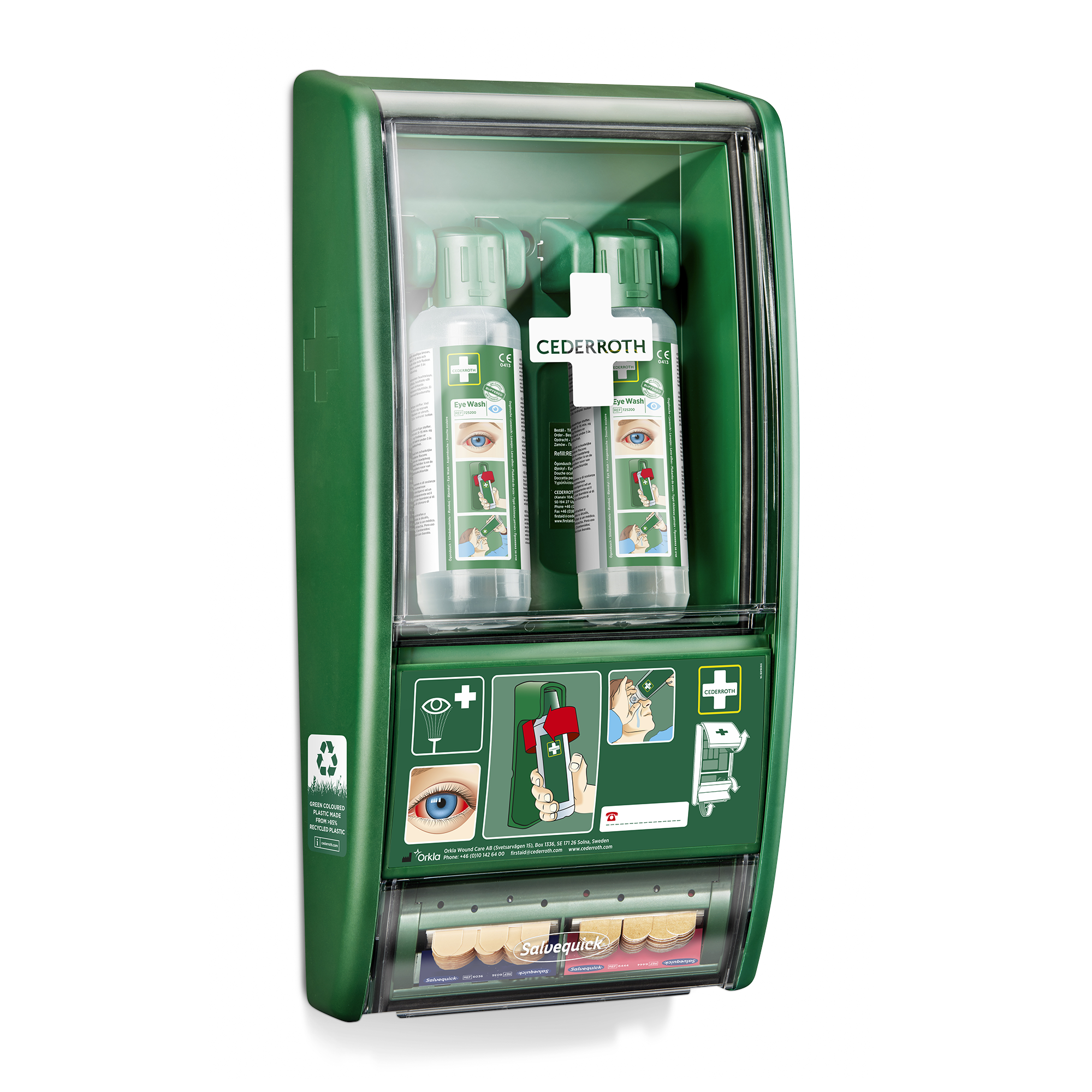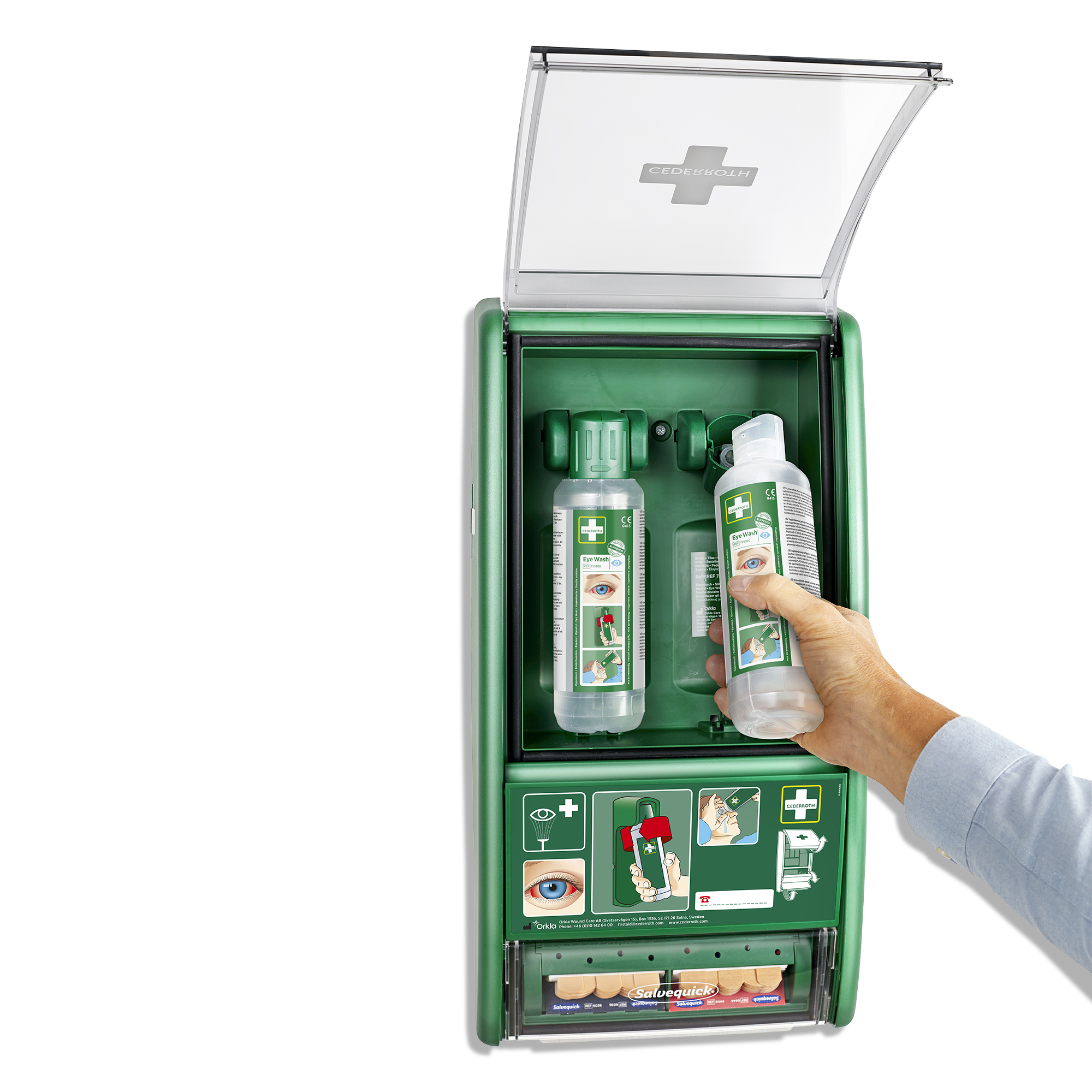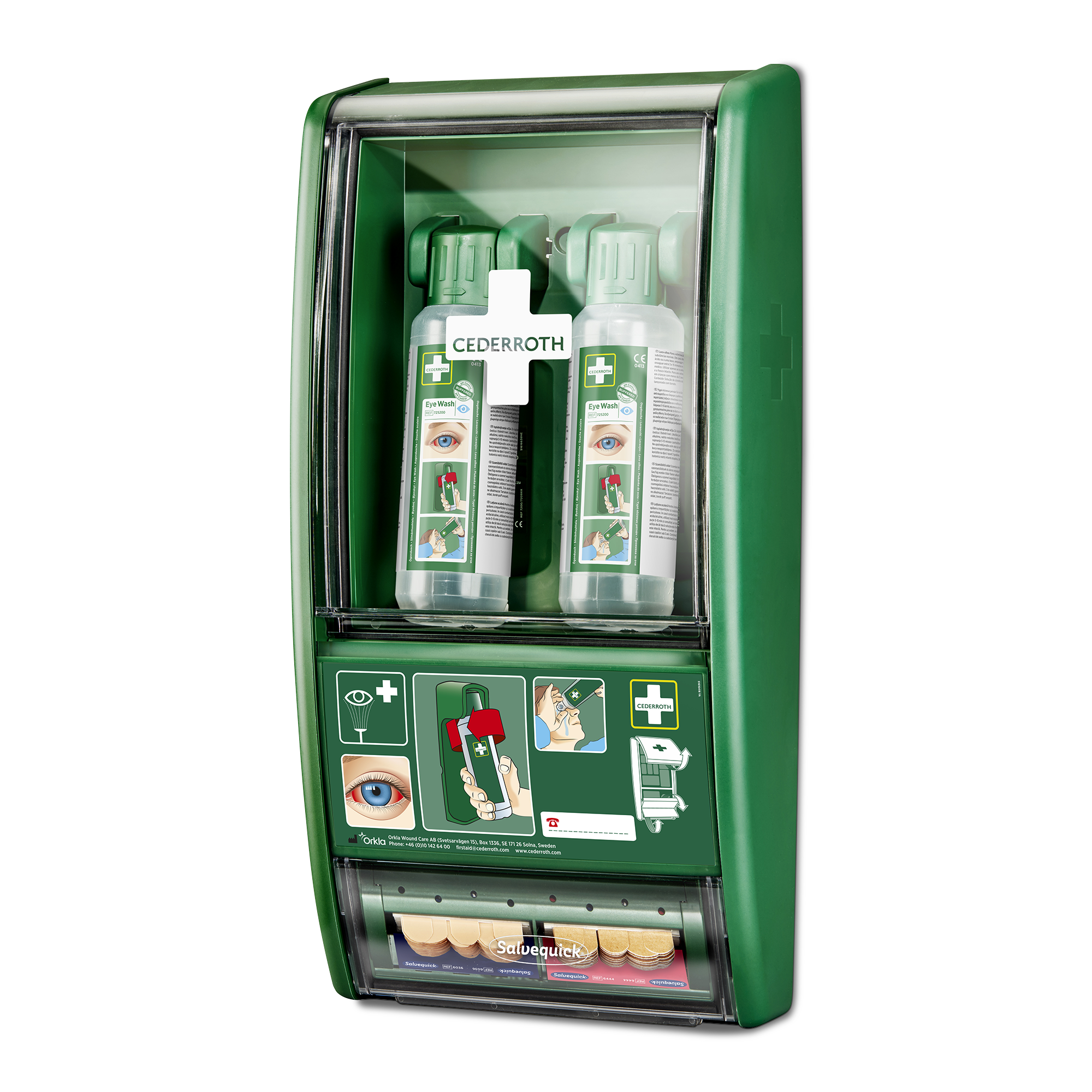 Cederroth Augendusche - nachweislich wirksamer als Kochsalzlösung bei Spritzern von Laugen und Säuren. Die Cederroth Eye Wash Station wurde für schnelle Hilfe gemacht. Die Station enthält 2 Flaschen, die sich beim Herausdrehen aus den Halterungen automatisch öffnen. Der Flascheninhalt ist darauf ausgelegt, das Auge 1,5 Minuten lang mit einem starken Spülstrahl zu spülen. Haltbarkeit: 4,5 Jahre. Die gepufferte Spüllösung erhöht die Chance, die Augen zu retten. Cederroth Augendusche neutralisiert den pH-Wert des Auges, d. h. sie wirkt neutralisierend auf Laugen- und Säurespritzer. Hierdurch lässt sich schneller ein Ergebnis erzielen als mit herkömmlicher Kochsalzlösung. Die Wirkung ist bei Laugen generell stärker als bei Säuren. Die Station ist auch mit einem Salvequick Pflasterspender ausgestattet. In unserem Spender werden die Pflaster nach unten herausgezogen. So wird vermieden, dass die restlichen Pflaster durch Schmutz oder Blut verunreinigt werden. Die Pflaster sind im Spender arretiert, wodurch Schwund vermieden wird. Die leeren Nachfüllpackungen lassen sich mit einem Spezialschlüssel leicht entnehmen. Inhalt: 2 x Cederroth Augendusche à 500 ml. Salvequick Pflasterspender inkl. 40 Textilpflaster und 45 Wasserabweisende Pflaster (REF 6444, REF 6036). 1 Anleitung für die Augenspülung. 1 Nachfüllschlüssel. Ab Sommer 2025 besteht der Kunststoff der Cederroth Eye Wash Station aus >87 % recyceltem Kunststoff.