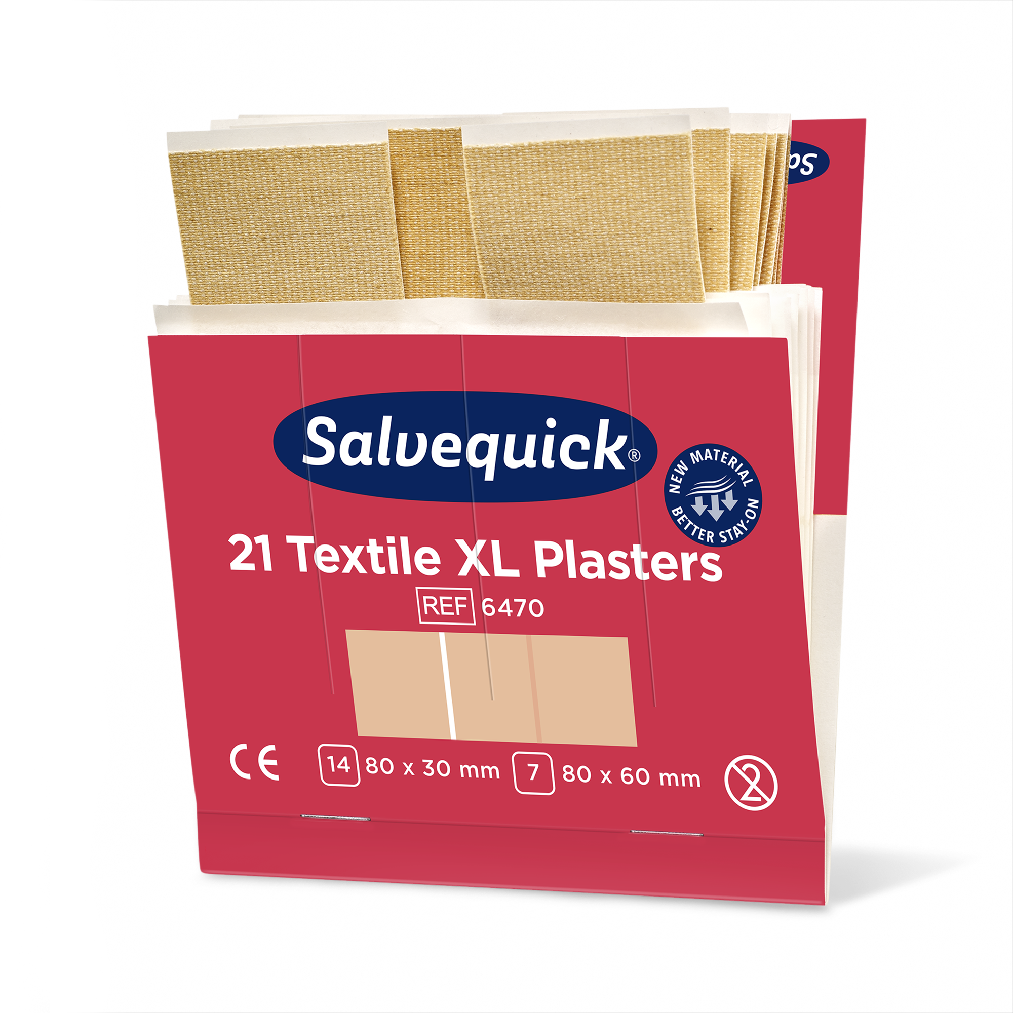 Salvequick Textilpflaster, extragroß, sind hochwertige, flexible Pflaster. Leicht aufzukleben, flexibel und benutzerfreundlich. Hypoallergene Pflaster. Passend für den Salvequick Pflasterspender.