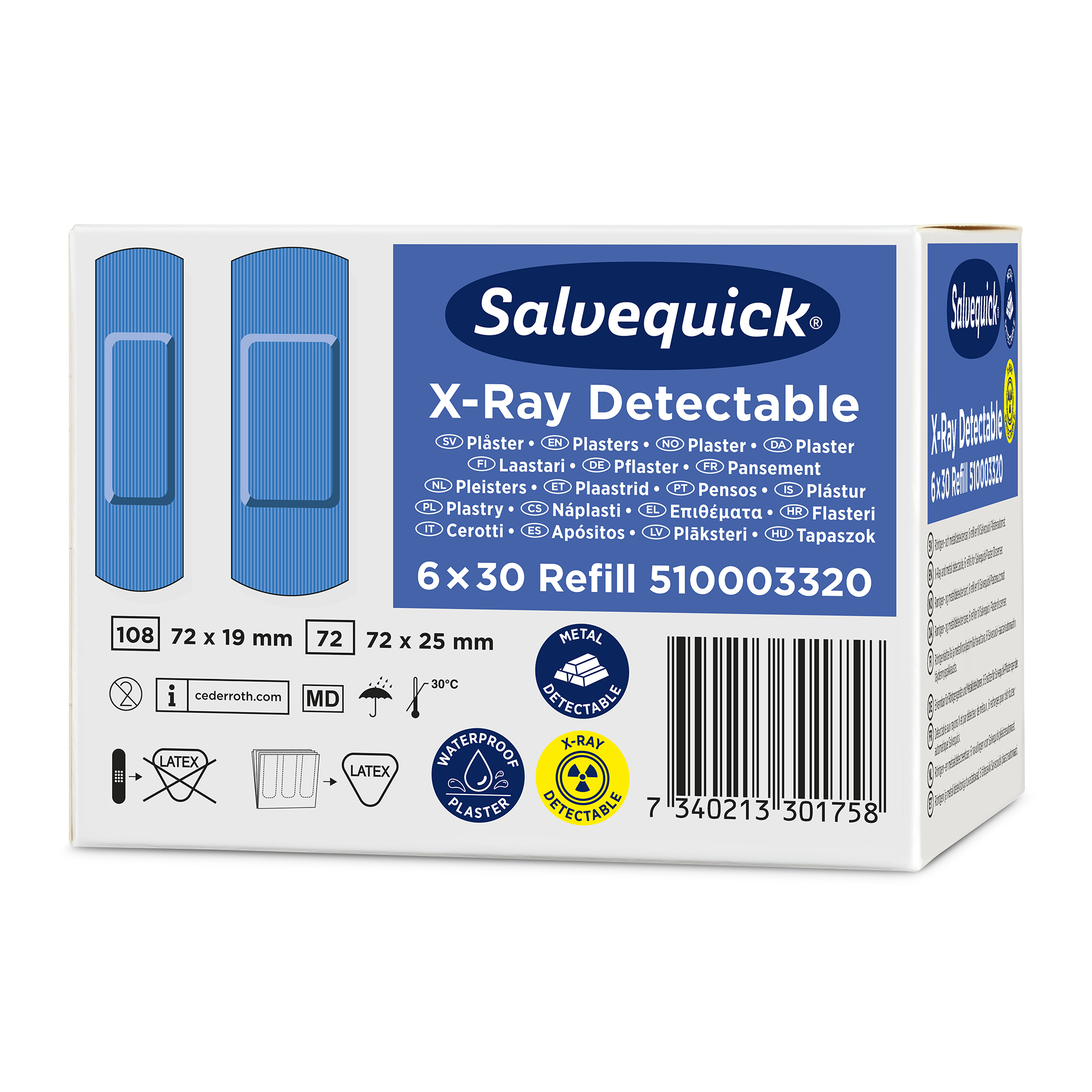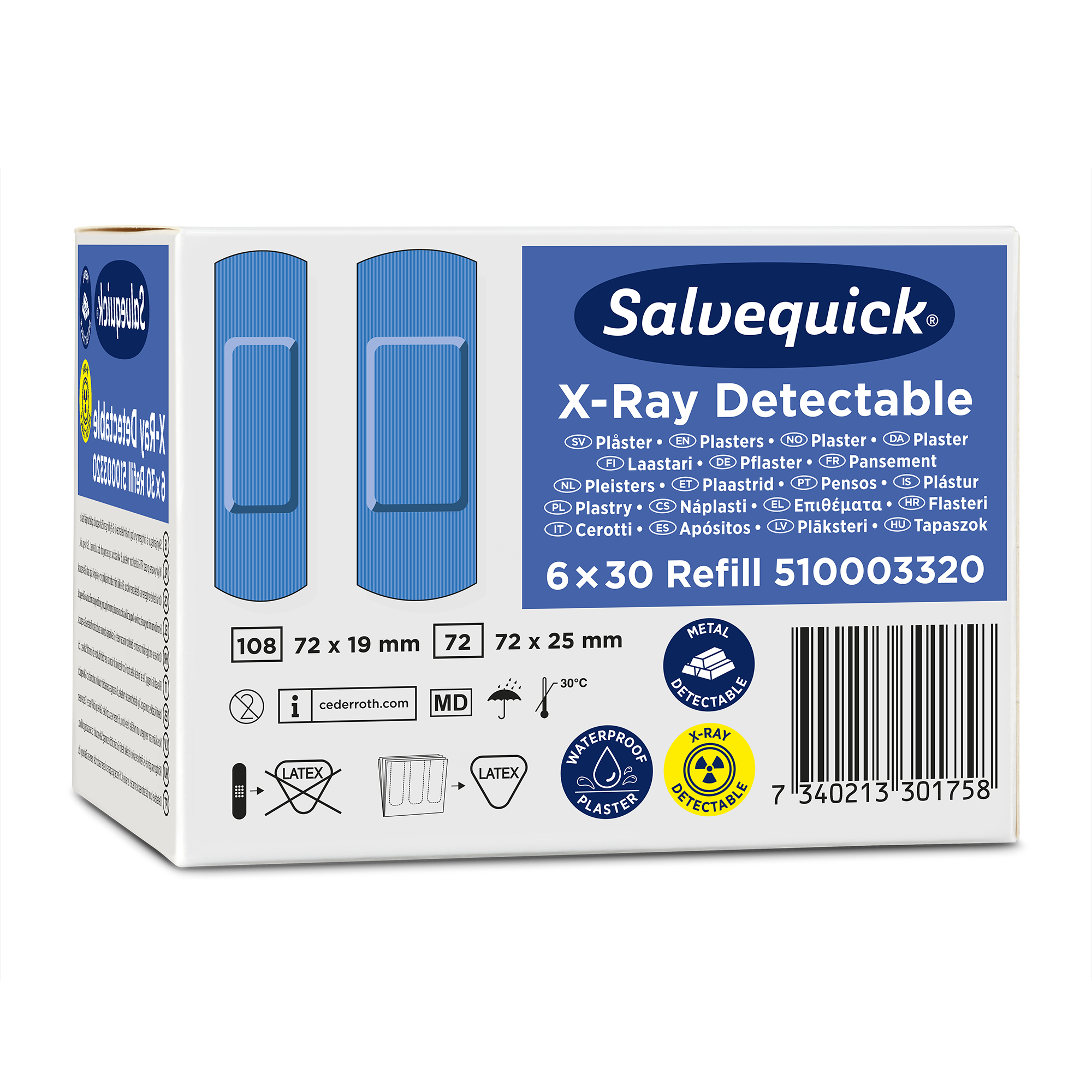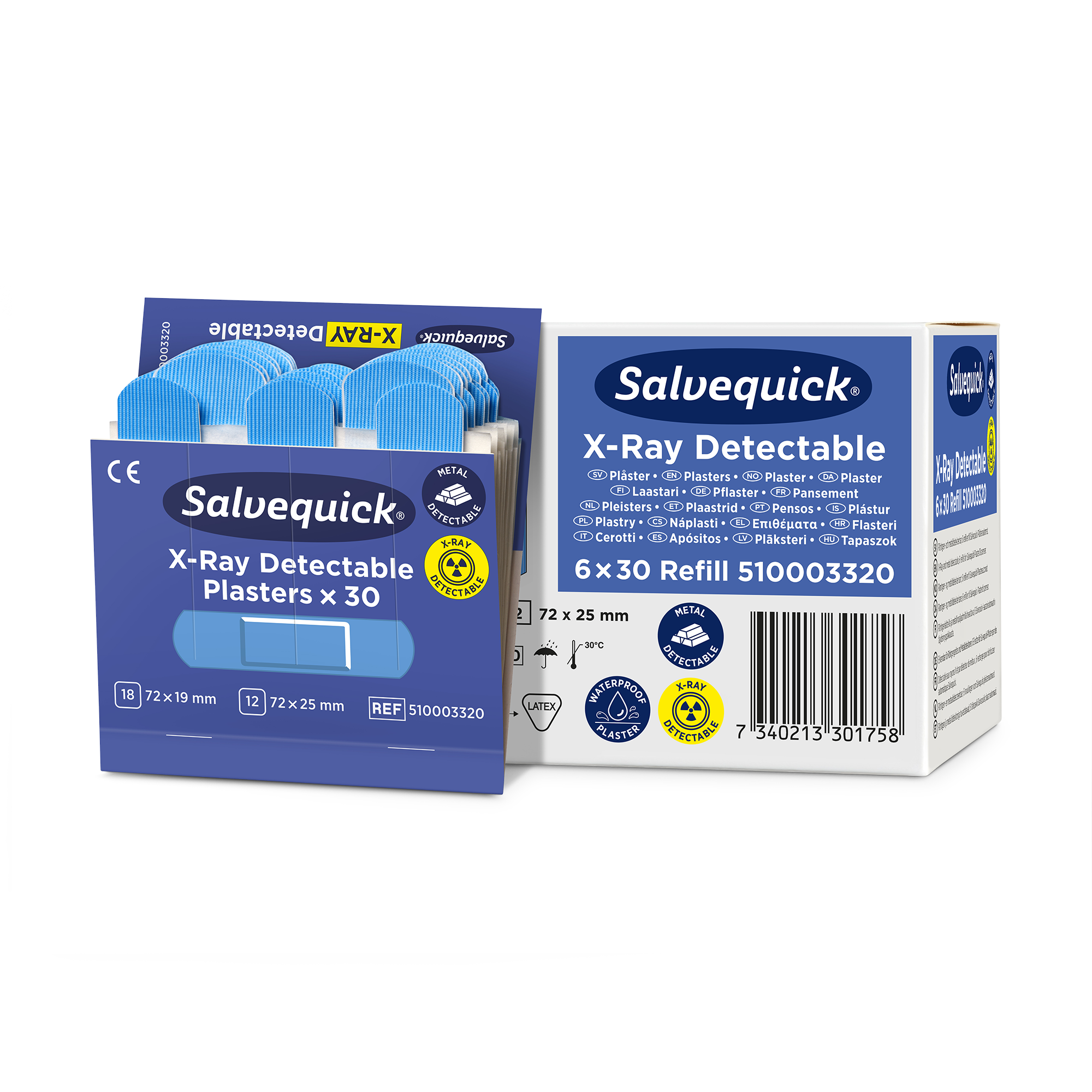 Salvequick Blue X-Ray Detectable Pflaster sind insbesondere für den Einsatz in der Lebensmittelbranche bestimmt. Die Pflaster werden von Röntgen- und Metalldetektoren erkannt. Die blaue Farbe macht die Pflaster leicht sichtbar. Sie sind wasserdicht und auf Allergene getestet. Leicht aufzukleben, flexibel und benutzerfreundlich. Geeignet für den Salvequick Pflasterspender. Jede Nachfüllpackung enthält 30 Pflaster (18 St. à 72x19 mm und 12 St. à 72x25 mm). 6 Nachfüllpackungen/Verpackung.