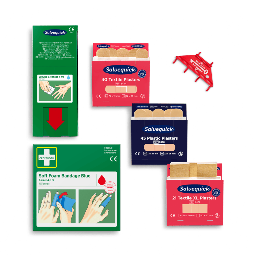 Die Cederroth Nachfüllpackung für den Wound Care Dispenser enthält einen kompletten Nachfüllsatz für den Wound Care Dispenser (REF 51011005). Inhalt: 1 x Nachfüllpackung (45) Salvequick Wasserabweisende Pflaster (REF 6036). 1 x Nachfüllpackung (40) Salvequick Textilpflaster (REF 6444). 1 x Nachfüllpackung (21) Salvequick XL Textilpflaster (REF 6470). 1 x Packung (40) Salvequick Wundreiniger (REF 3227). 1 x Cederroth Soft Foam Bandage Blue 6 cm x 4,5 m (REF 51011010). 1 x Nachfüllschlüssel.