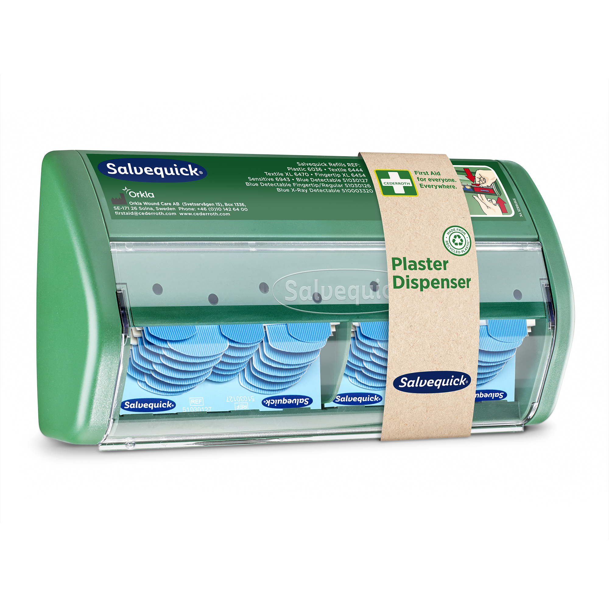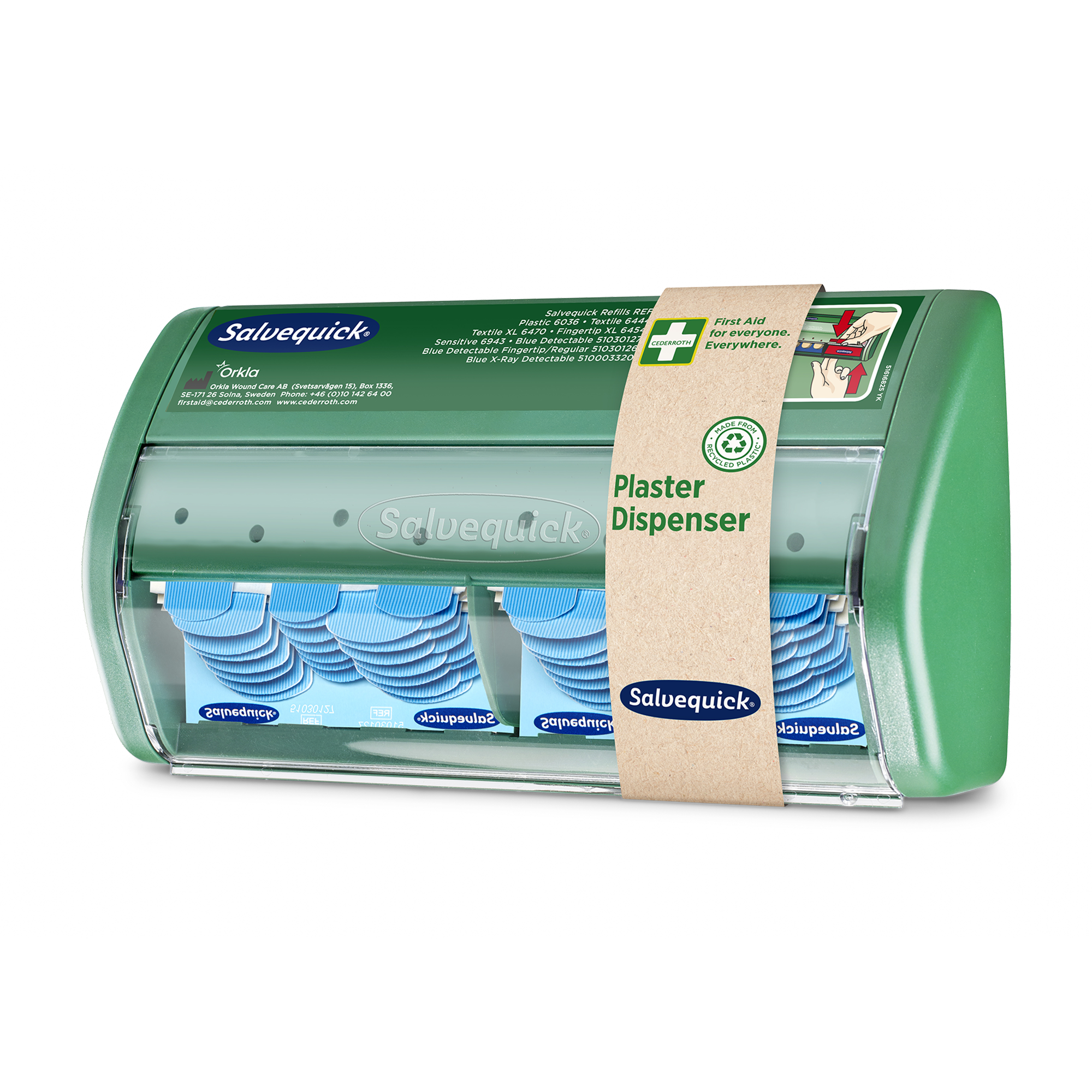 Im Salvequick Pflasterspender werden die Pflaster nach unten herausgezogen. So wird vermieden, dass die restlichen Pflaster durch Schmutz oder Blut verunreinigt werden. Die Salvequick Pflasterspender und Pflaster sind ein komplettes, benutzerfreundliches System. Die Pflaster sind immer einsatzbereit zur Hand. Die Nachfüllpackungen sind arretiert, wodurch Schwund vermieden wird. Der Salvequick Pflasterspender Blue Detectable ist speziell für den Einsatz in der Lebensmittelbranche konzipiert. Die Pflaster sind detektierbar und werden von den meisten Metalldetektoren erkannt. Die blaue Farbe macht die Pflaster leicht sichtbar. Mit einem Spezialschlüssel lässt sich der Spender schnell und einfach nachfüllen. Die durchsichtige Abdeckung schützt vor Staub und Feuchtigkeit. Inhalt: 2 x 35 Blue Detectable Pflaster (REF 51030127). Jede Nachfüllpackung enthält Pflaster in verschiedenen Größen: 72 x 19 mm und 72 x 25 mm. Abmessungen: B 23 x H 12 x T 5,5 cm. Auch als Nachfüllpackung mit Pflastern Normal/Fingerkuppen erhältlich (REF 51030126 - Salvequick Blue Detectable Mix - 15 Pflaster Normal/15 Fingerkuppenpflaster). Ab Sommer 2025 besteht der Kunststoff in den Erste-Hilfe-Stationen und -Spendern von Cederroth zu >92 % aus recyceltem Kunststoff.