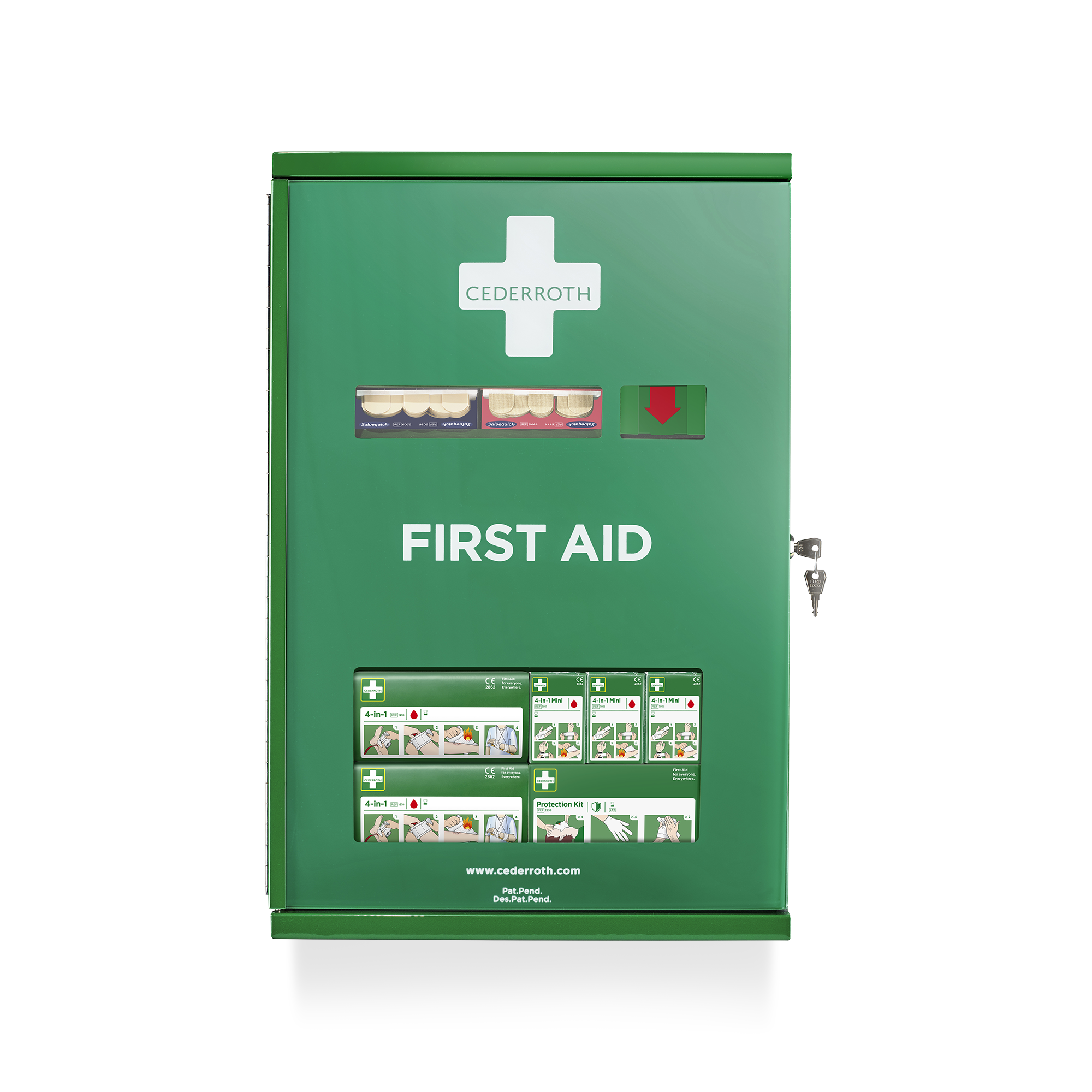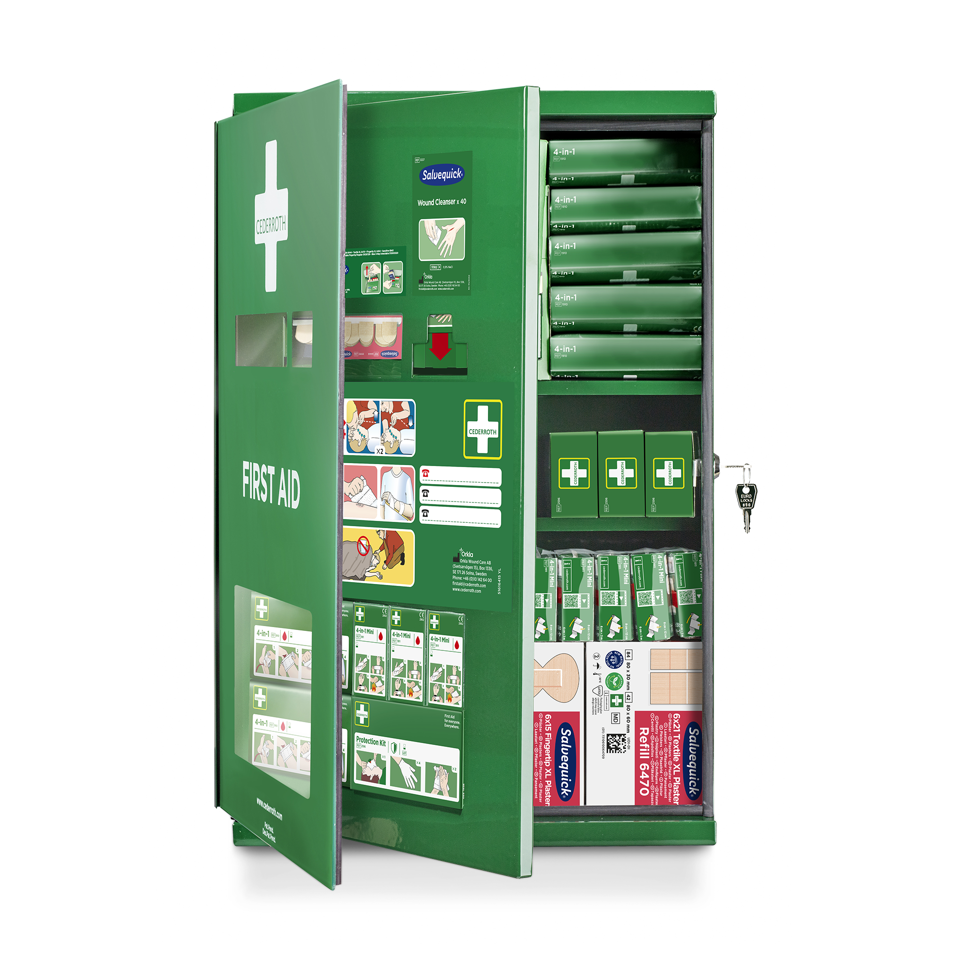 Der Cederroth Erste-Hilfe-Schrank, Doppeltür, hat ein einzigartiges Design. Er besteht aus Blech und verfügt über zwei Türen, die den Schrank in zwei Bereiche einteilen. Der äußere Bereich ist als Erste-Hilfe-Tafel gestaltet, in der die Erste-Hilfe-Produkte leicht zugänglich sind. Eine Plexiglas-Tür schützt die Produkte vor Staub und Feuchtigkeit. Der Innenbereich des Schranks besteht aus einem abschließbaren Fach mit einem umfangreichen Vorrat an Nachfüllprodukten. Inhalt: 1 Salvequick Pflasterspender. 1 Salvequick Wundreinigerspender. 7 Cederroth 4-in-1 Blutstiller. 9 Cederroth 4-in-1 Mini-Blutstiller. 4 Cederroth Schutzpakete. 1 Verpackung (6x40 St.) Textilpflaster. 1 Verpackung (6x45 St.) Wasserabweisende Pflaster. 1 Verpackung (6x15 St.) Fingerkuppenpflaster. 1 Verpackung (6x21 St.) XL Textilpflaster. 4 Verpackungen (x40 St.) Salvequick Wundreiniger. Schere und Pinzette. 1 Erste-Hilfe-Anleitung.