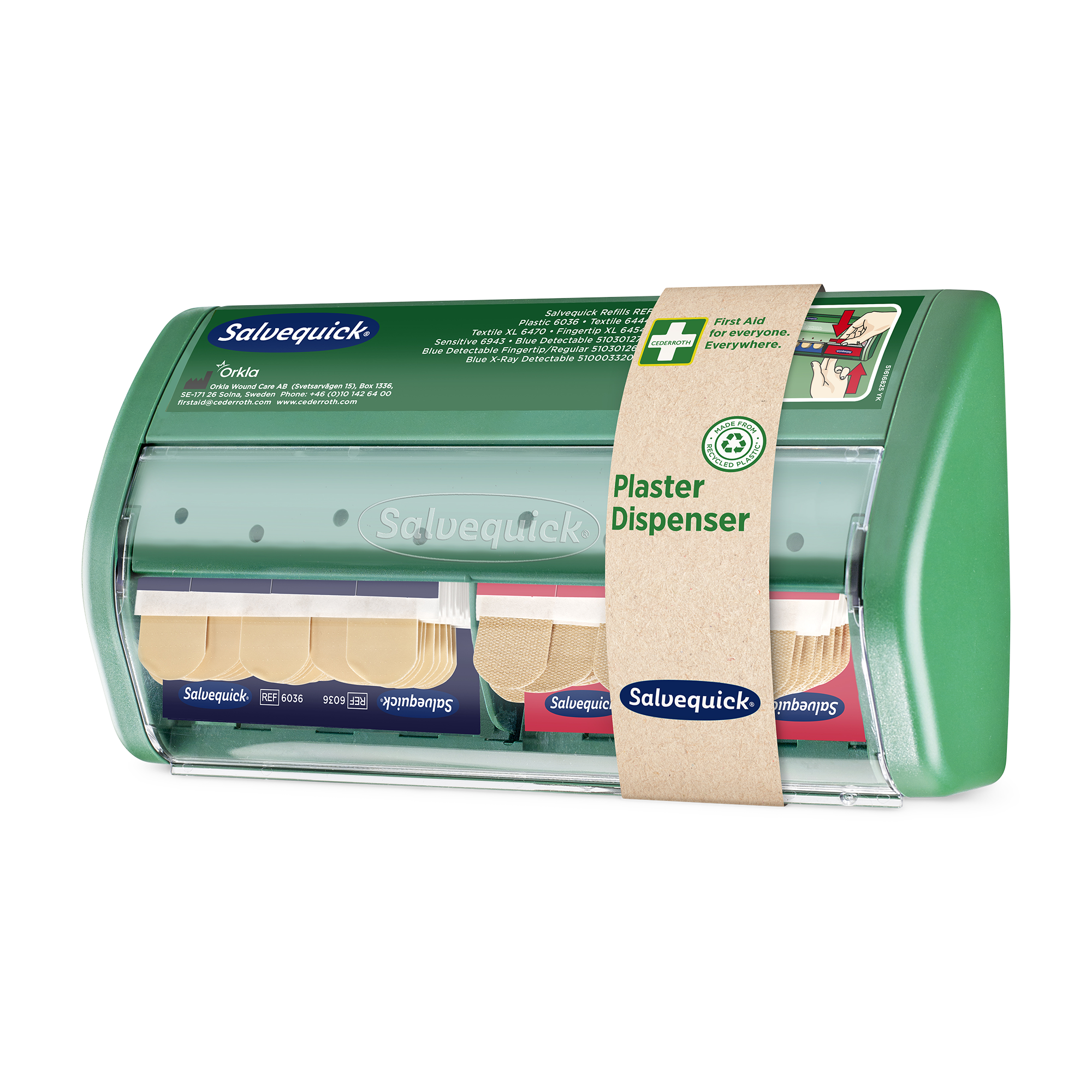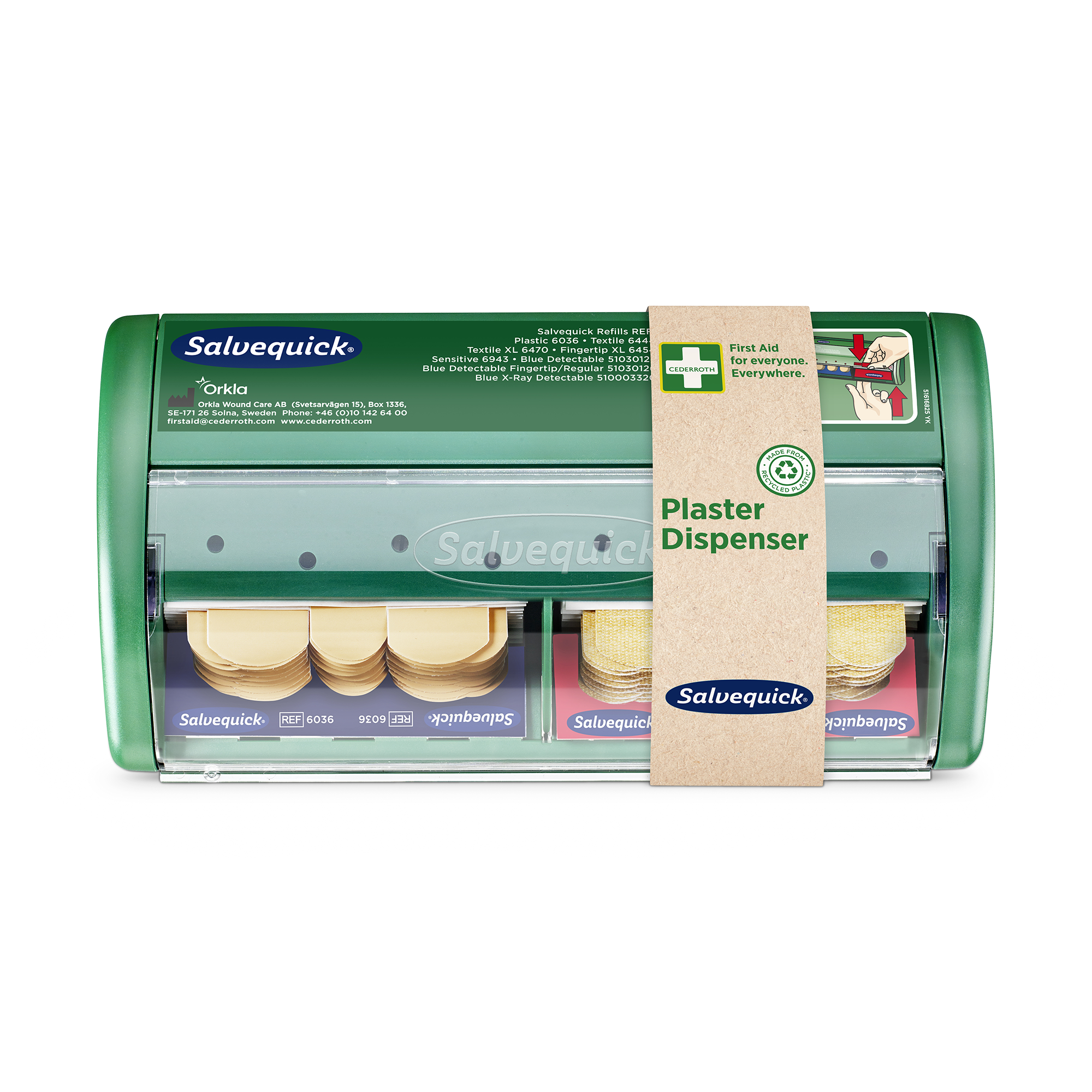 Im Salvequick Pflasterspender werden die Pflaster nach unten herausgezogen. So wird vermieden, dass die restlichen Pflaster durch Schmutz oder Blut verunreinigt werden. Die Salvequick Pflasterspender und Pflaster sind ein komplettes, benutzerfreundliches System. Die Pflaster sind immer einsatzbereit zur Hand. Die Nachfüllpackungen sind arretiert, wodurch Schwund vermieden wird. Der Salvequick Pflasterspender bietet hochwertige Qualität und ist benutzerfreundlich. Wenn das Pflaster aus dem Spender gezogen wird, löst sich das eine Schutzpapier. So kann das Pflaster mit nur einer Hand aufgeklebt werden. Mit einem Spezialschlüssel lässt sich der Spender schnell und einfach nachfüllen. Es stehen verschiedene Nachfüllpackungen zur Auswahl. Die durchsichtige Abdeckung schützt vor Staub und Feuchtigkeit. Inhalt: 40 Textilpflaster (REF 6444). 45 Wasserabweisende Pflaster (REF 6036). Jede Nachfüllpackung enthält Pflaster in zwei Größen: 72 x 19 mm und 72 x 25 mm. Ab Sommer 2025 besteht der Kunststoff in den Erste-Hilfe-Stationen und -Spendern von Cederroth zu >92 % aus recyceltem Kunststoff.