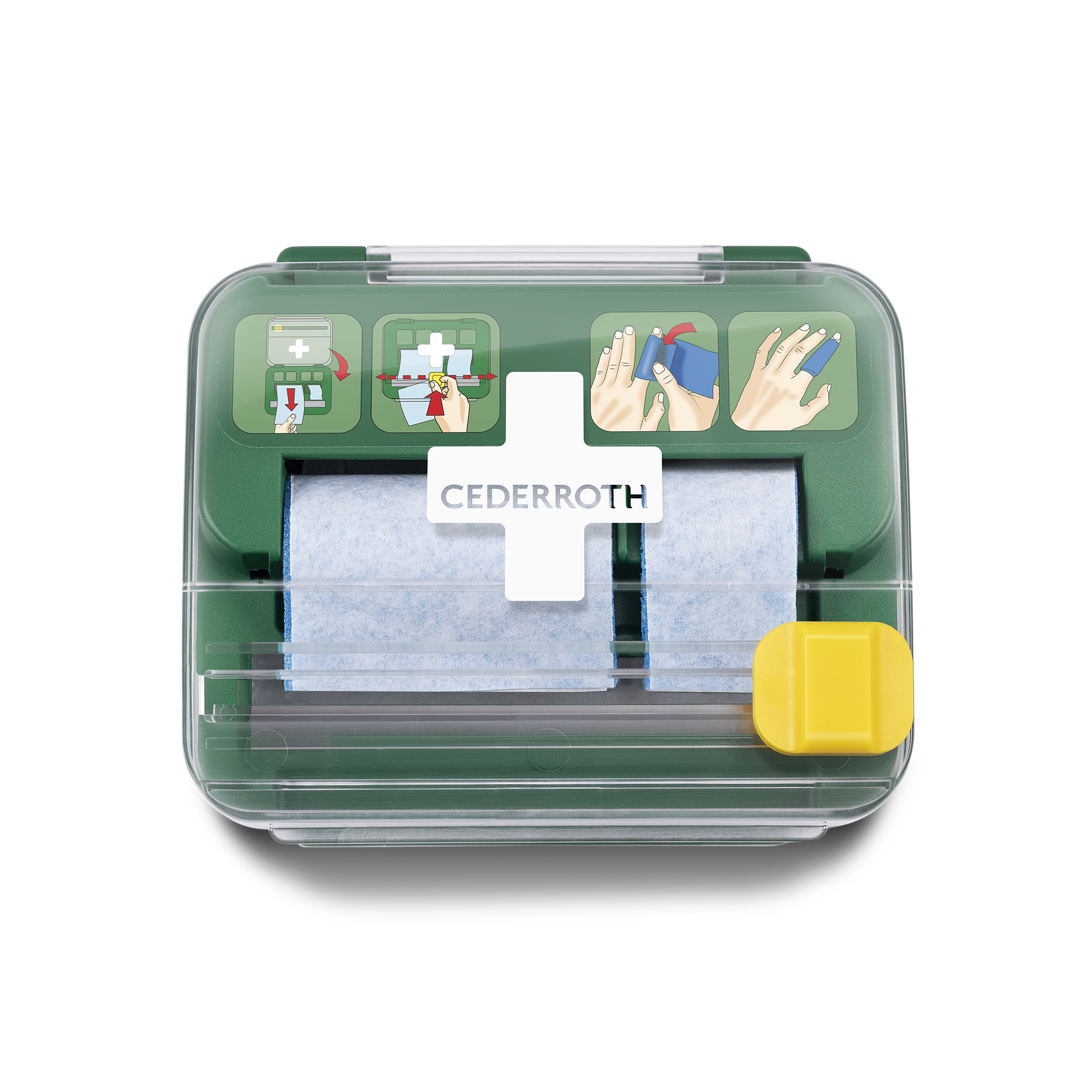 Cederroth Soft Foam Spender 2-in-1 mit zwei Größen von Cederroth Soft Foam Bandage- 6 cm x 4,5 m Blue und Cederroth Soft Foam Bandage 3 cm x 4,5 m Blue. In den Spender ist ein Schneidemesser integriert. Eine leicht verständliche Anleitung sorgt für eine einfache Anwendung. Dank seiner kompakten Größe lässt er sich auch in kleinen Räumen leicht an der Wand montieren. Der Spender ist abgeschlossen, um Schwund zu vermeiden. Mit dem Nachfüllschlüssel lässt er sich leicht öffnen. Eine transparente Abdeckung schützt die Produkte vor Staub und Schmutz. Abmessungen: B 14 x H 12 x T 14 cm. Inhalt: 1 x Cederroth Foam Bandage Blue 6 cm x 4,5 m (REF 51011010). 1 x Cederroth Soft Foam Bandage Blue 3 cm x 4,5 m (REF 51011022). Zwei Größen für eine flexible Wundversorgung. Einfache Anwendung. Integrierte Schneidevorrichtung. Leicht sichtbar, wann Nachfüllen erforderlich ist. Abgeschlossener Spender, leicht zu öffnen mit dem Nachfüllschlüssel.