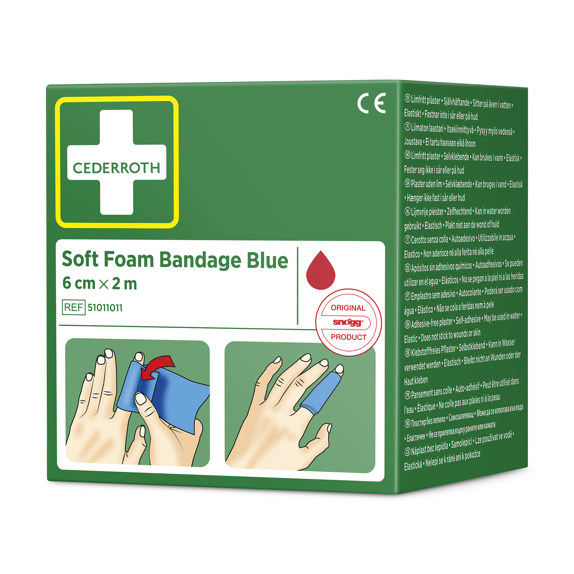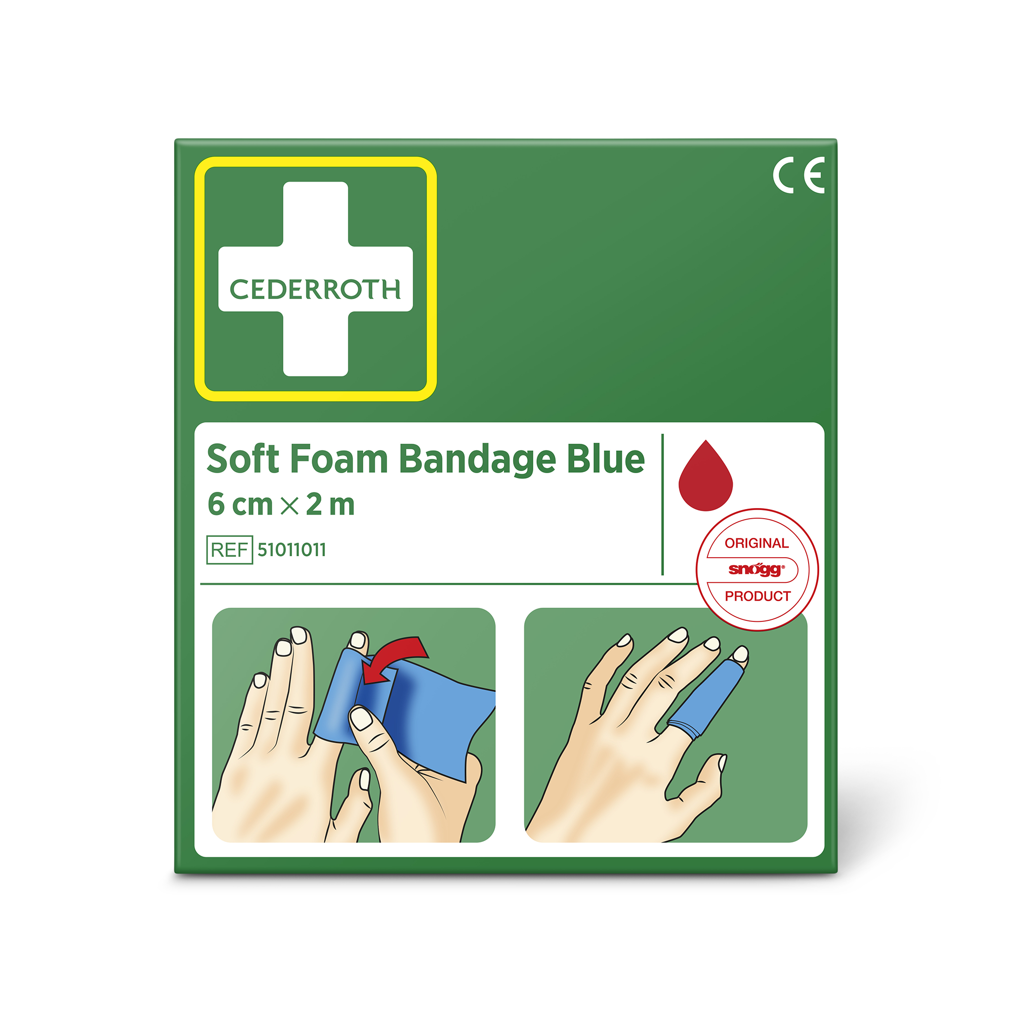 Cederroth Soft Foam Bandage Blue 6 cm x 2 m eignet sich als Pflaster und als Verband. Der Schnellverband, der auch bei Kälte, Hitze und Trockenheit sicher sitzt, eignet sich für alle Arten von kleineren Wunden. Cederroth Soft Foam Bandage ist ein selbsthaftendes Pflaster. Es ist klebstofffrei und klebt auf diese Weise nicht an Haut oder Haaren. Einfach passgenau abreißen und die verletzte Stelle verbinden. Bei starken Blutungen einen Druckverband anlegen. Hierzu ein Stück Soft Foam Bandage zu einem"polster" formen. Cederroth Soft Foam Bandage ist ideal für die schnelle und einfache Wundversorgung. Geeignet als Nachfüllpackung für die Cederroth First Aid & Burn Station (REF 51011003).