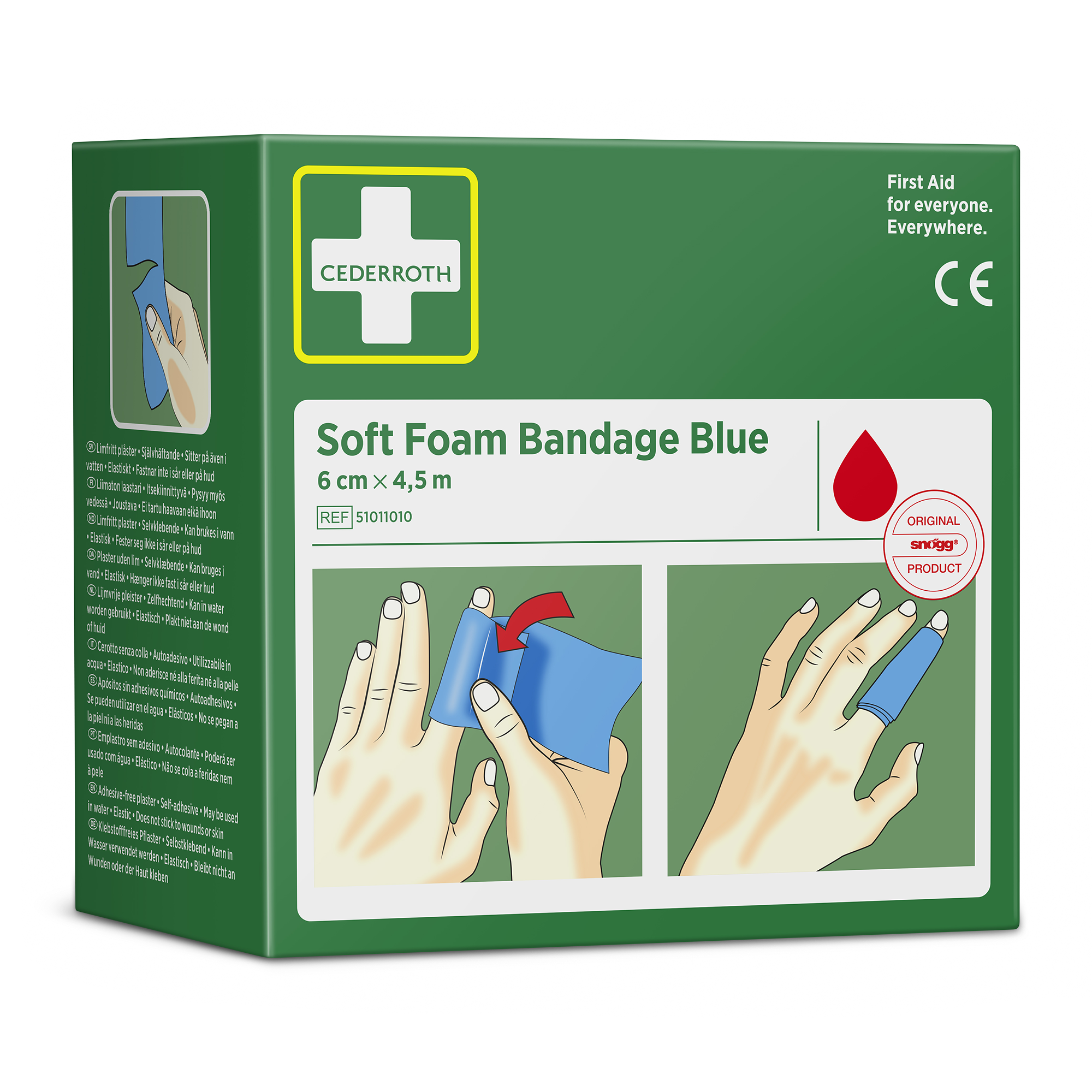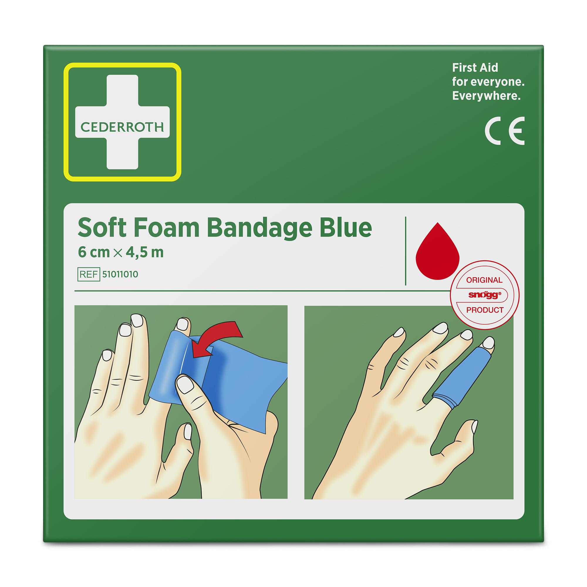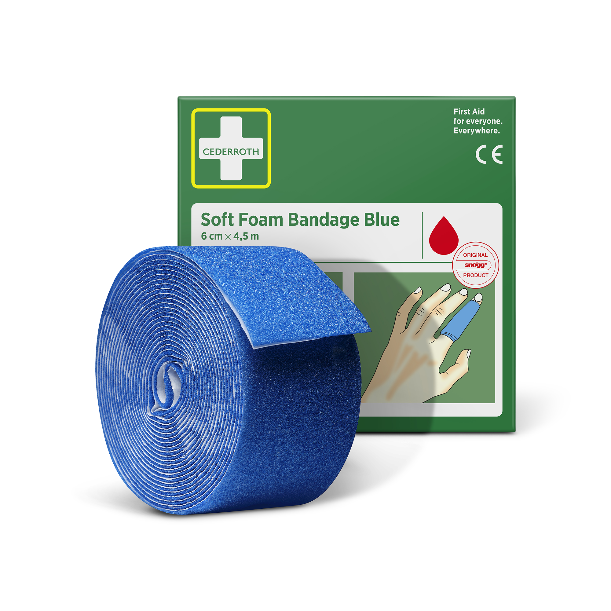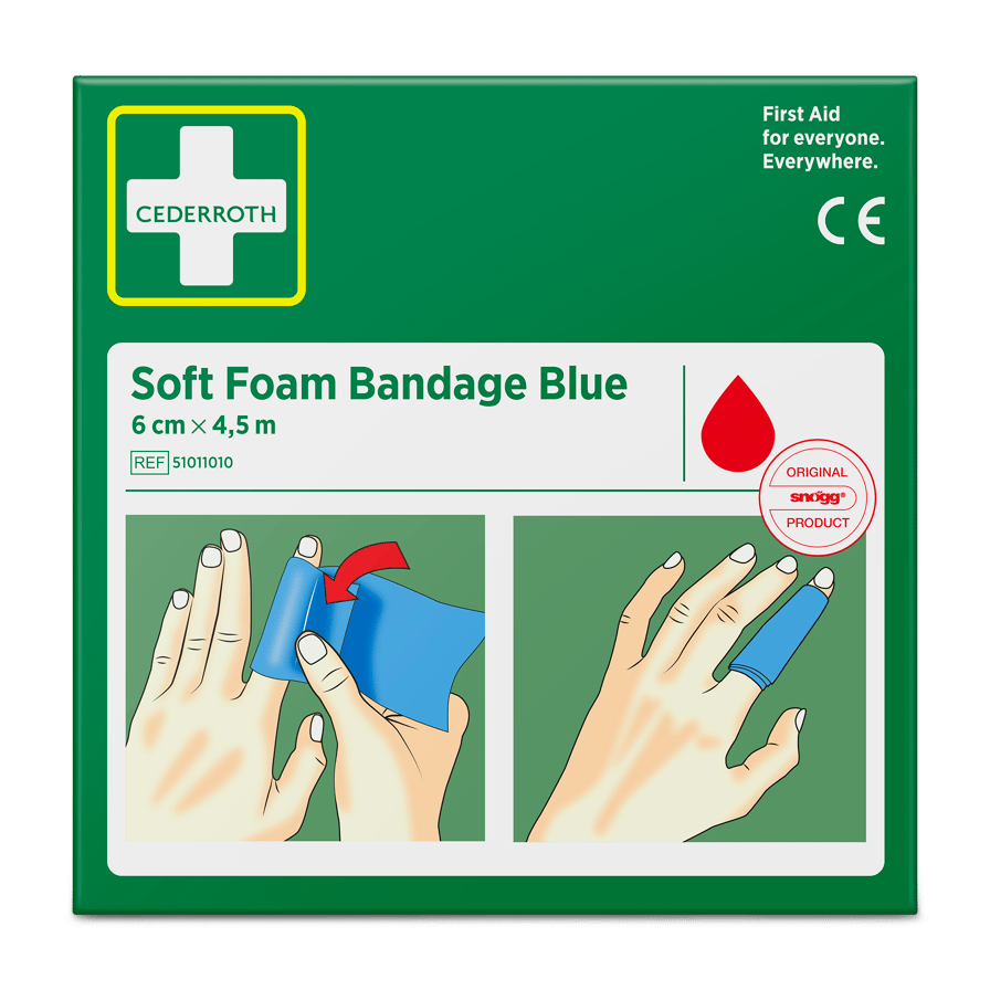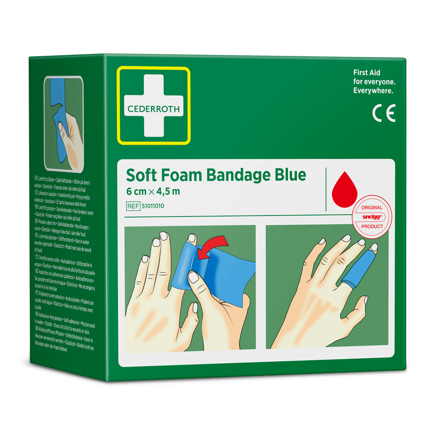 Cederroth Soft Foam Bandage Blue 6 cm x 4,5 m eignet sich als Pflaster und als Verband. Der Schnellverband, der auch bei Kälte, Hitze und Trockenheit sicher sitzt, eignet sich für alle Arten von kleineren Wunden. Cederroth Soft Foam Bandage ist ein selbsthaftendes Pflaster. Es ist klebstofffrei und klebt auf diese Weise nicht an Haut oder Haaren. Einfach passgenau abreißen und die verletzte Stelle verbinden. Bei starken Blutungen einen Druckverband anlegen. Hierzu ein Stück Soft Foam Bandage zu einem"polster" formen. Cederroth Soft Foam Bandage ist ideal für die schnelle und einfache Wundversorgung. Aufgrund der blauen Farbe ideal für den Lebensmittelbereich. Geeignet als Nachfüllpackung für die Wound Care Dispenser (REF 51011009 & 51011006) und den Cederroth Soft Foam Spender 2-in-1 (REF 510004108).