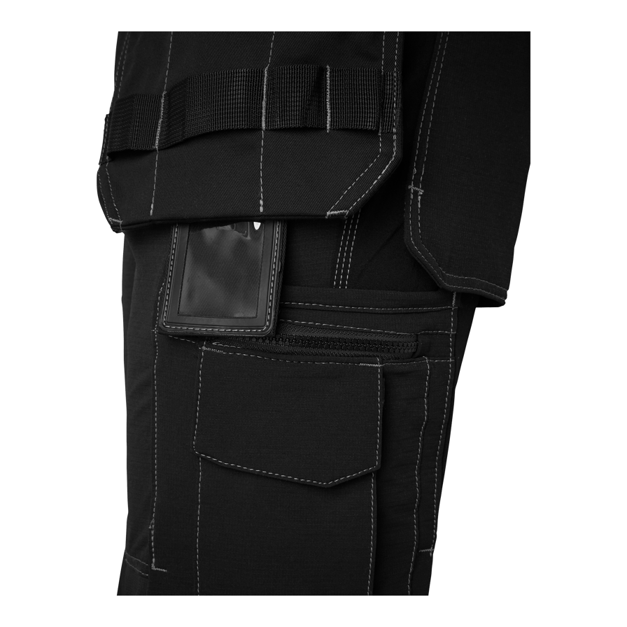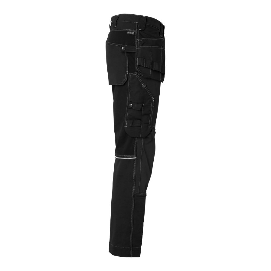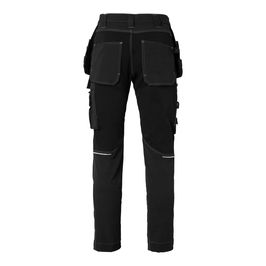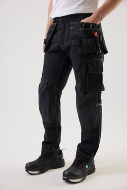 Handwerkerhose aus 4-Wege-Stretch mit vorgeformten Beinen und Cordura®-Knietaschen. Zwei Vordertaschen, verstärkte Gesäßtaschen, lose hängende Nageltaschen mit zusätzlichen Fächern, Beintasche mit Reißverschluss und reflektierendes Detail an der Rückseite. Ideal für anspruchsvolle Arbeitsumgebungen.