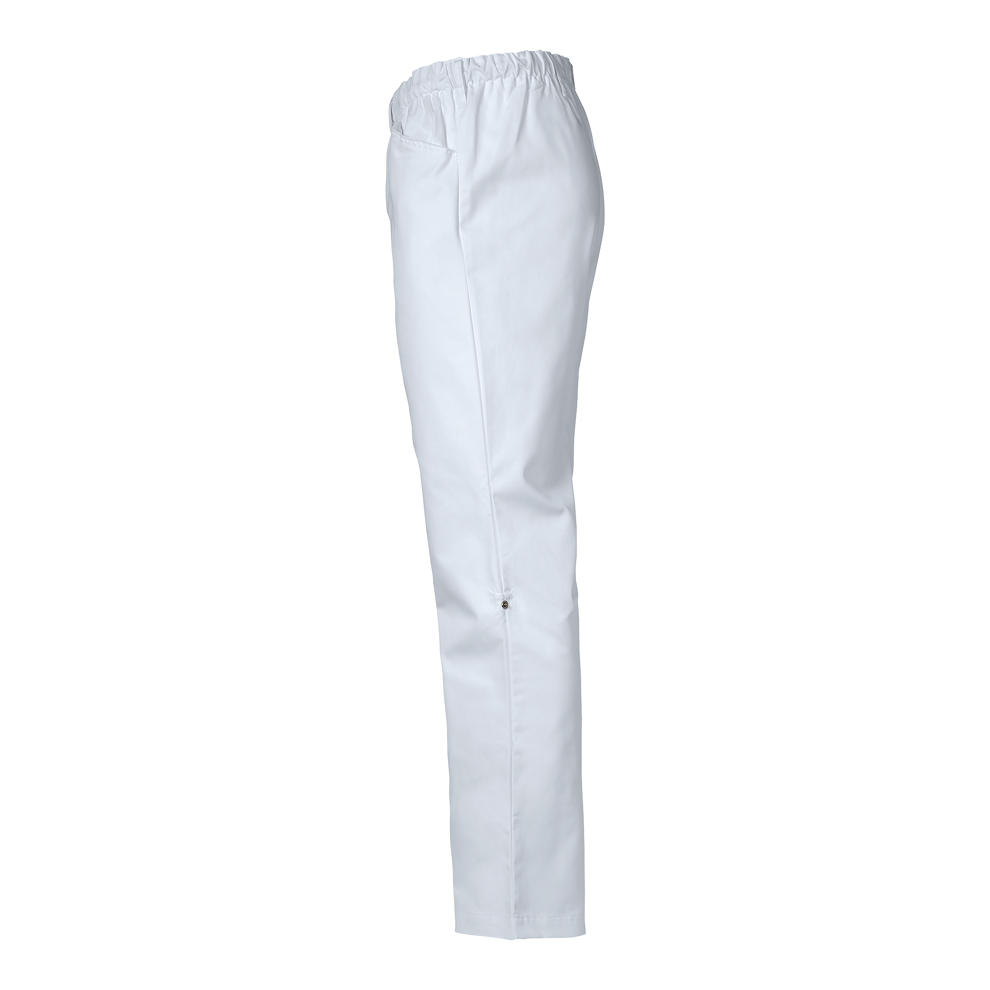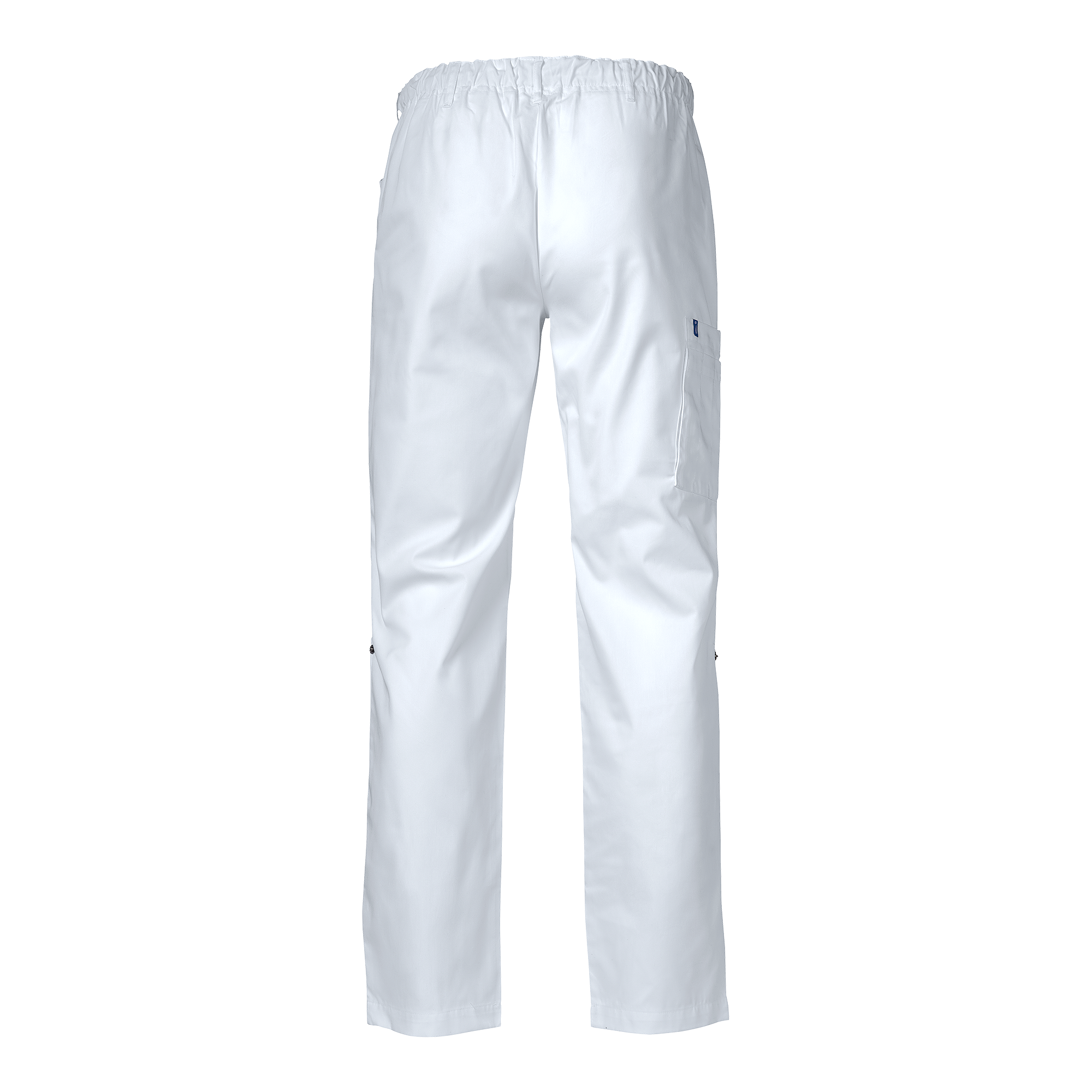Geräumige Unisex-Hose mit elastischem Bund und Kordelzug. Ausgestattet mit Beinzwickel zur Anpassung an Hochwasserhosen, eingelassenen Vordertaschen und doppelter Beintasche mit Stifttaschen.