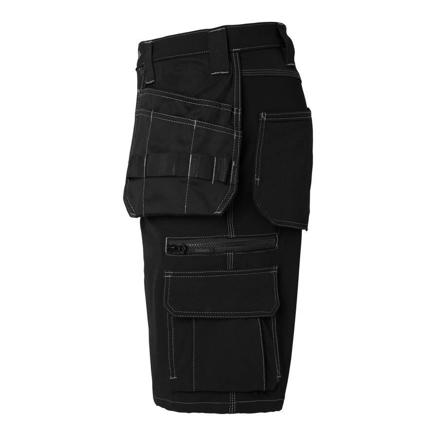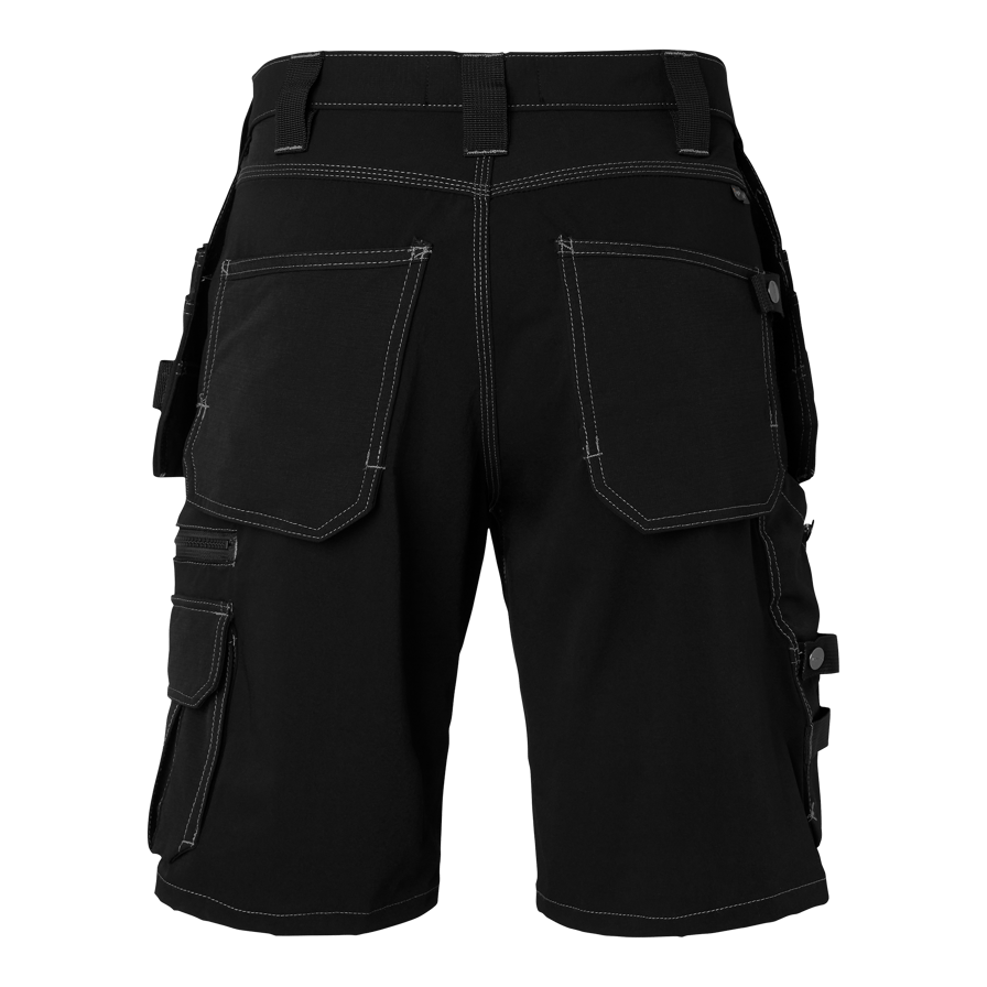 Shorts mit moderner Passform und 4-Wege-Stretch. Zwei Vordertaschen, verstärkte Gesäßtaschen, Nageltaschen mit Extrafach, Beintasche mit Handytasche, und Zollstocktasche mit Messerhalter. Ideal für Arbeiten in warmen Umgebungen.
