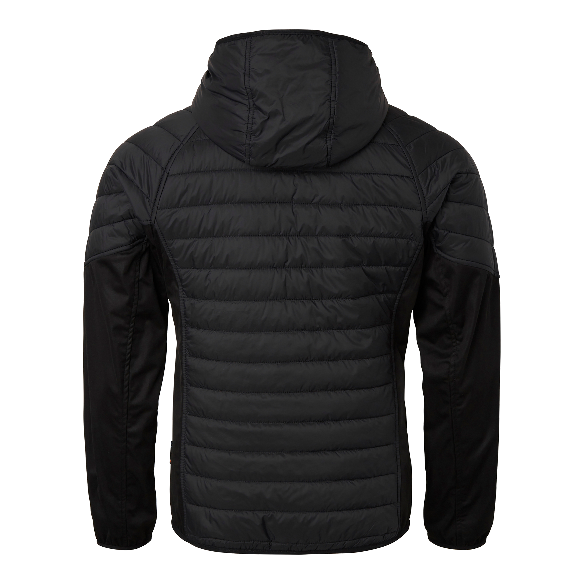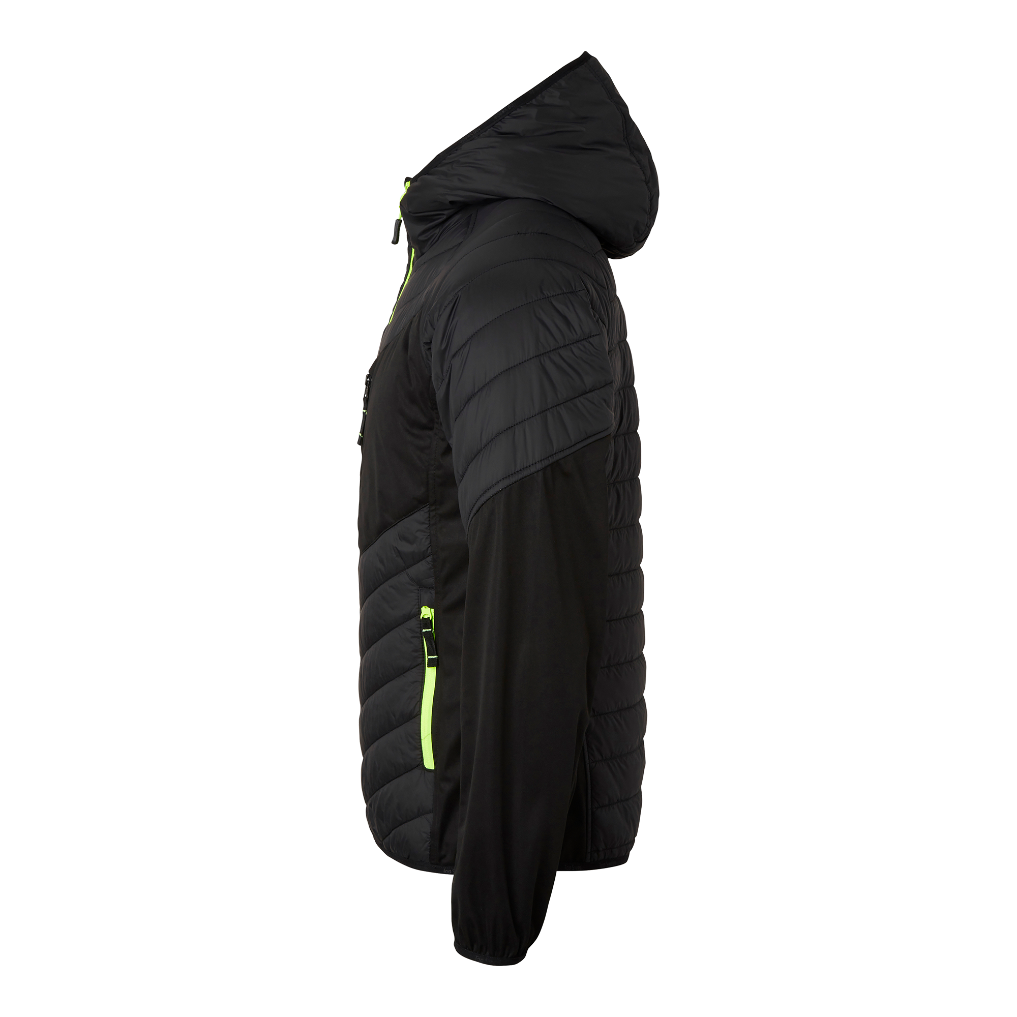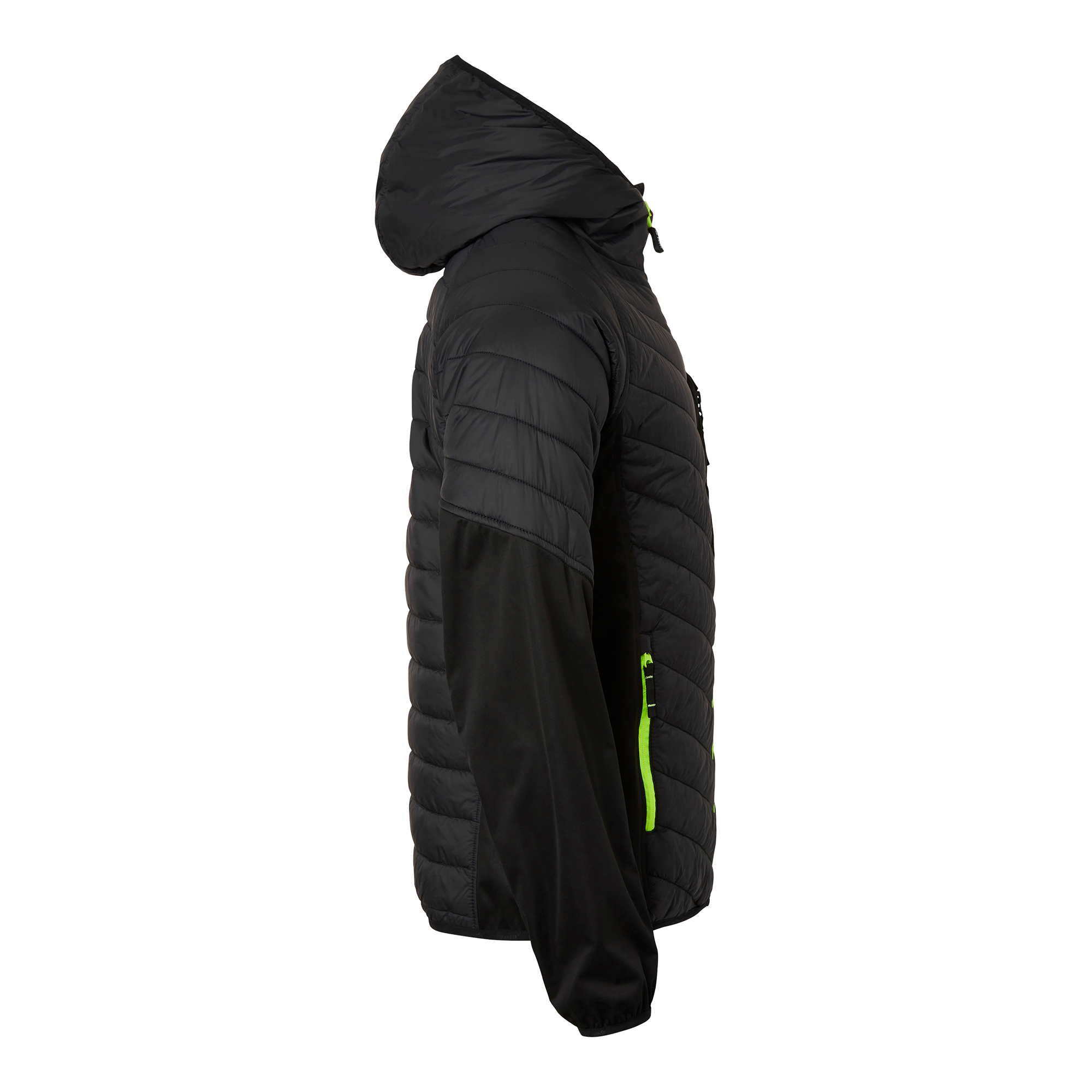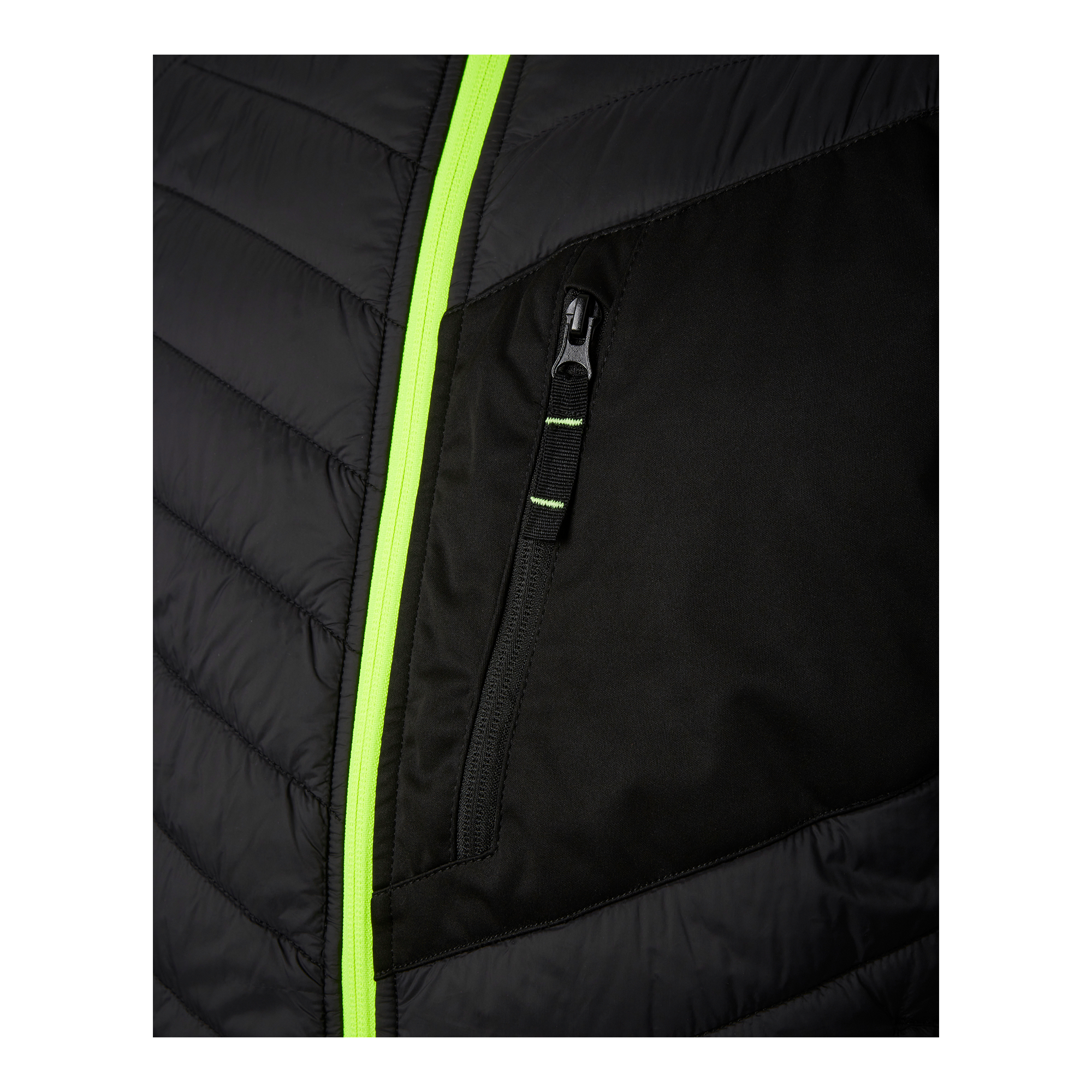 Moderne, gesteppte leichtgewichtige Jacke mit Kapuze und Daunengefühl. Stretch-Softshell-Einsätze an den Seiten, Unterarmen und Achseln. Zwei Vordertaschen und eine Brusttasche mit Reißverschluss. Elastische Manschetten und Saum sorgen für Komfort. Ideal für die Arbeit in wechselnden Arbeitsumgebungen.