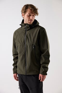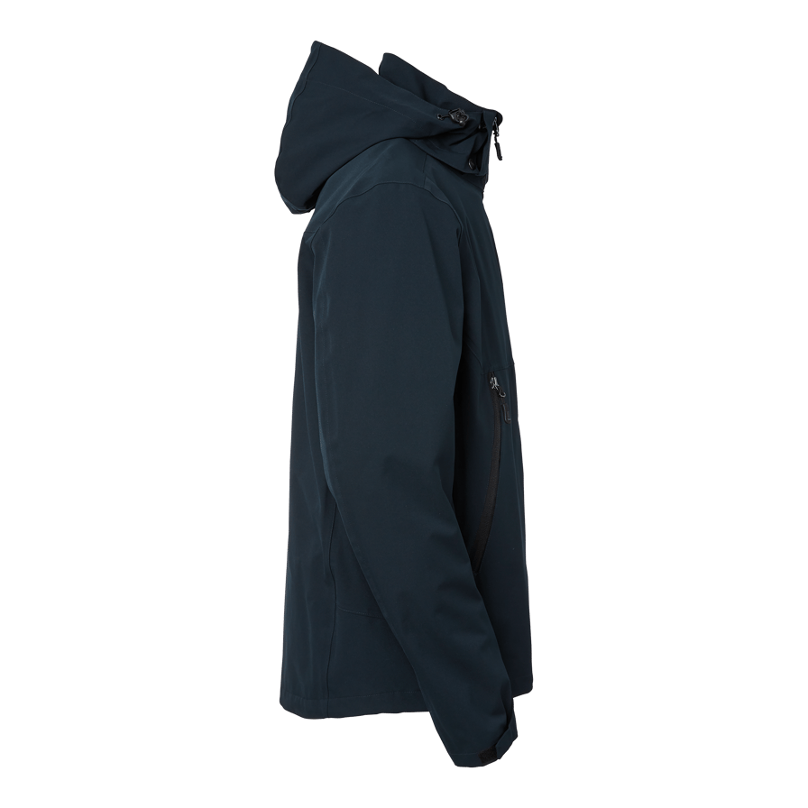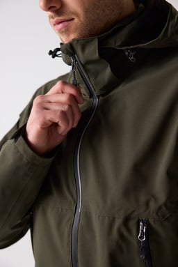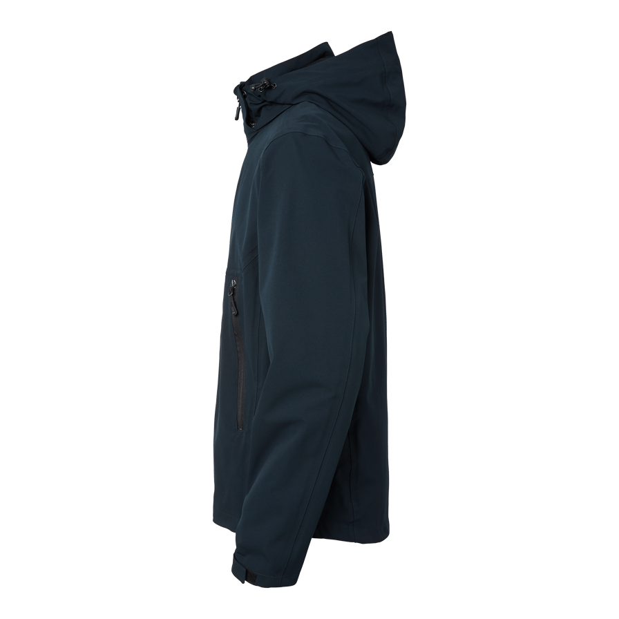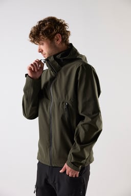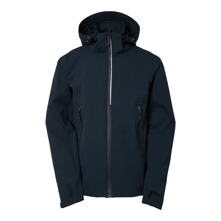 Wind- und wasserabweisende Shelljacke mit verstärkten Nähten und wasserdichtem Reißverschluss mit reflektierenden Details. Weiches Material mit mechanischem Stretch. Abnehmbare Kapuze und verstellbare Manschetten. Zwei Seitentaschen und eine Innentasche mit Reißverschluss.