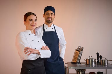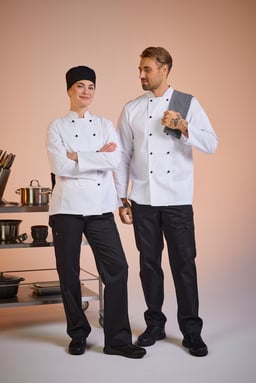 Die Este Kochmütze ist eine Kochmütze mit einem Netzteil oben für bessere Belüftung. Sie verfügt über eine faltbare Krempe und lässt sich hinten mit Klettverschluss verstellen. Erhältlich in den Größen 55–57 cm und 58–60 cm.