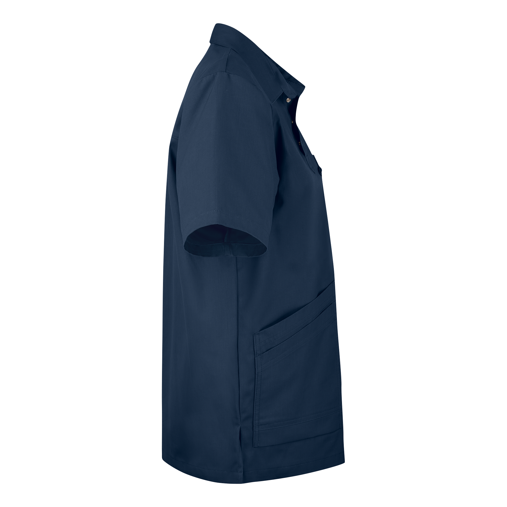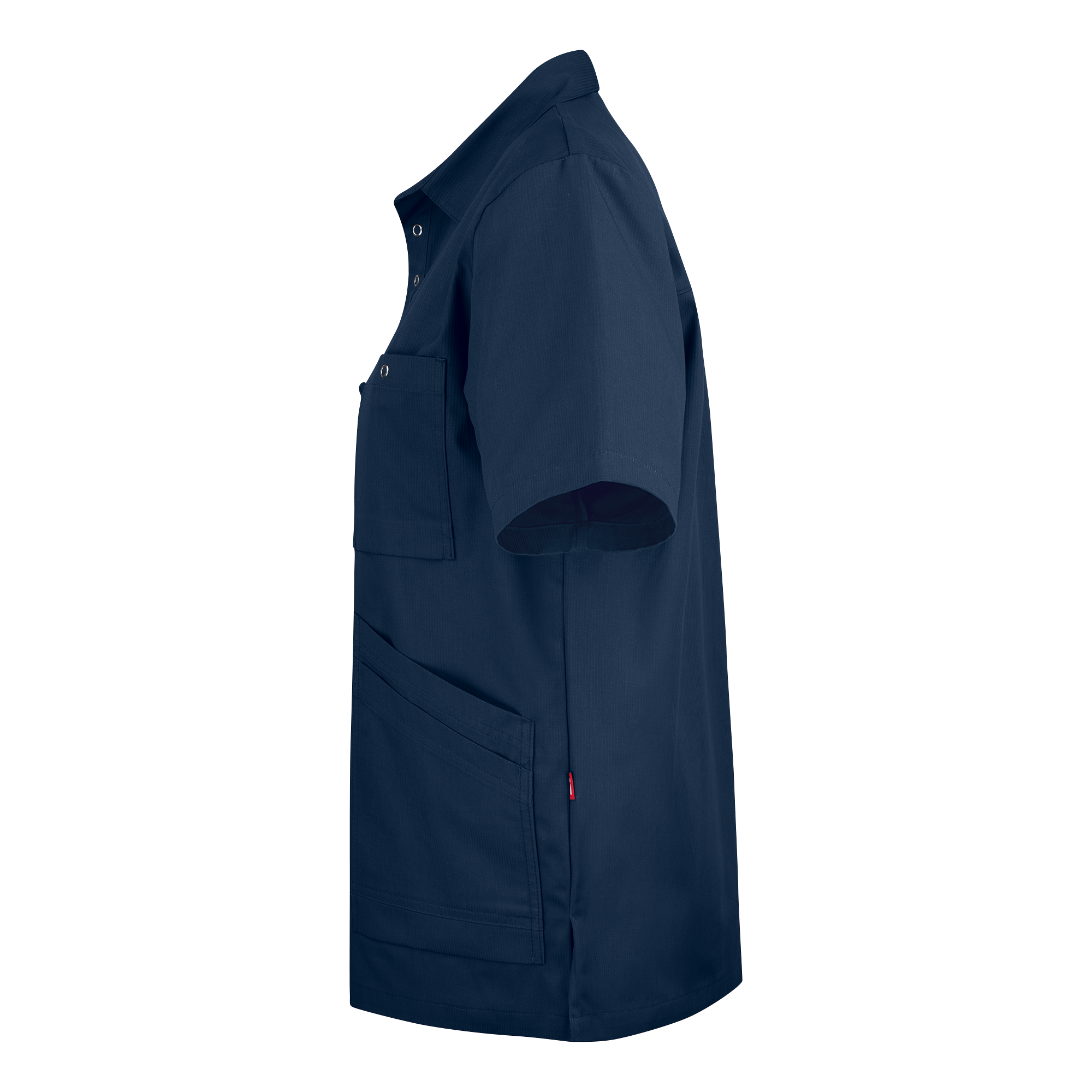 Geräumiges Unisex-Shirt mit Kragen und Ringknöpfen. Doppelte schräge Vordertaschen, davon eine mit Schlüssel-/Kartenhalter. Brusttasche mit Ringdruckknopf und Seitenschlitzen für mehr Bewegungsfreiheit. Seitenschlitz.
