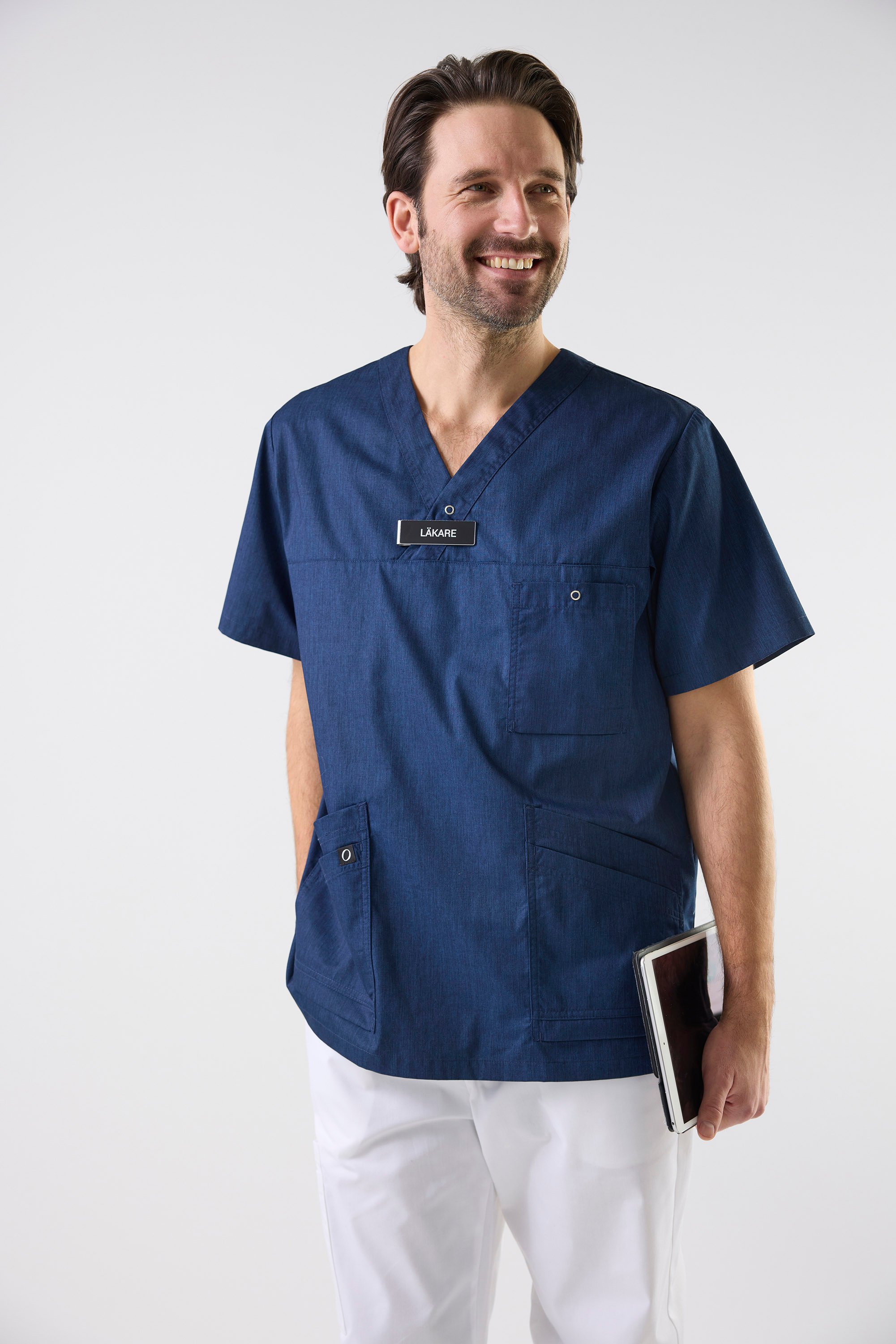 Unisex-V-Tunika in bequemer und großzügiger Passform. Doppelte schräge Vordertaschen und Brusttasche mit Faltenbalg, Schlüsselhalter und Ringknöpfen. Seitenschlitze.
