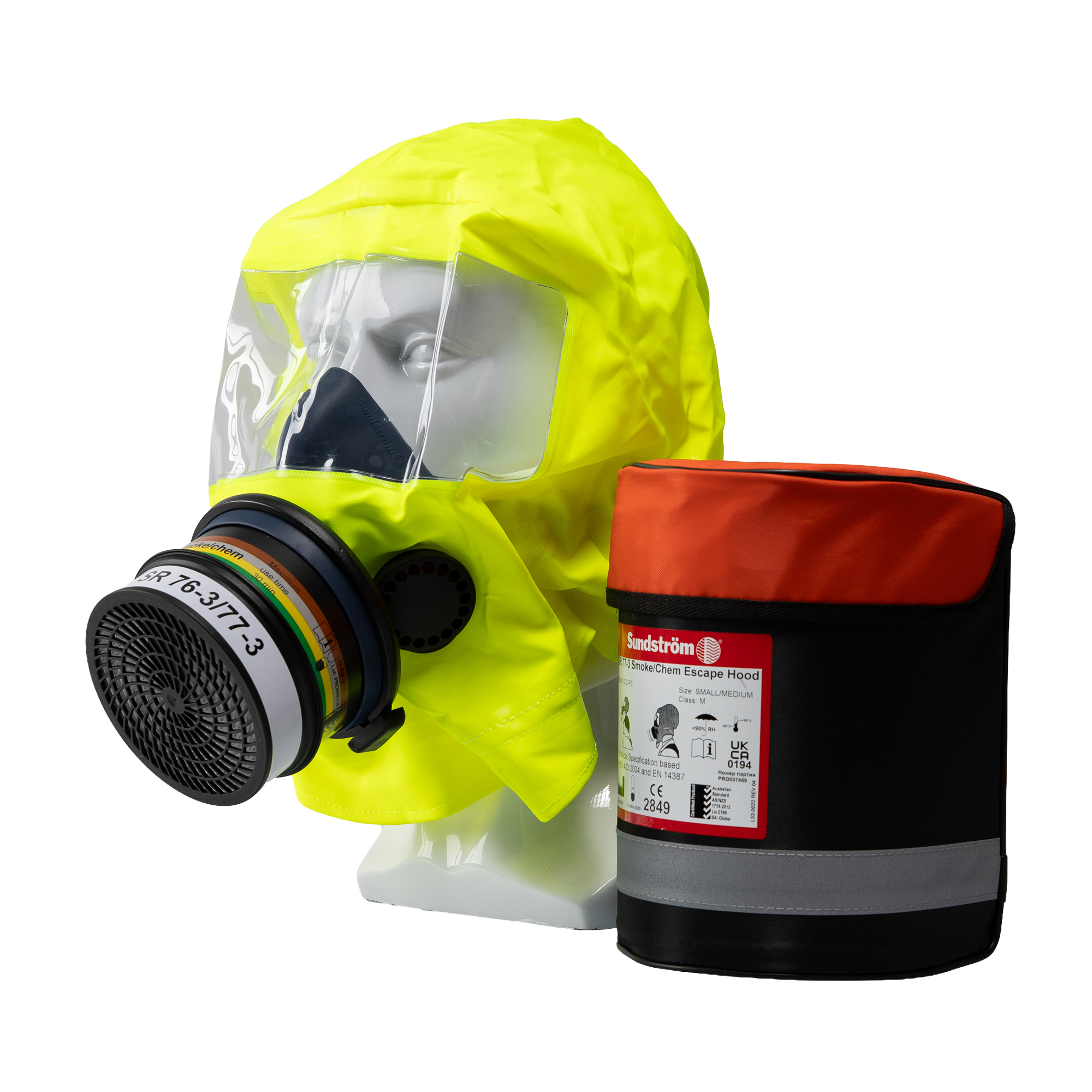 Rettungshaube mit Filter für den Einsatz bei Brand oder chemischen Freisetzungen.