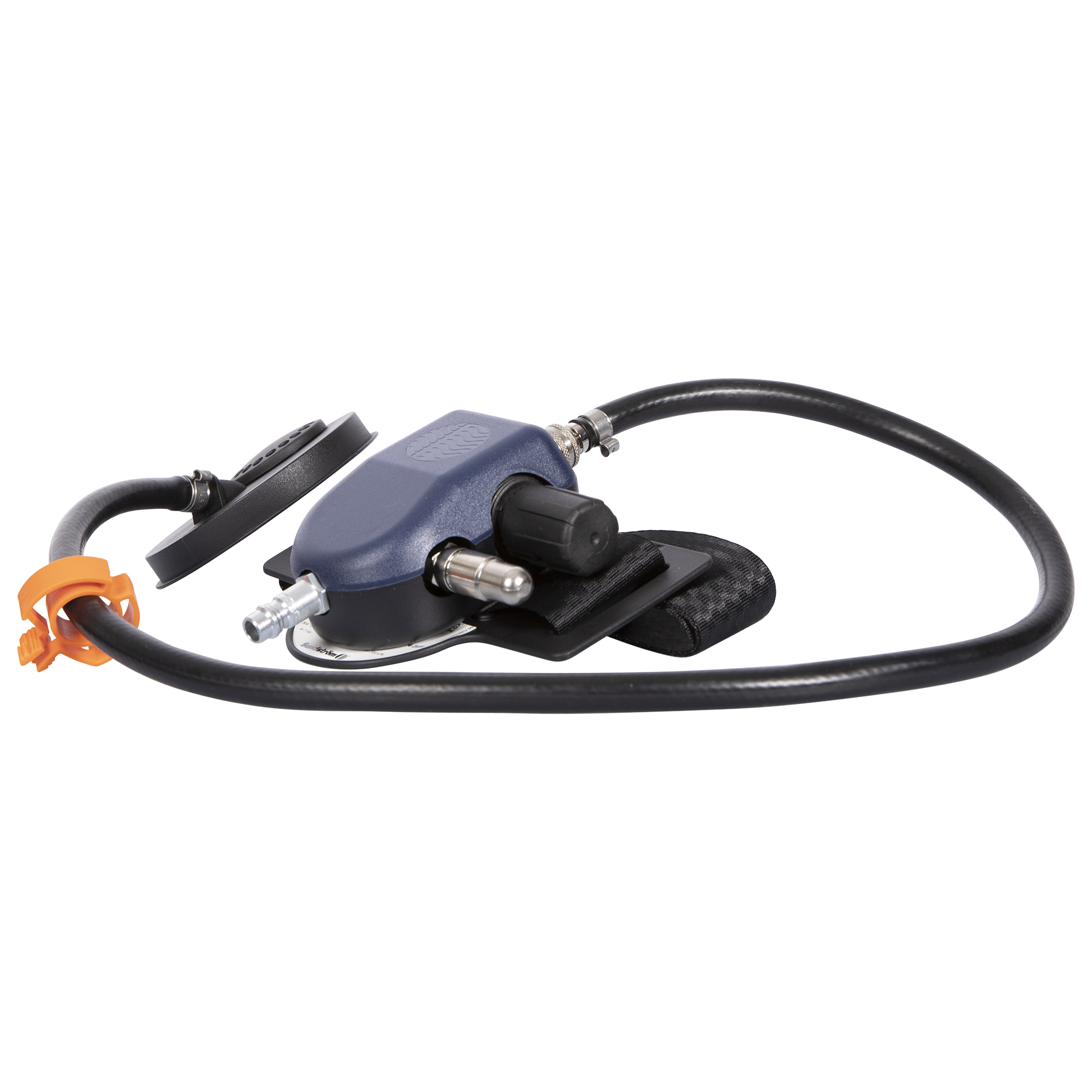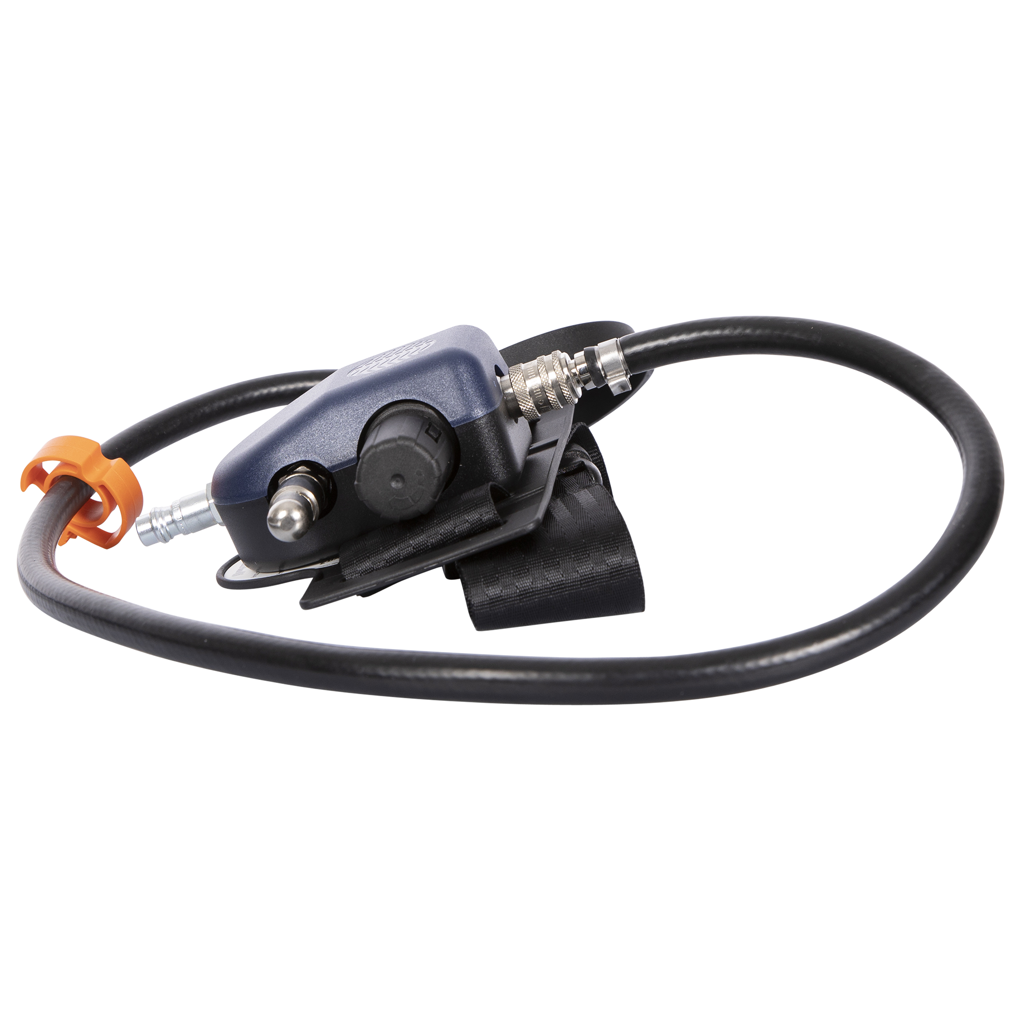 Zubehörgerät, welches den Wechsel zwischen Filterschutz und Druckluftversorgung in der selben Gesichtsmaske ermöglicht. Am Gürtel befestigtes Regelventil.