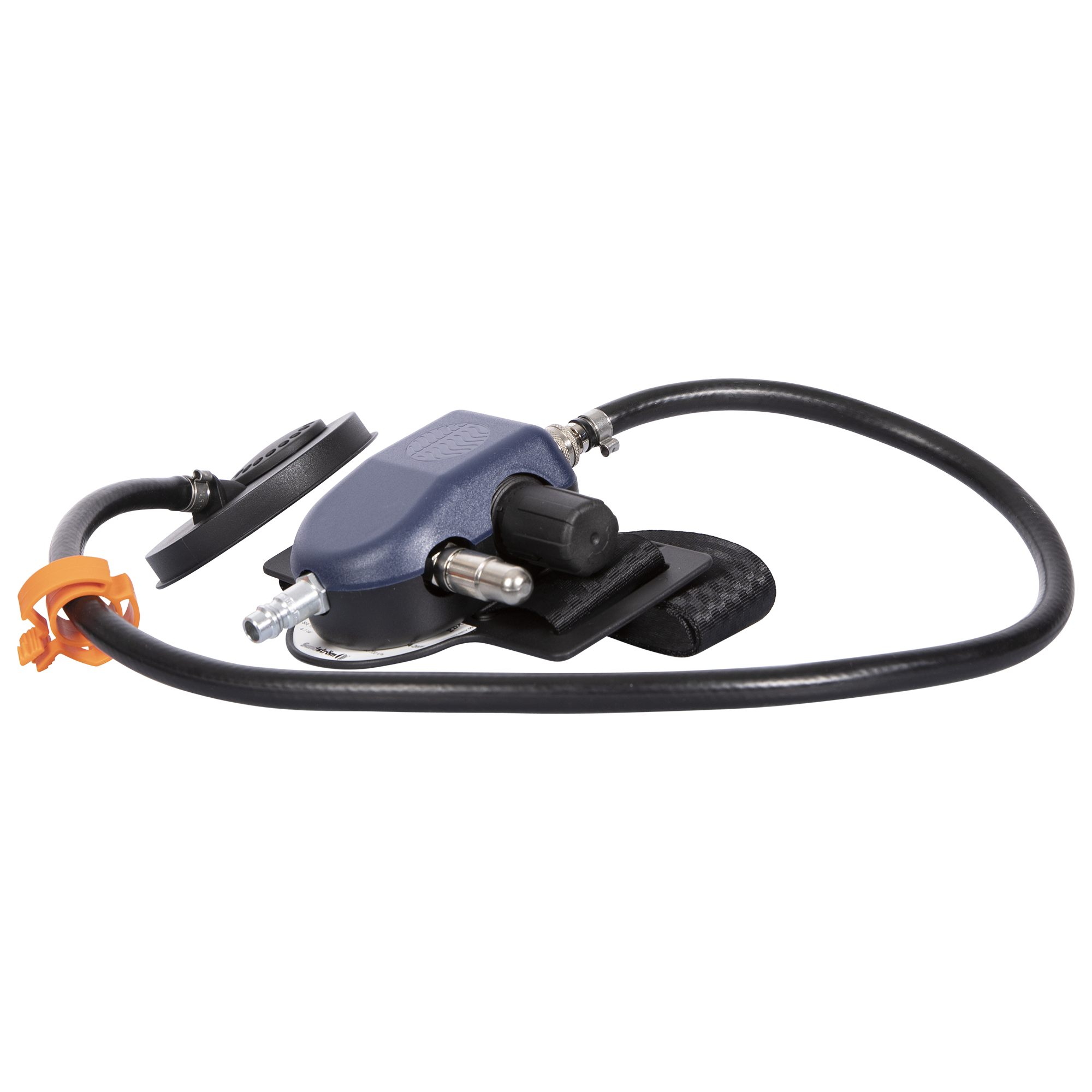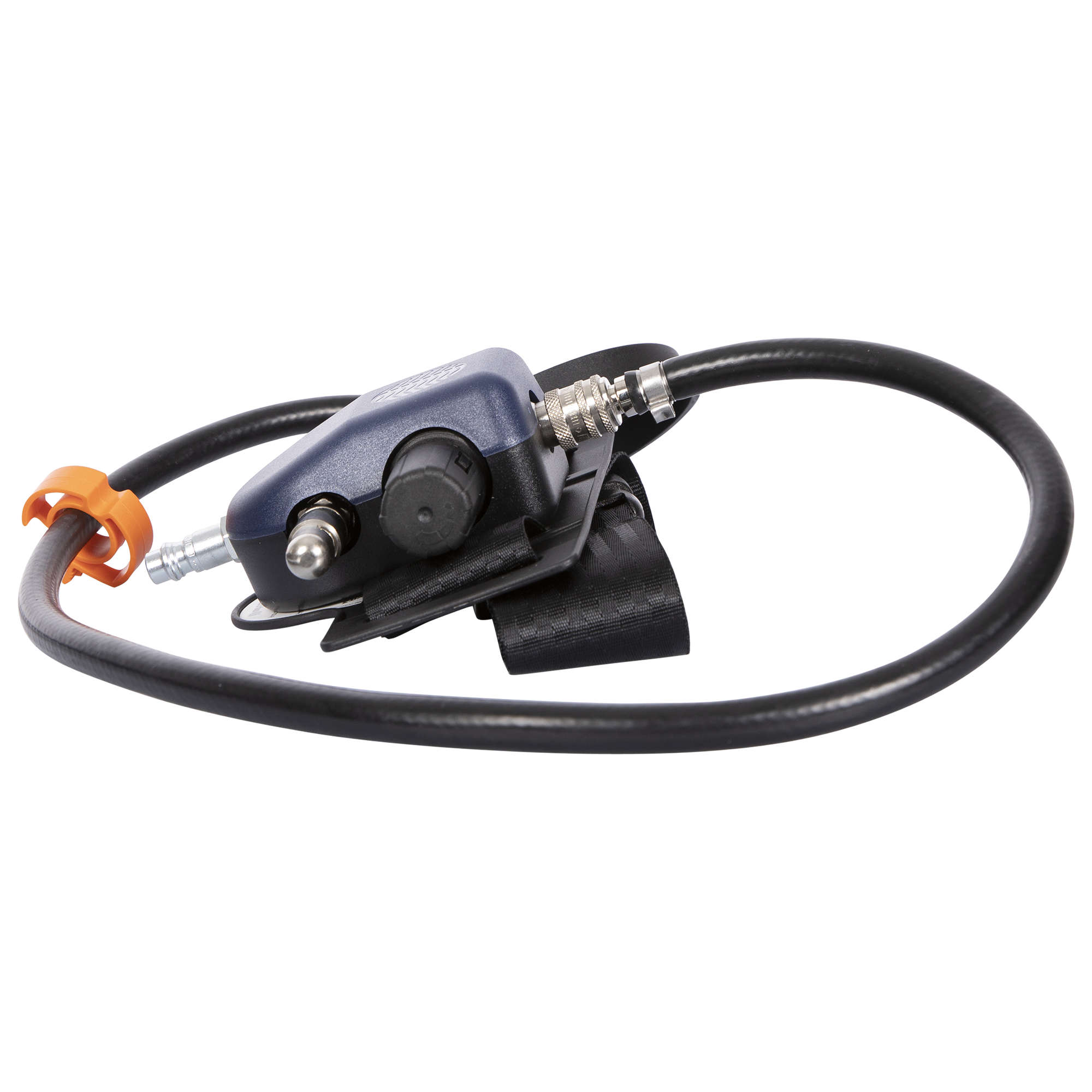 Zubehörgerät, welches den Wechsel zwischen Filterschutz und Druckluftversorgung in der selben Gesichtsmaske ermöglicht. Am Gürtel befestigtes Regelventil.