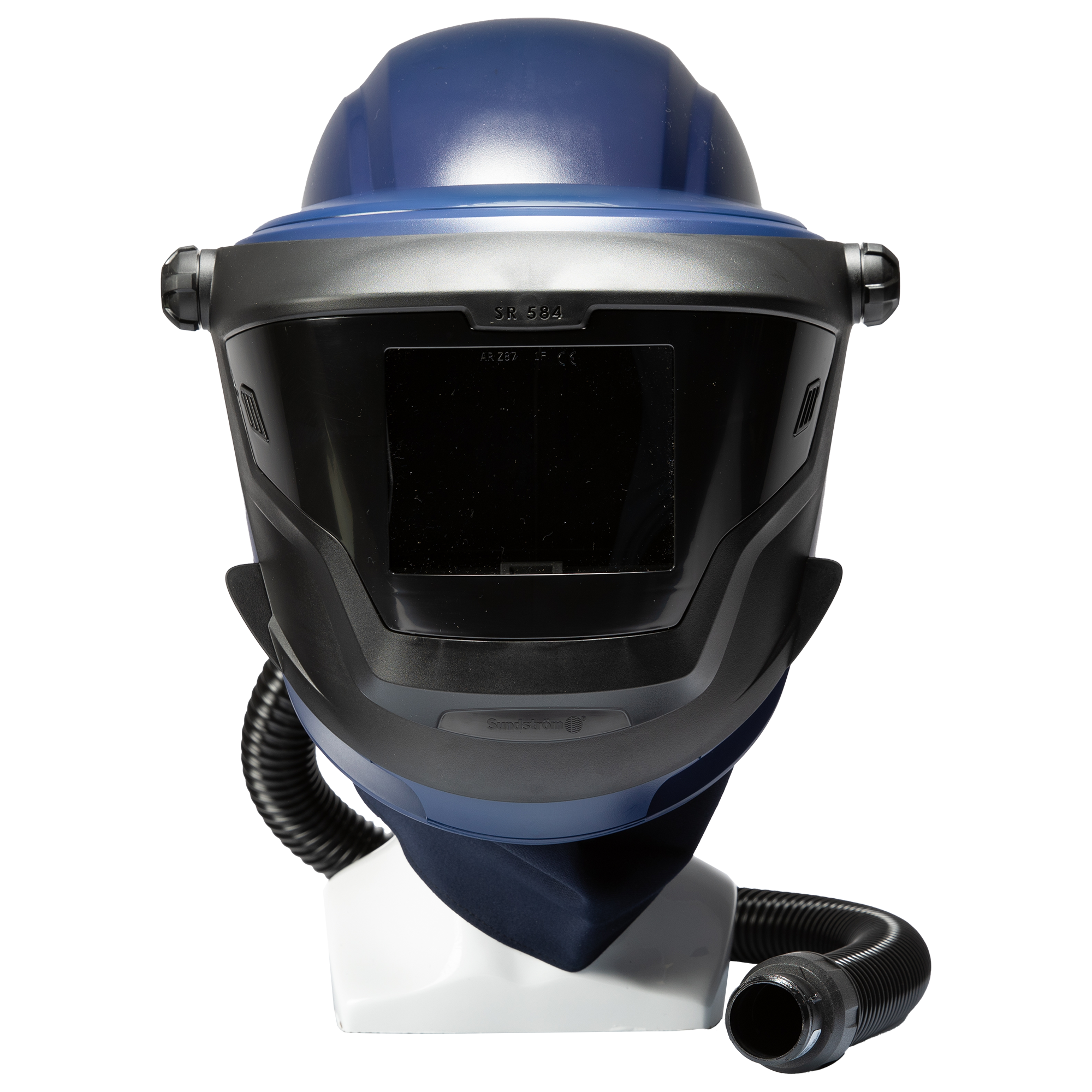 Das Schweißschutzvisier SR 584 ist zur Verwendung mit dem Sundström SR 580-Helm mit Visier vorgesehen. Der komplette Helm mit Schweißschutzvisier ist zusammen mit dem batteriebetriebenen Gebläse SR 500 oder SR 700 und zugelassenen Filtern in den gebläseunterstützten Atemschutzsystemen von Sundström enthalten. Der Atemschlauch des Helms mit Visier muss an das mit Filtern ausgestattete Gebläse angeschlossen werden. Der Überdruck im Visier des Helms verhindert, dass Partikel und sonstige Schmutzstoffe in den Atembereich geraten. Die Produkte können auch zusammen mit dem Druckluftzusatz SR 507 verwendet werden. Eine derartige Kombination stellt ein Atemgerät mit kontinuierlichem Luftstrom für Druckluftanschluss dar (siehe gesonderte Produktbroschüre SR 507). Die verschiedenen Kombinationen bieten Schutz vor schädlichen Gasen oder Partikeln, Strahlung und Spritzern beim Schweißen, Brennschneiden, Schleifen und ähnlichen Arbeiten. Durch ihr Design sind sie auch für Arbeiten in begrenzten und schlecht zugänglichen Bereichen geeignet. Diese Ausrüstung kann als Alternative für Filterrespiratoren in allen Situationen verwendet werden, in denen diese empfohlen werden. Dies gilt insbesondere für schwere Arbeiten, Arbeiten bei hohen Temperaturen und lang andauernde Arbeiten. Vor Gebrauch muss ein Schweißglas mit geeigneter Dichte am Schweißschutzvisier angebracht werden. Das SR 584 wird mit einem Schweißglas mit Tönung Nr. 10 und einer Vorsatzscheibe aus Polycarbonat geliefert. Die Scheibe muss CE-gekennzeichnet sein und der Standardgröße 90 x 110 mm entsprechen. Zubehör steht in Form von automatischen Schweißgläsern, Korrektionsgläsern, Hals- und Brustschutz sowie Schlauchschutz zur Verfügung.