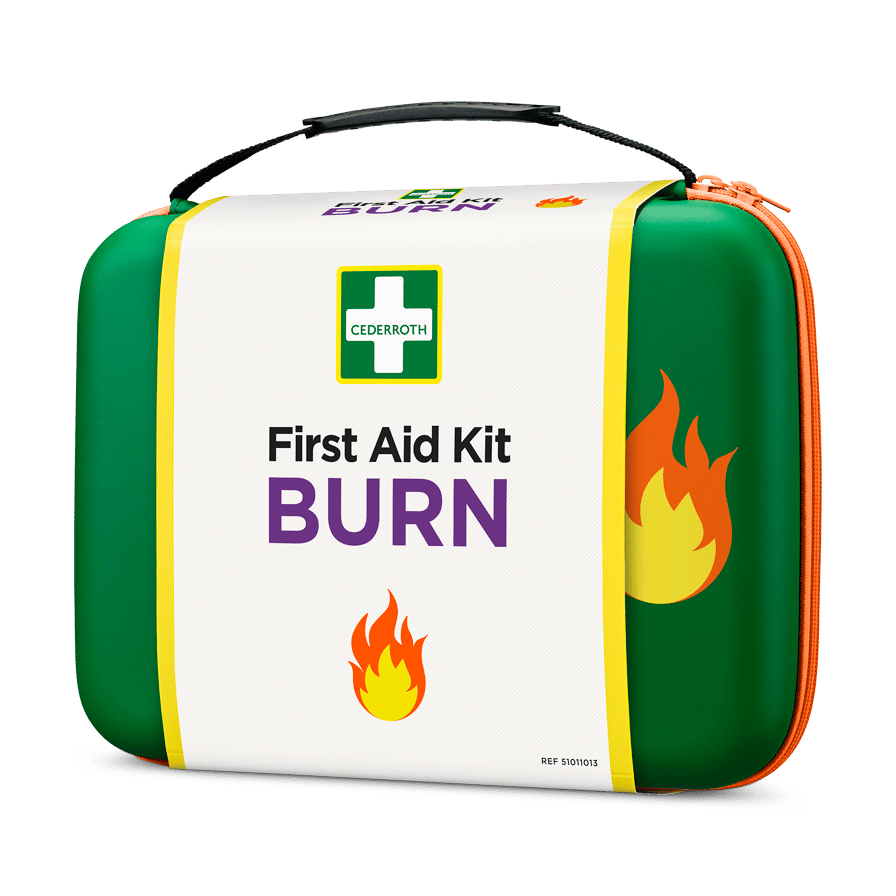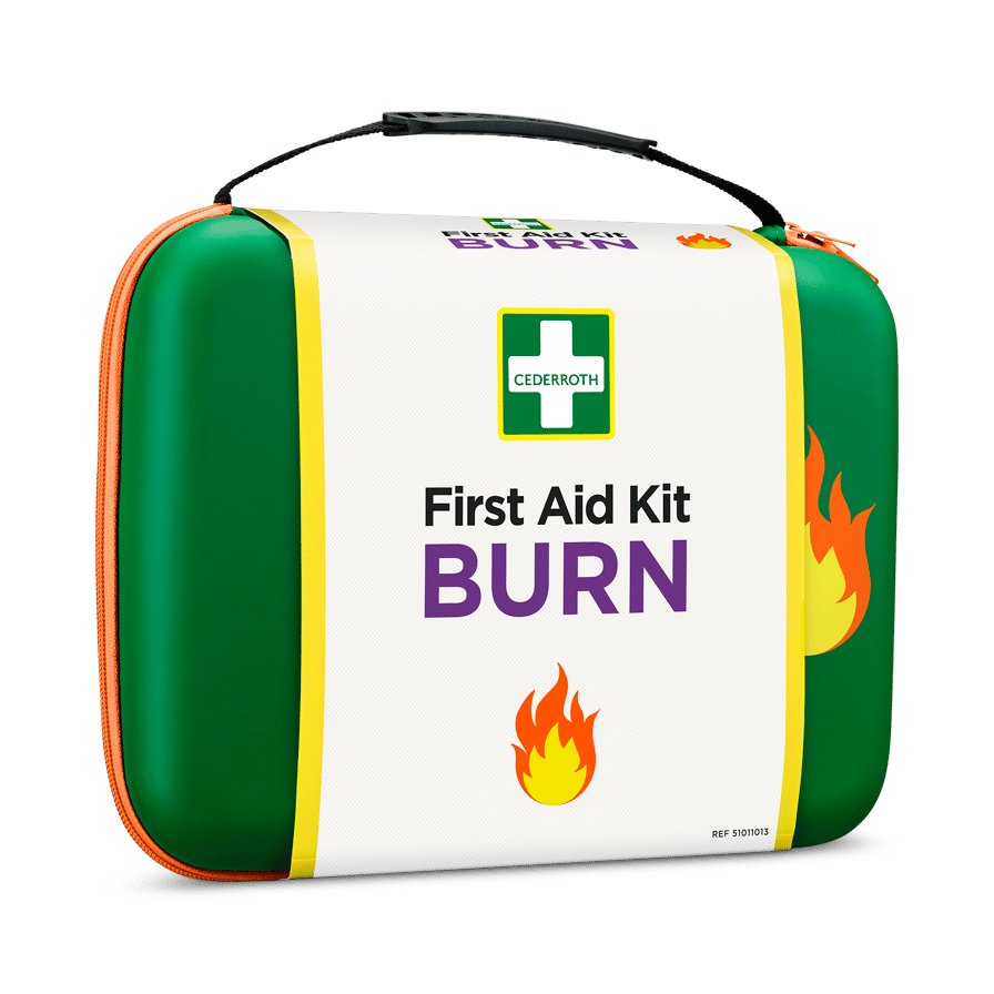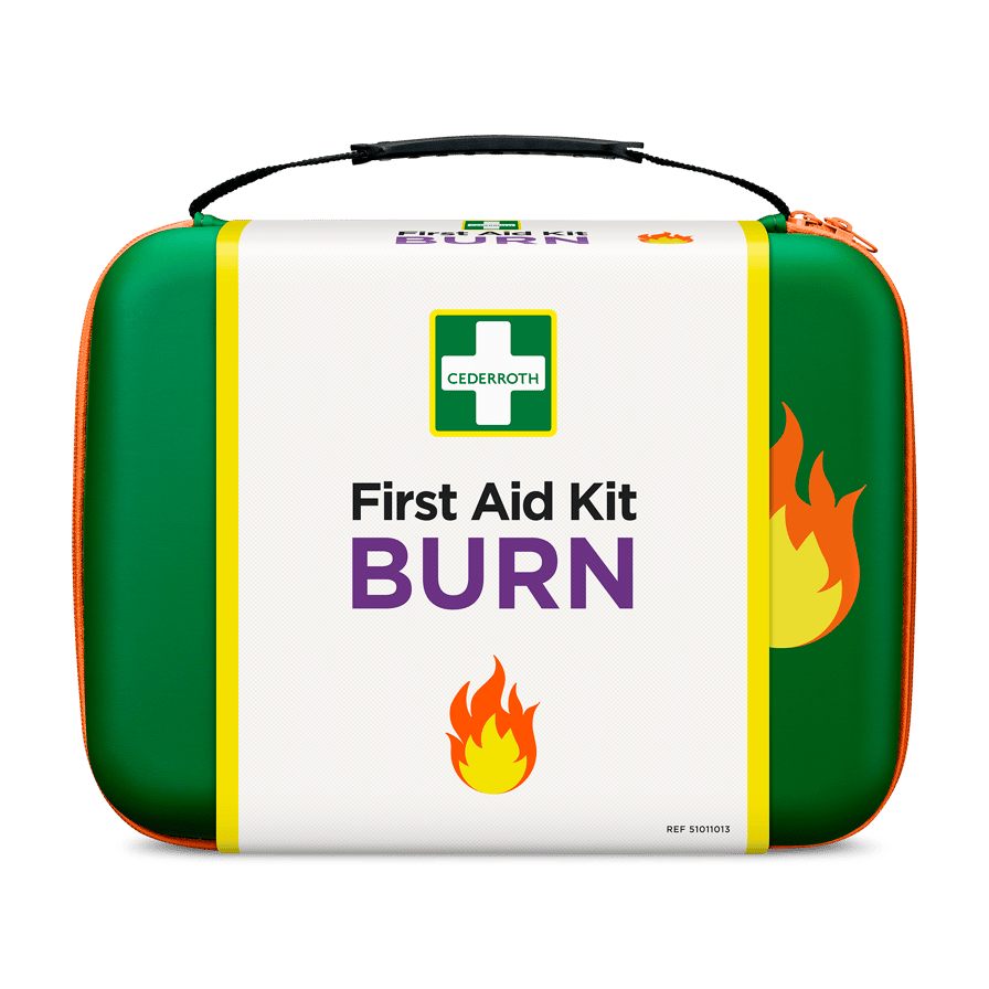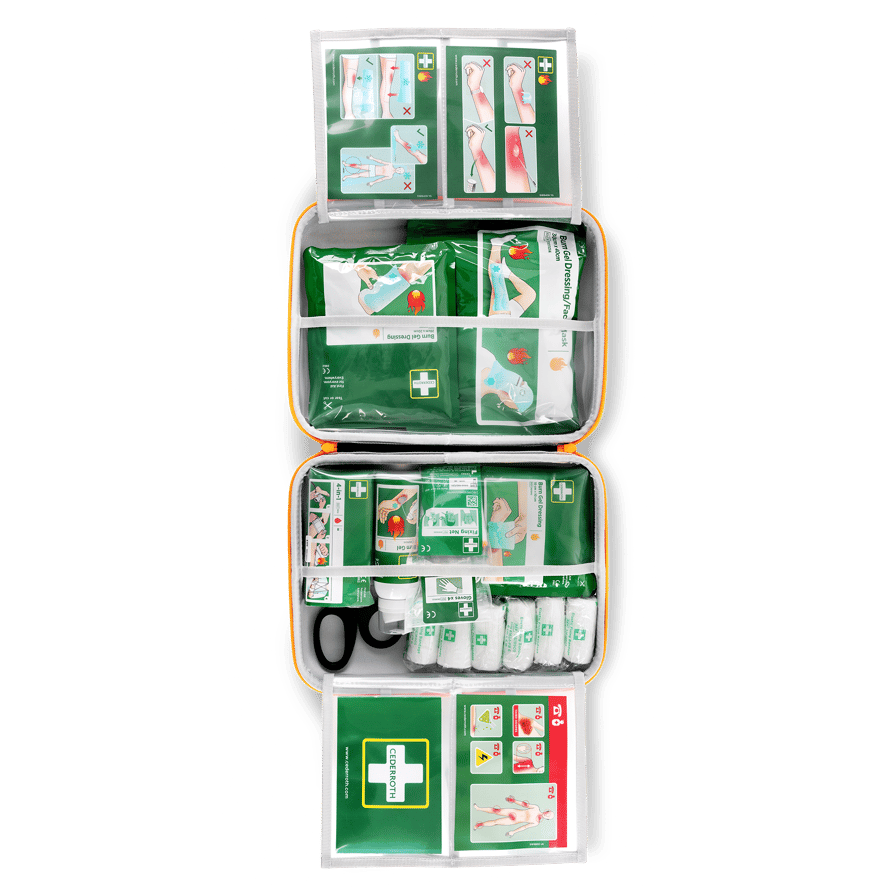 A mobile First Aid Kit with products for handling burns. Burn Gel products provide cooling and pain relief for first and second degree burns. The Burn Gel Dressings come in 3 sizes including a large dressing/face mask 30x40 cm. Easy to use with clear instructions. Case with practical handle. Highly visible with a printed flame symbol and an orange zip. Transparent fold-out plastic pockets provide a clear overview of the contents. Suitable for workplaces with high risk of burns, that handles open fire, flames, hot surfaces, steam, hot fluids and ovens. For example, workplaces in the Construction, Paper, Metal, Chemical and Food industries, but also in the Horeca industry. Contents: 1 x Burn Gel 100 ml (REF 51011005), 1 x Burn Gel Dressing/Face Mask 30x40 cm (REF 51011014), 2 x Burn Gel Dressings 20x20 cm (REF 51011015), 4 x Burn Gel Dressings 10x10 cm (REF 901900), 1 x Cederroth 4-in-1 Bloodstopper (REF 1910), 1 x Fastening Net, 6 x Elastic Fixing Bandages, 2 pairs of Gloves, 1 x Scissors (REF 270002), First Aid and burn injury instructions.
