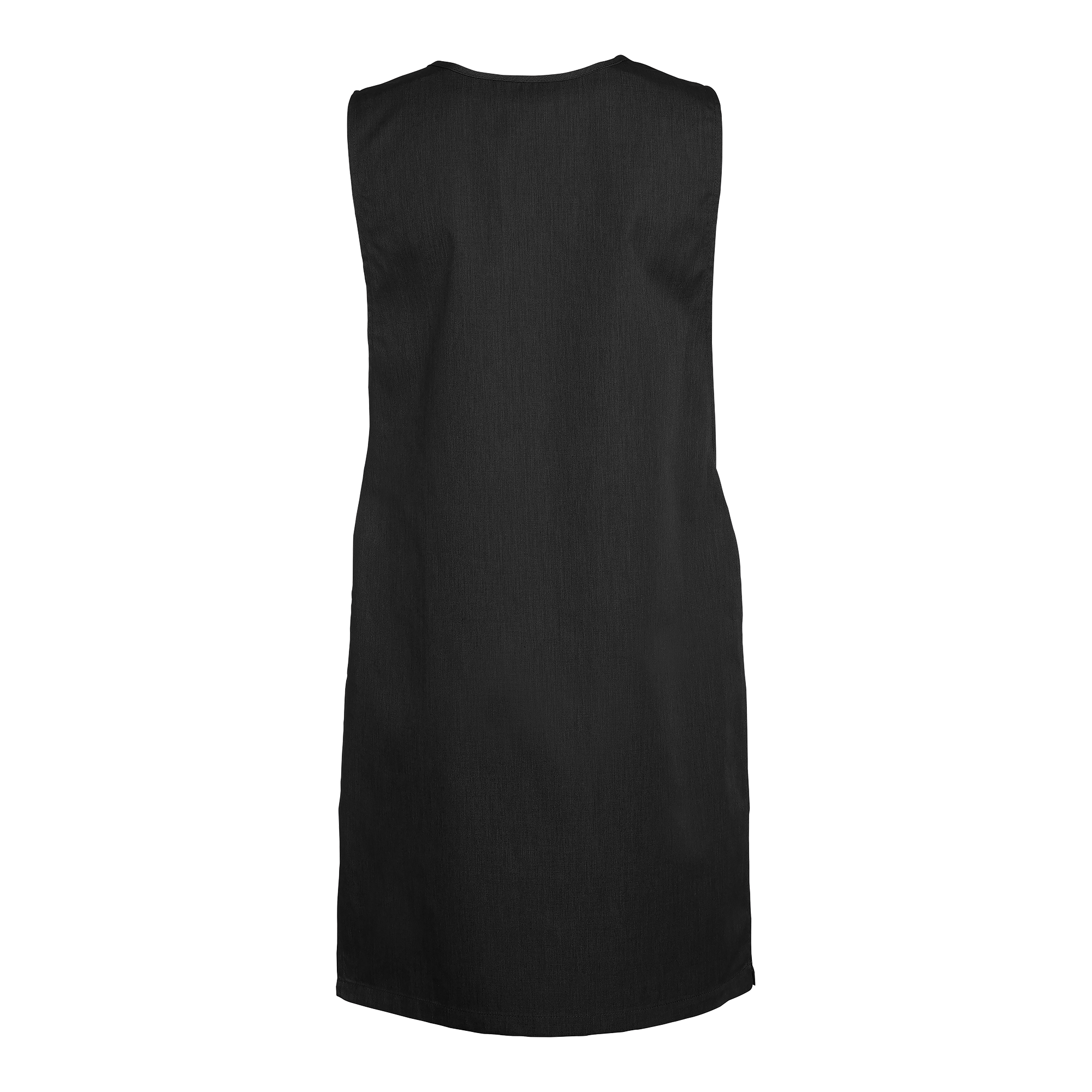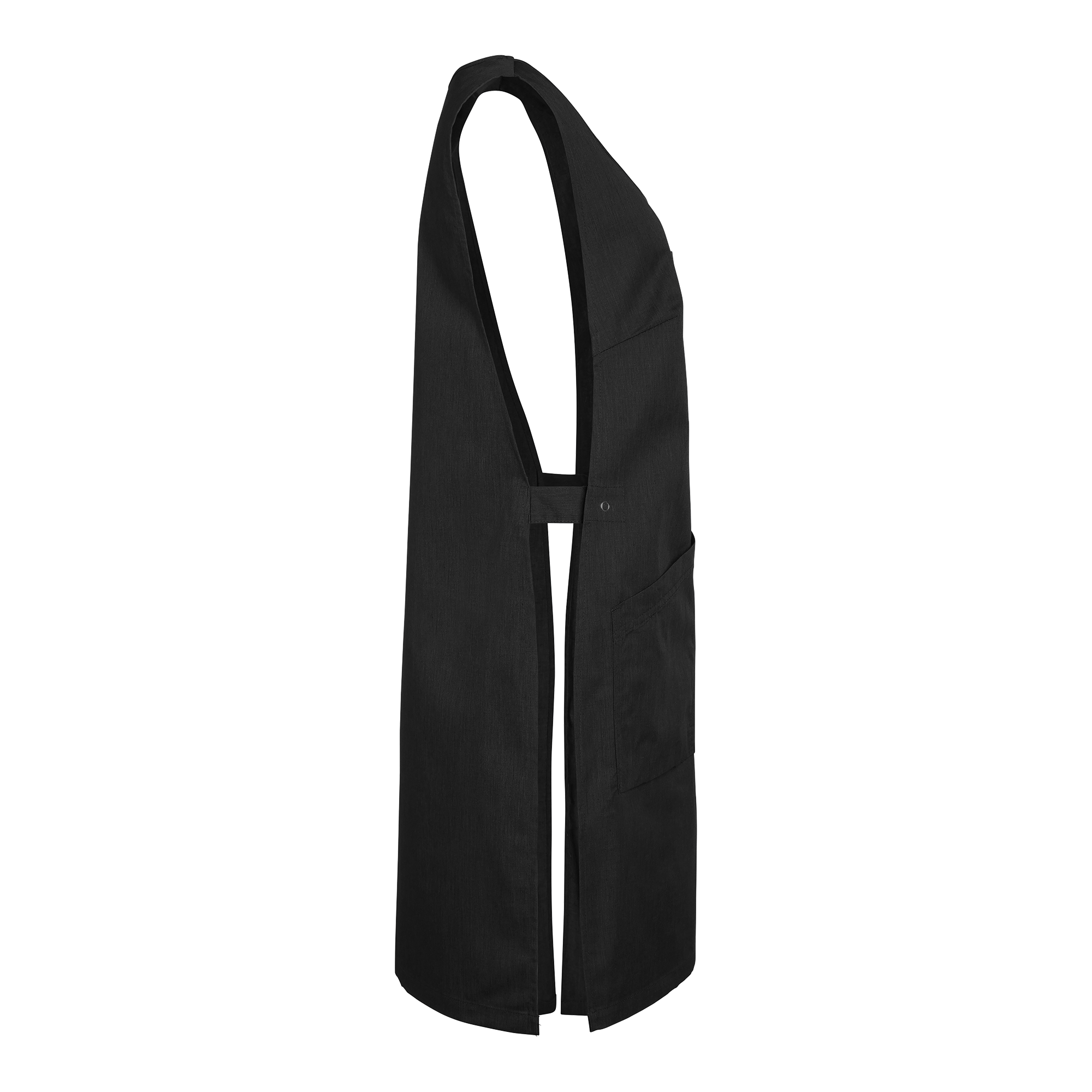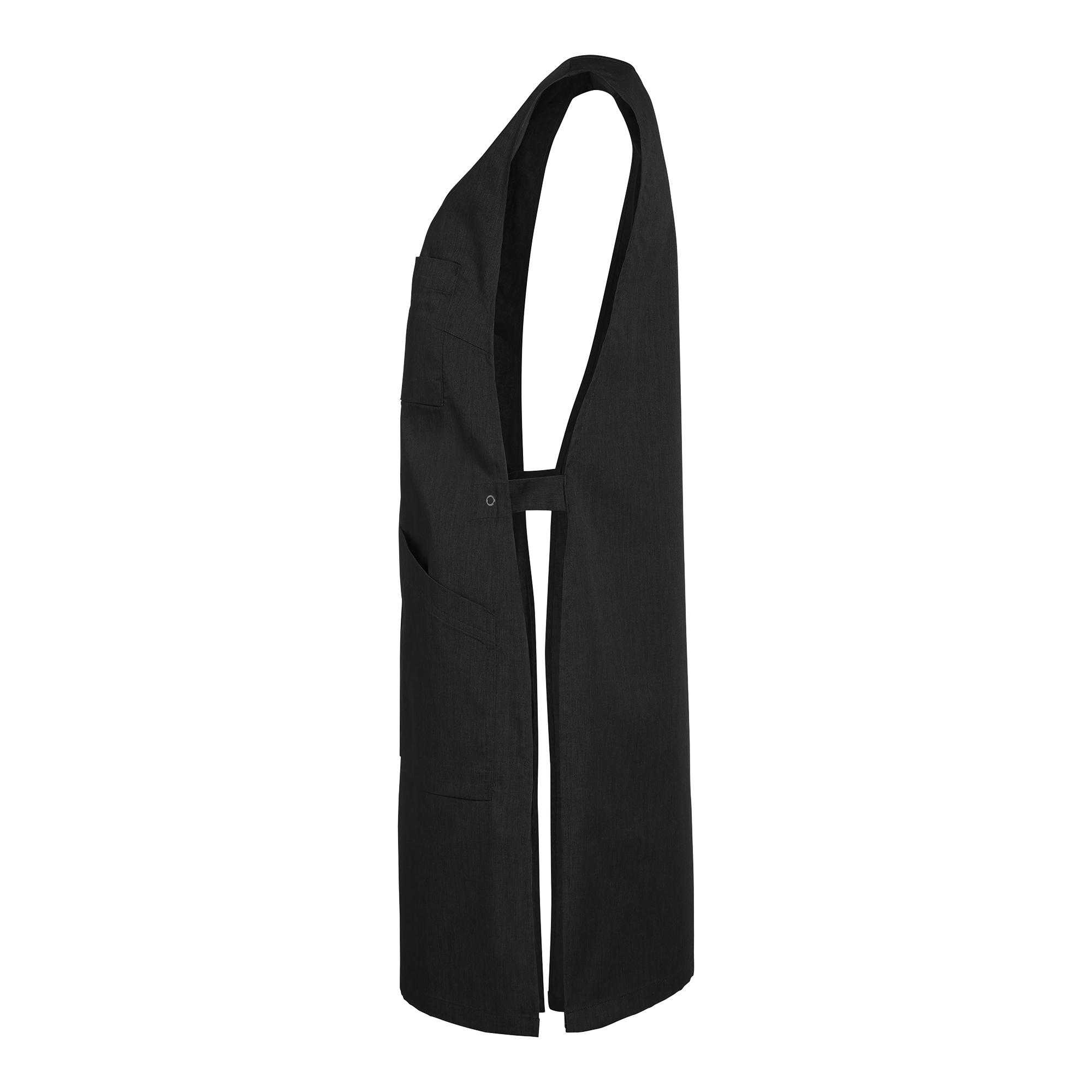 Lightweight fitted apron with two slanted front pockets, one with key holder and cell phone pocket. Equipped with chest pocket and side darts with ring button.