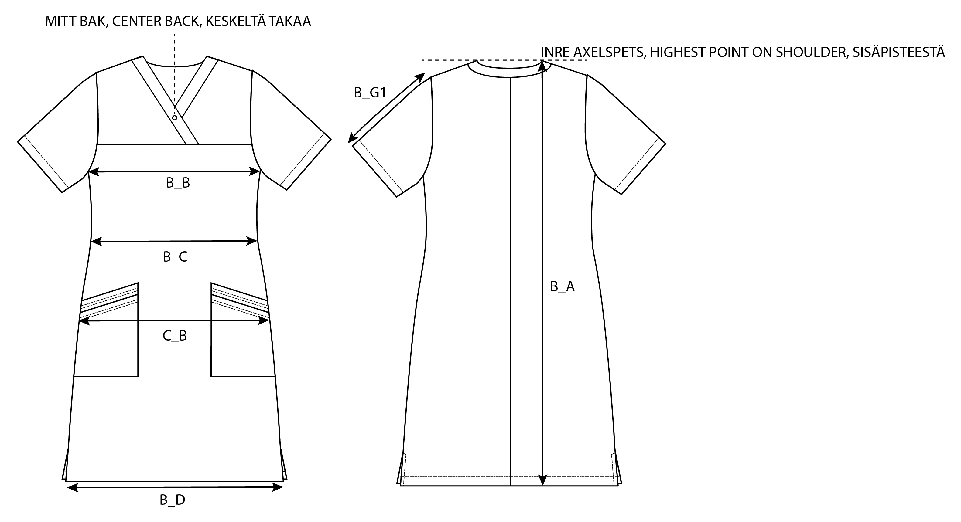 Lightweight wrap dress with V-neck and ring button. Equipped with double slanted front pockets including key/card holder and breast pocket.