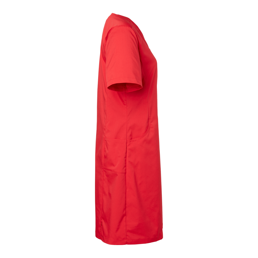 Lovi Dress is a modern V-neck dress with a contoured princess cut and lightly fitted waist for a feminine silhouette. Practical front pockets, phone pocket, key holder, and chest pocket. Side panels with extra pockets and a back slit provide increased freedom of movement.