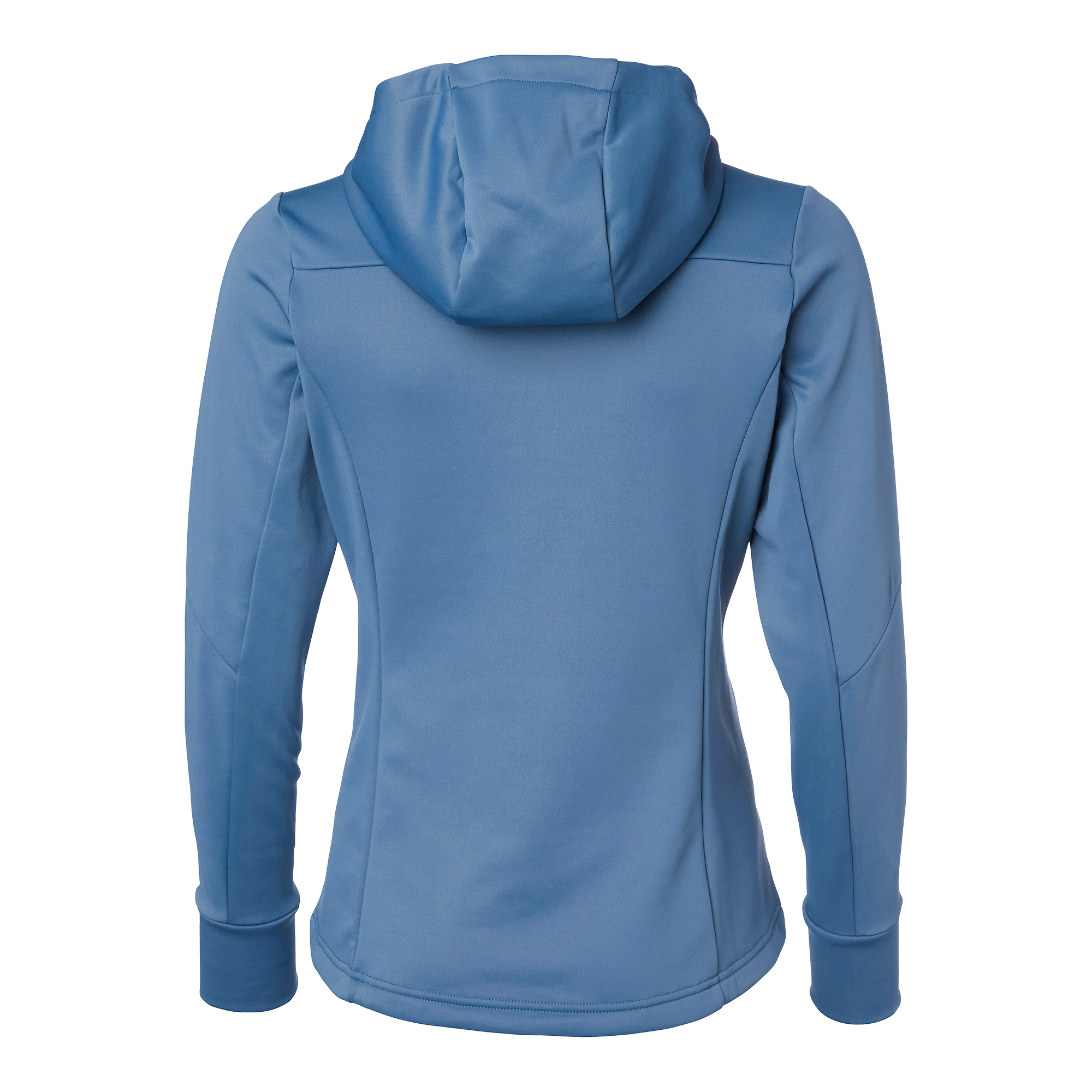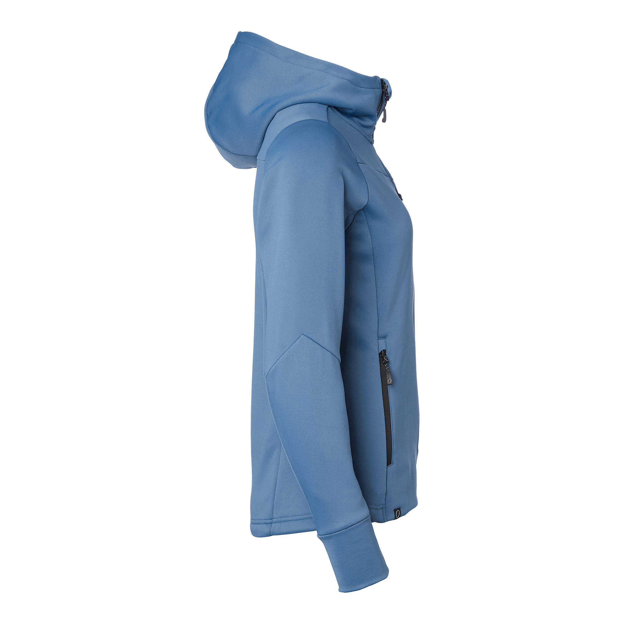 Soft and functional powerfleece with fleece lining. Features a hood with high collar and angled yoke. Zippered chest pocket and two side pockets. High cuffs and adjustable hem with elastic drawstring.