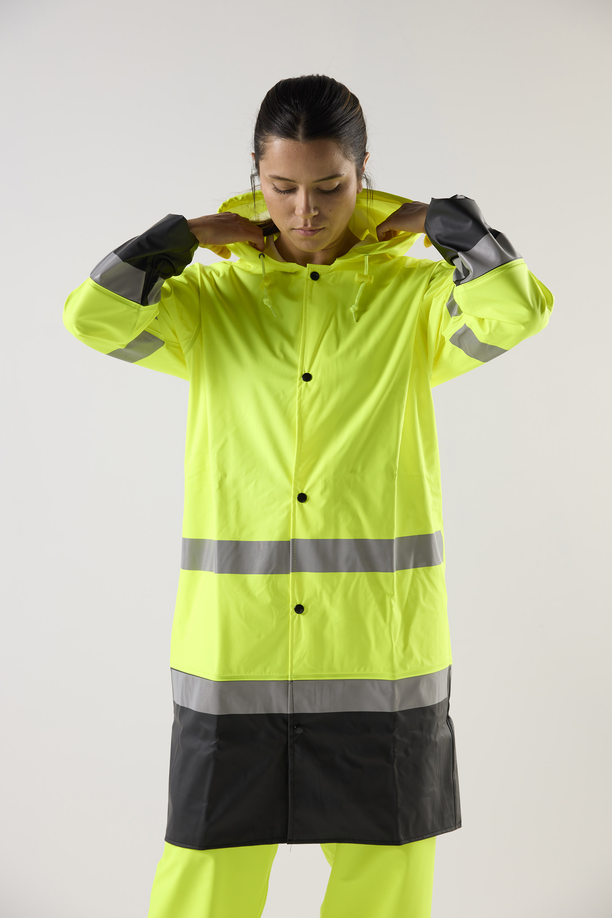 Raincoat in stretch material with welded seams. Zipper with punch and press studs. Hood with drawstring, adjustable cuffs. Length 100 cm for extra protection.
