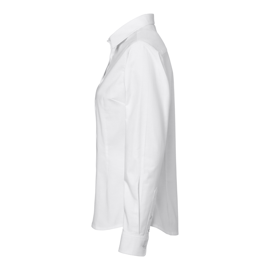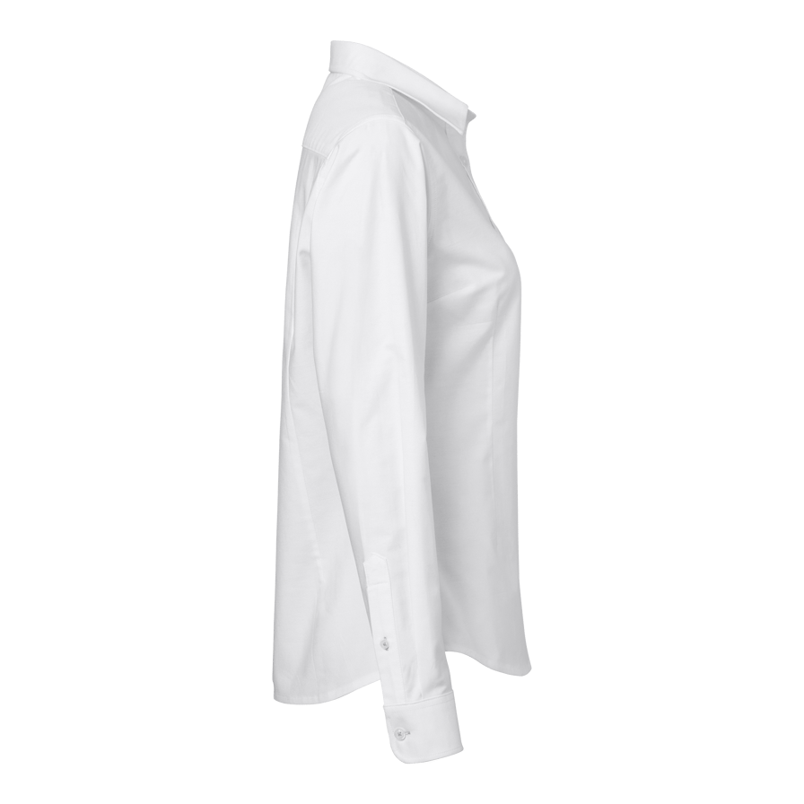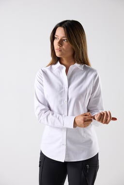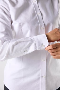 Aline is a long-sleeved, slim-fit women’s shirt made from 100% GOTS-certified cotton. It features a turn-down collar, front placket, and a slightly curved hem that’s longer at the back. Perfect for everyday wear, work, or more festive occasions.