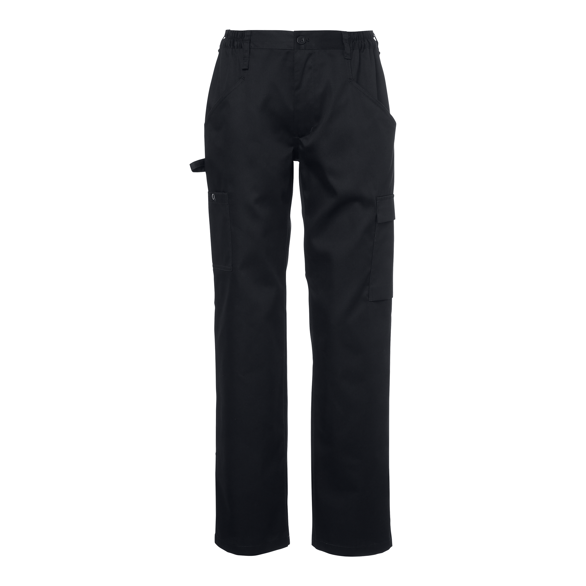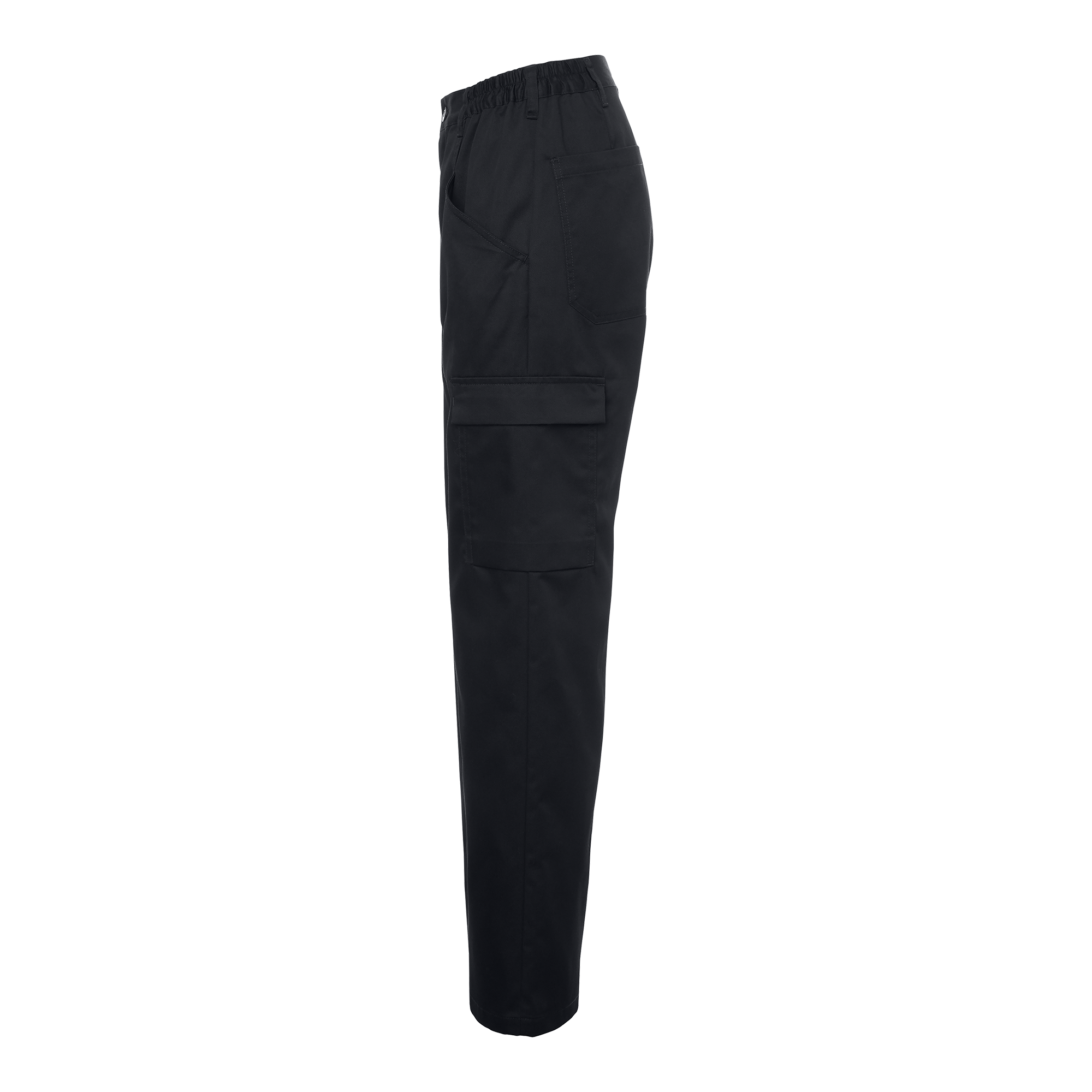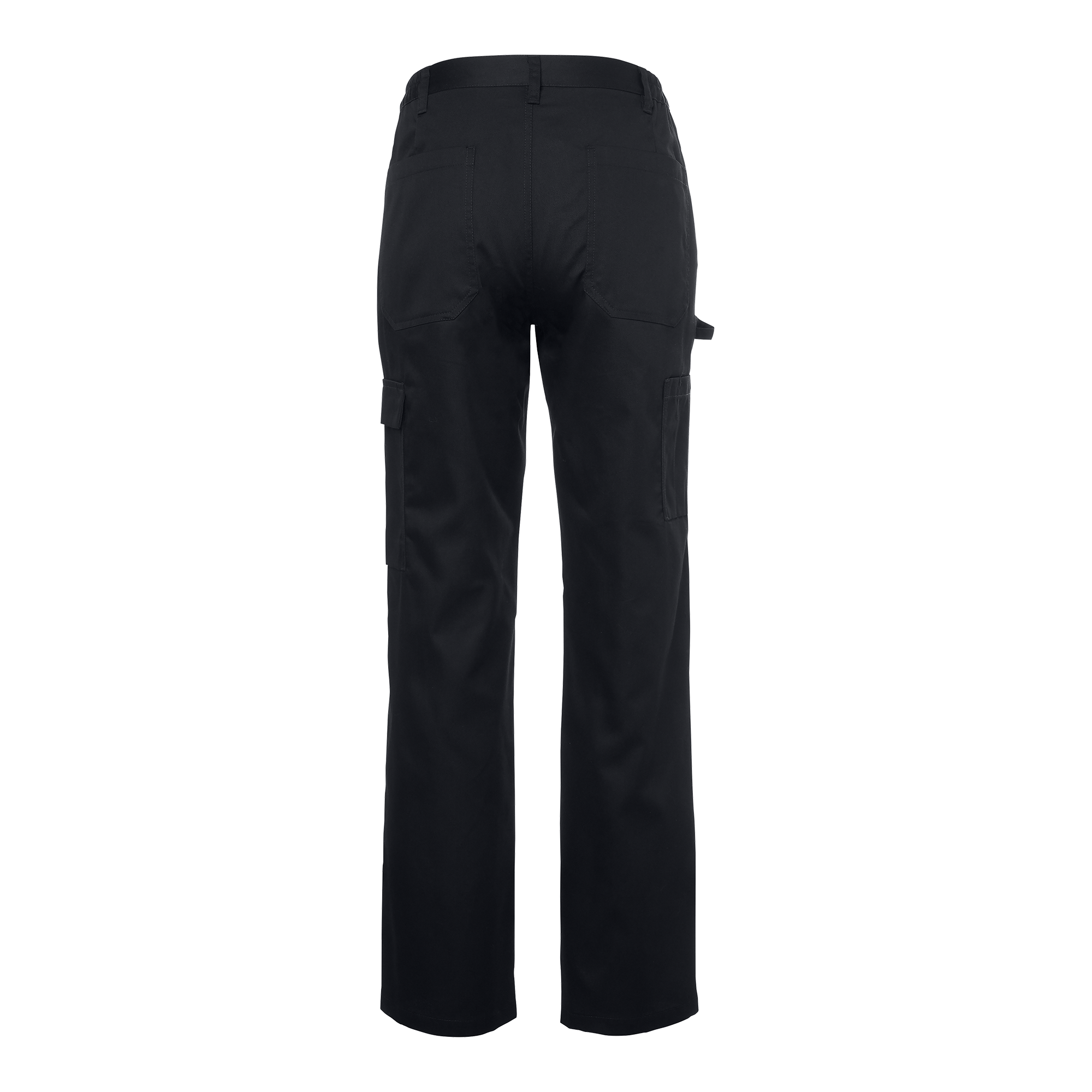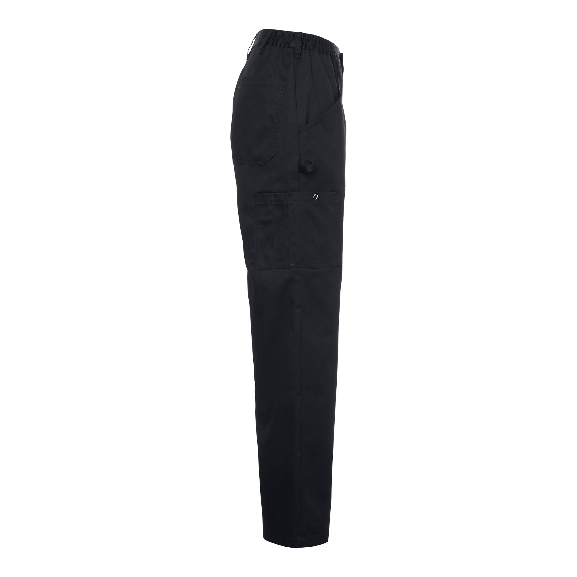 Elva Chef’s Trousers w are a classic women’s model with a fixed waistband and elastic sides. The chef’s trousers feature slanted front pockets, back pockets, and leg pockets. The right leg pocket has a tweezer loop, and the left leg pocket has a flap. The trousers have an extra-wide hem to allow for extending the leg length by 5 cm.