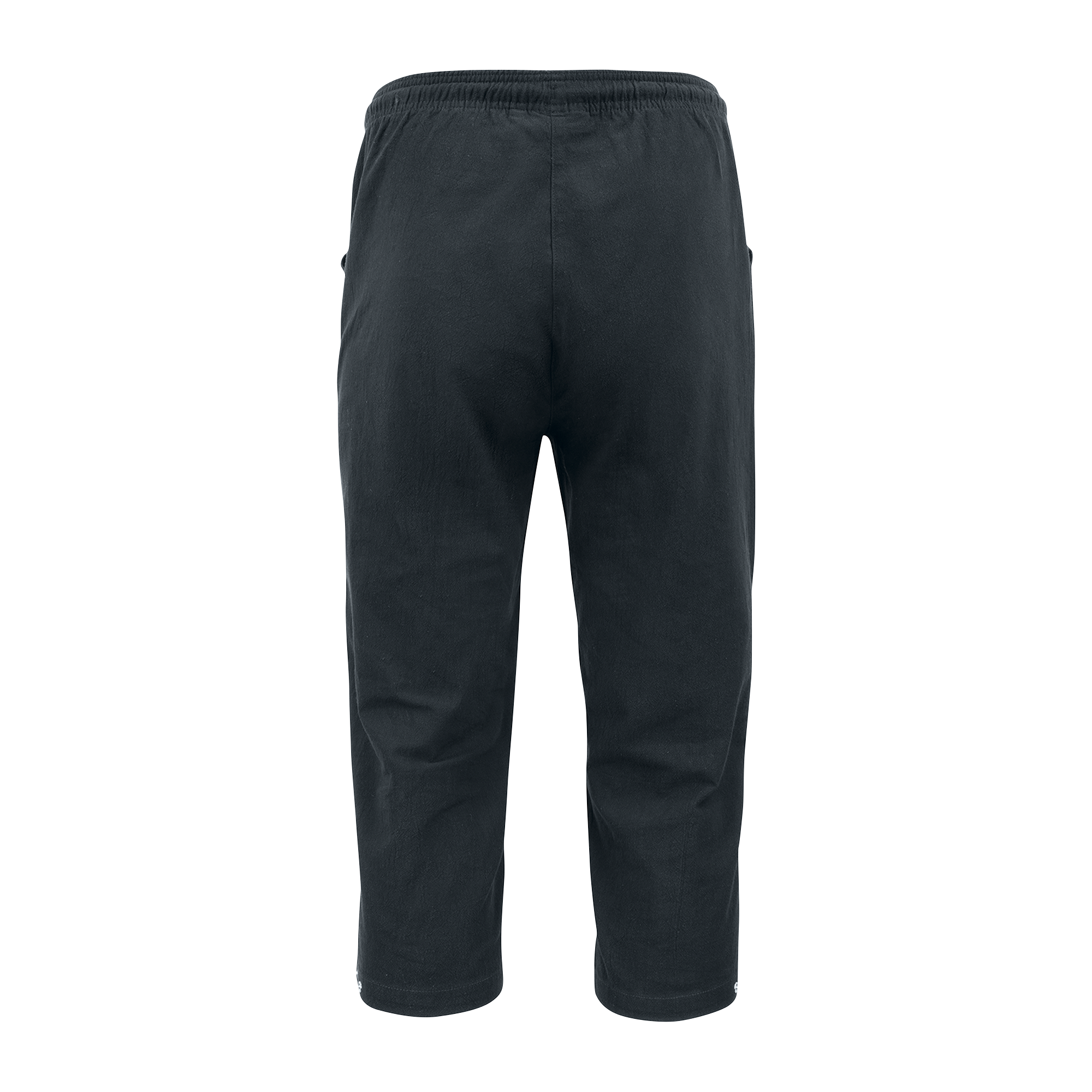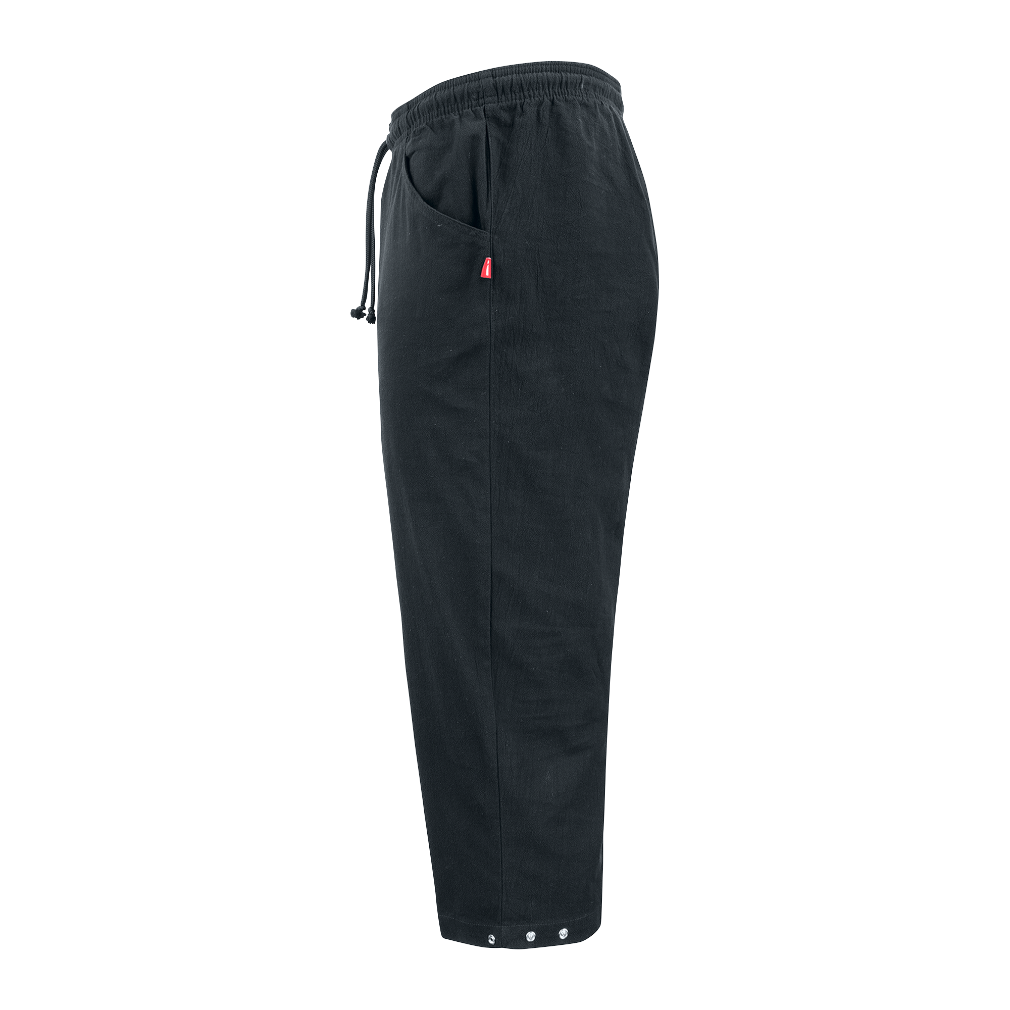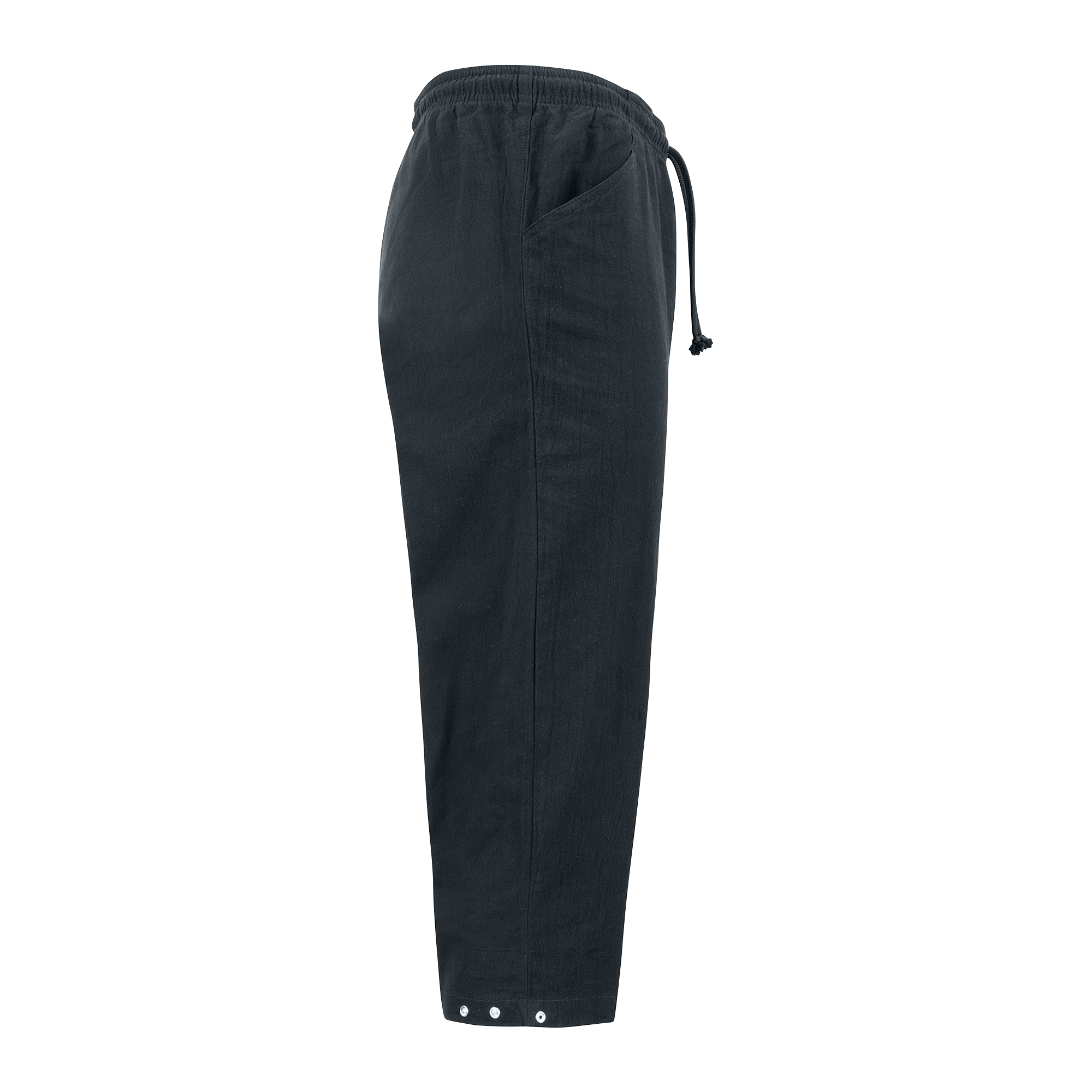 Unisex capri pants with elastic and drawstring waist. Equipped with spacious front pockets and adjustable foot width with ring snap. Crinkled cotton.