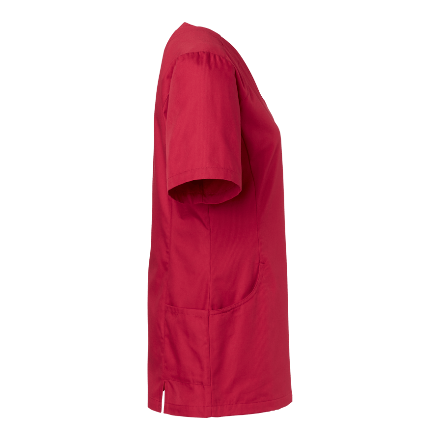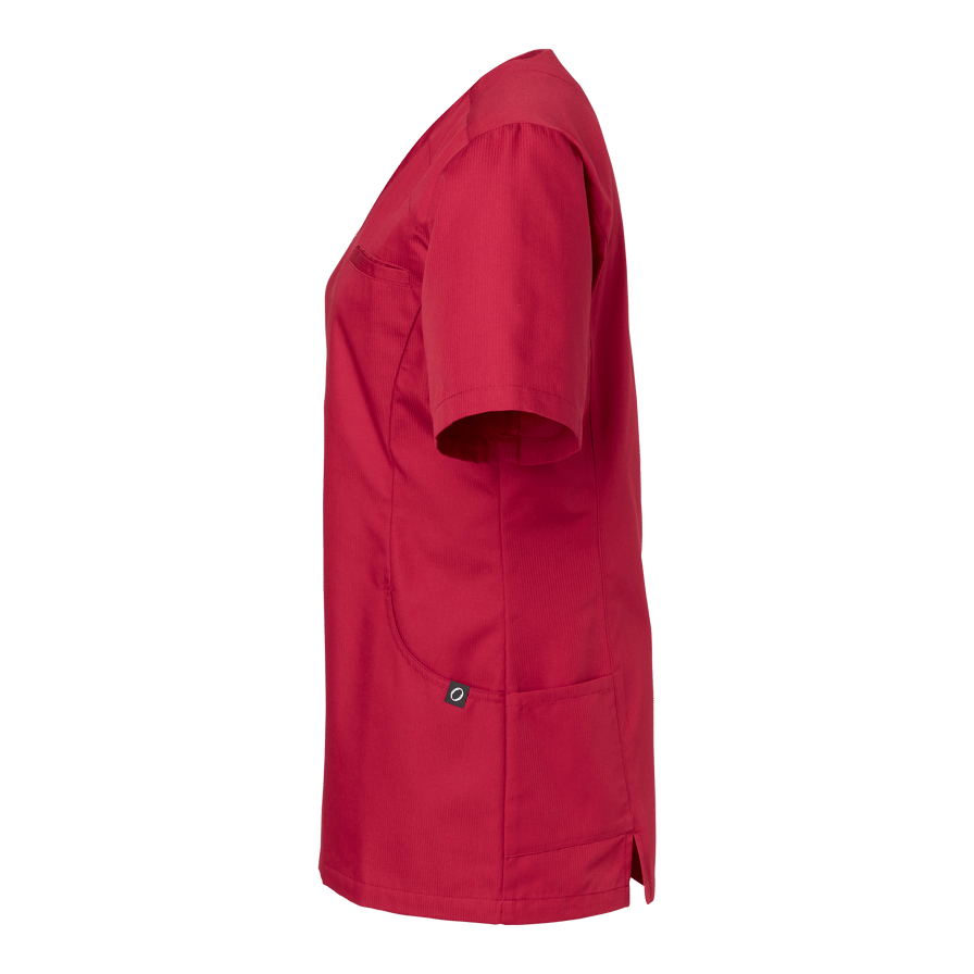 Amie Blouse W is a modern V-neck women's blouse with princess seams and a lightly shaped waist for a feminine fit. Features spacious front pockets, mobile phone pocket, key ring, and chest pocket. Side panels with extra pockets and a back slit offer greater freedom of movement during work.